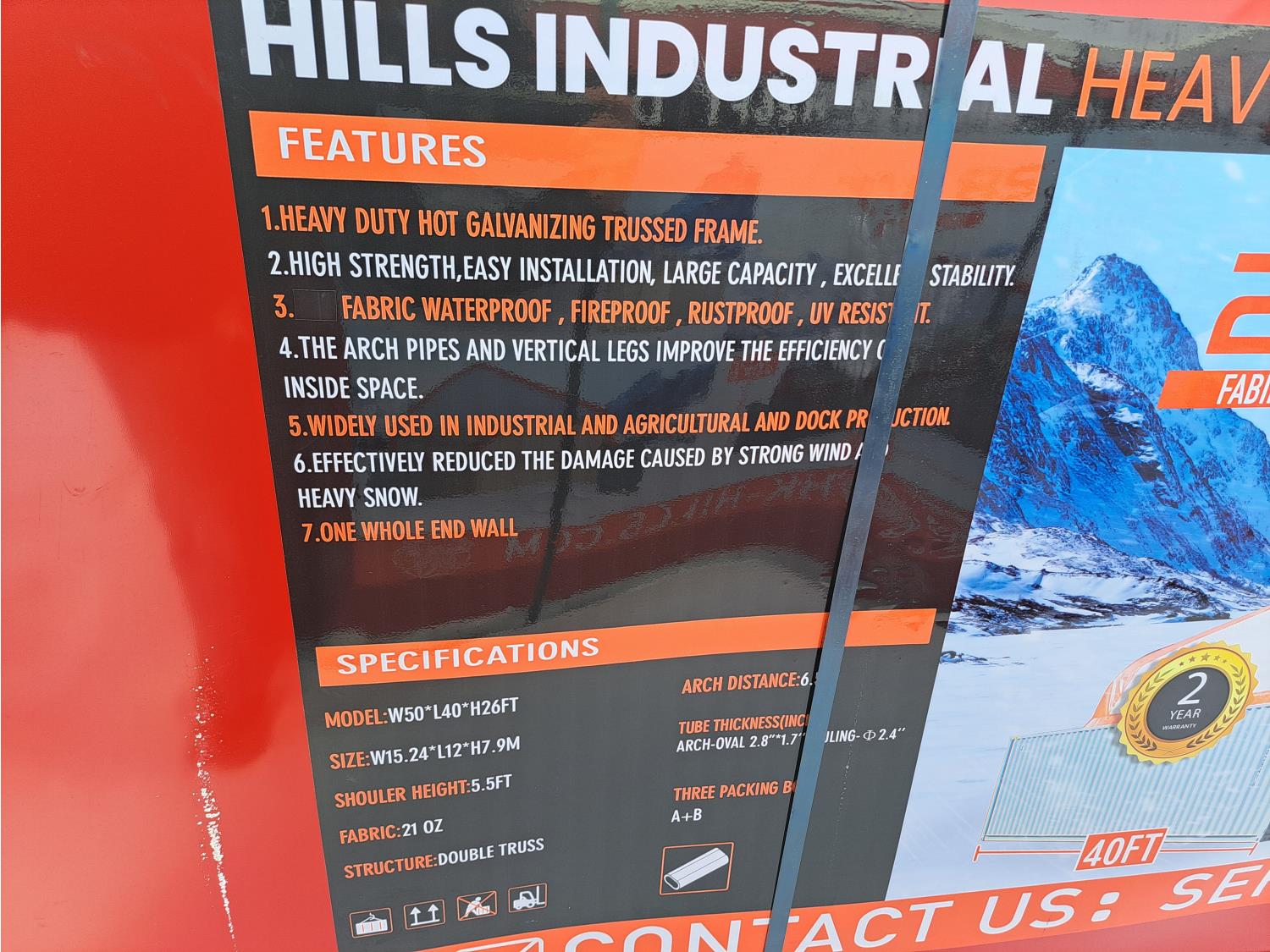 double truss, 21 oz PVC fabric, 10 ft truss spacing, 2.4 inch tubing, peak ceiling, appx weight of package 2450 kg