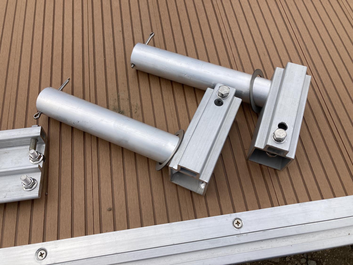 2 Adjustable legs with foot pads, 2 steel connectors, deep water adaptor kit, dock wheel adaptor kit, leg pocket adaptor kit (2 pocket adaptors, 4 support brackets, 10 bolts/nuts per kit), dock accessory bracket x 2 per kit