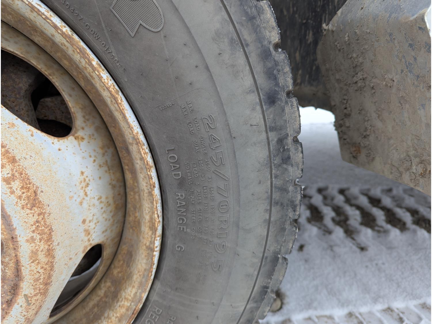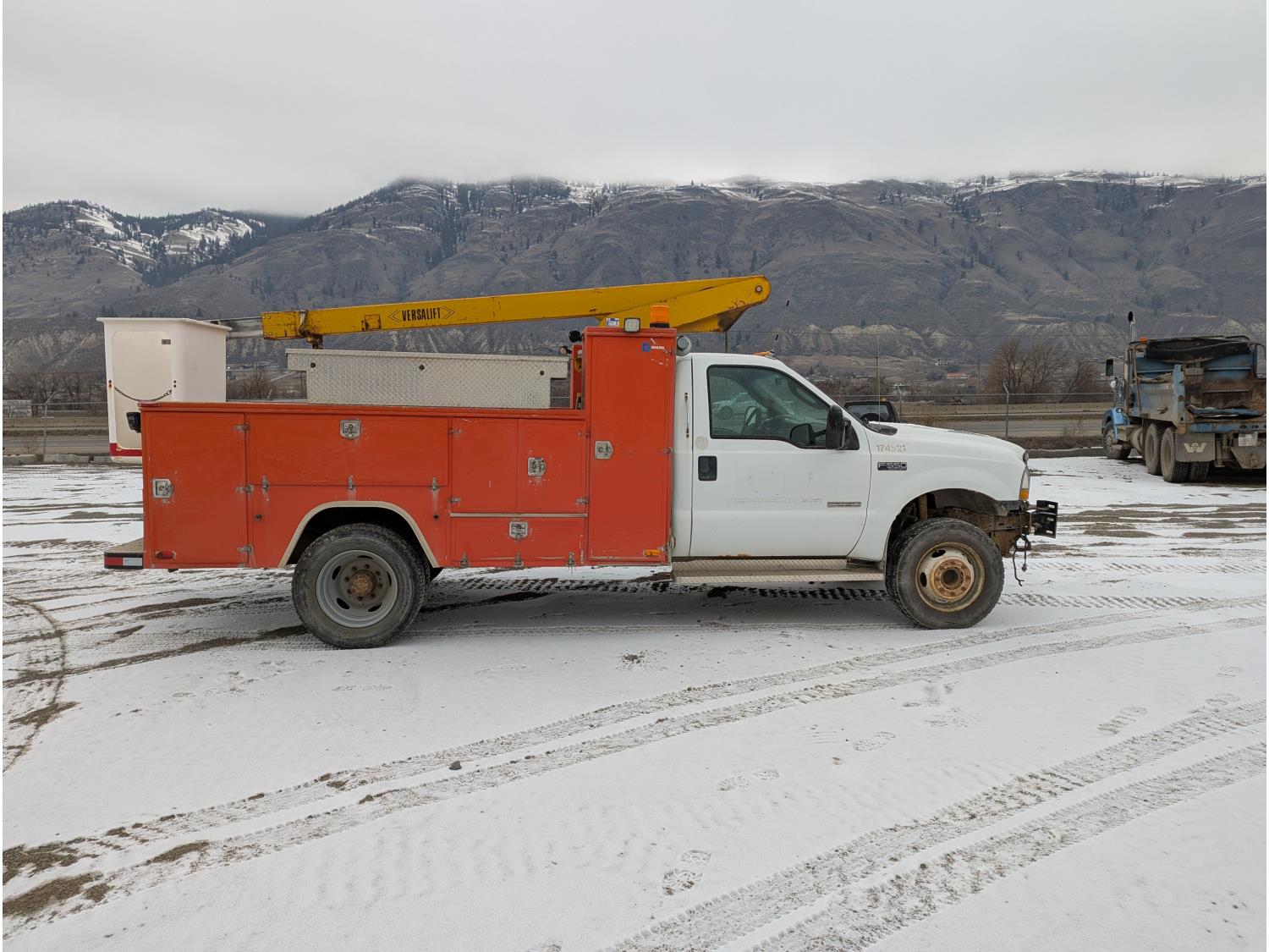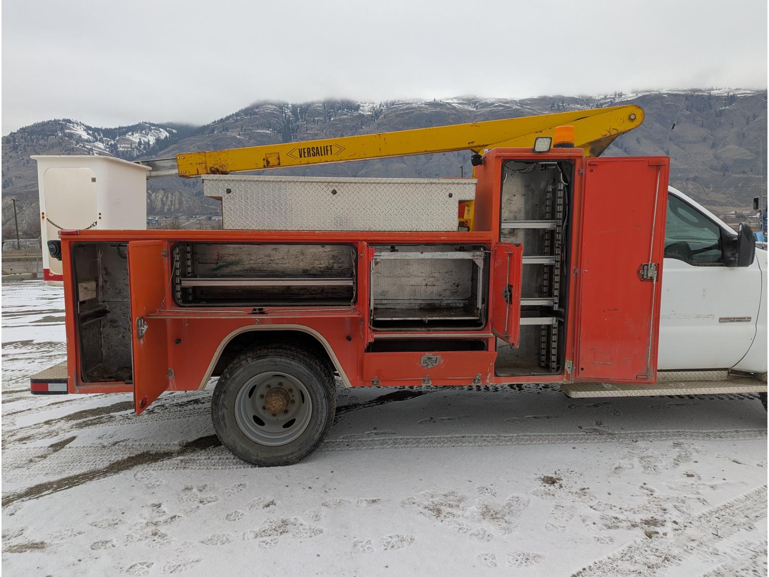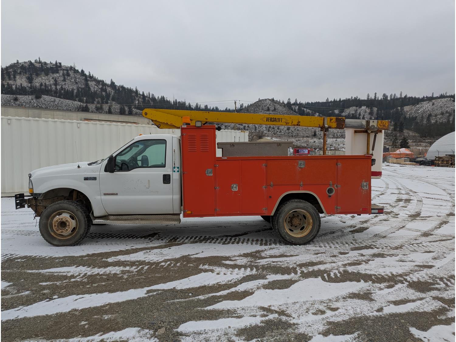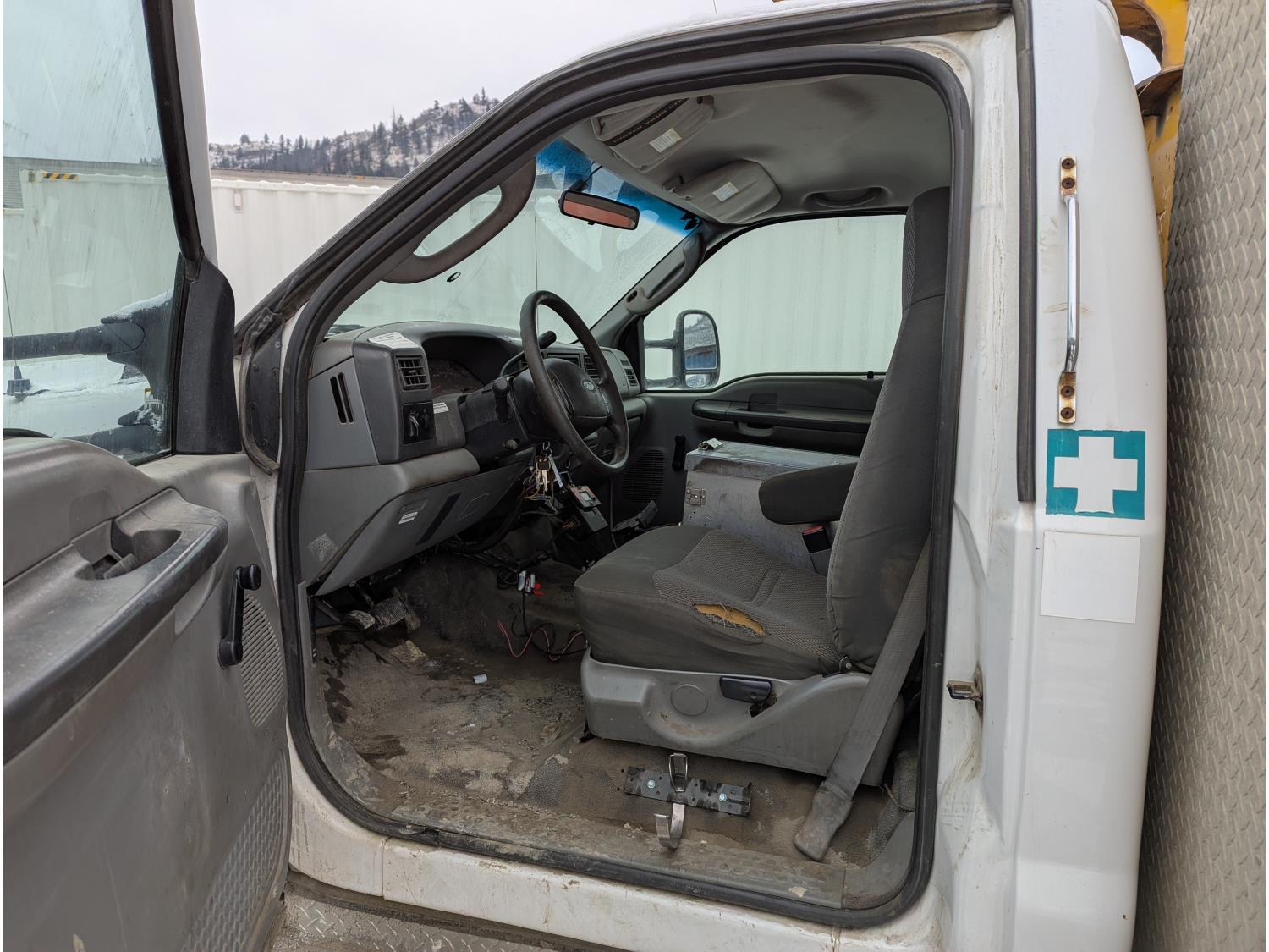 Ford POWER STROKE 6.0 L V8 diesel engine, running boards, aluminum tool boxes, Aluminium Service Box, Starts and runs, Moves forward and backward, stops, bucket is functional, 245/70R19.5 tires