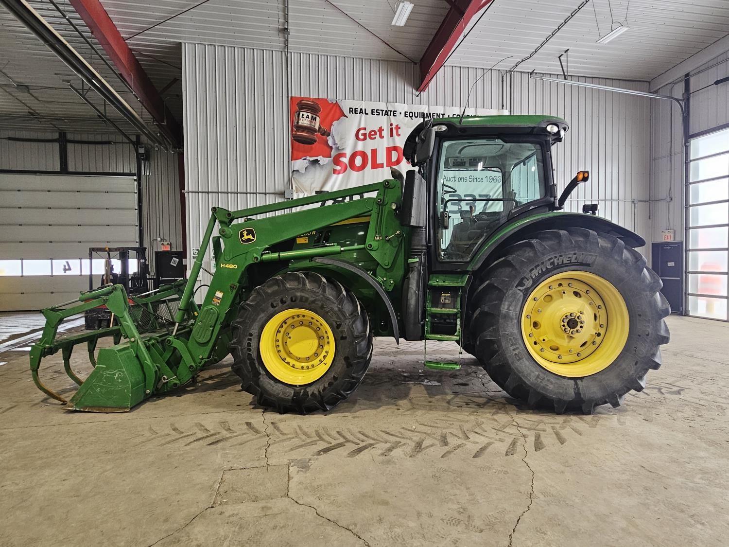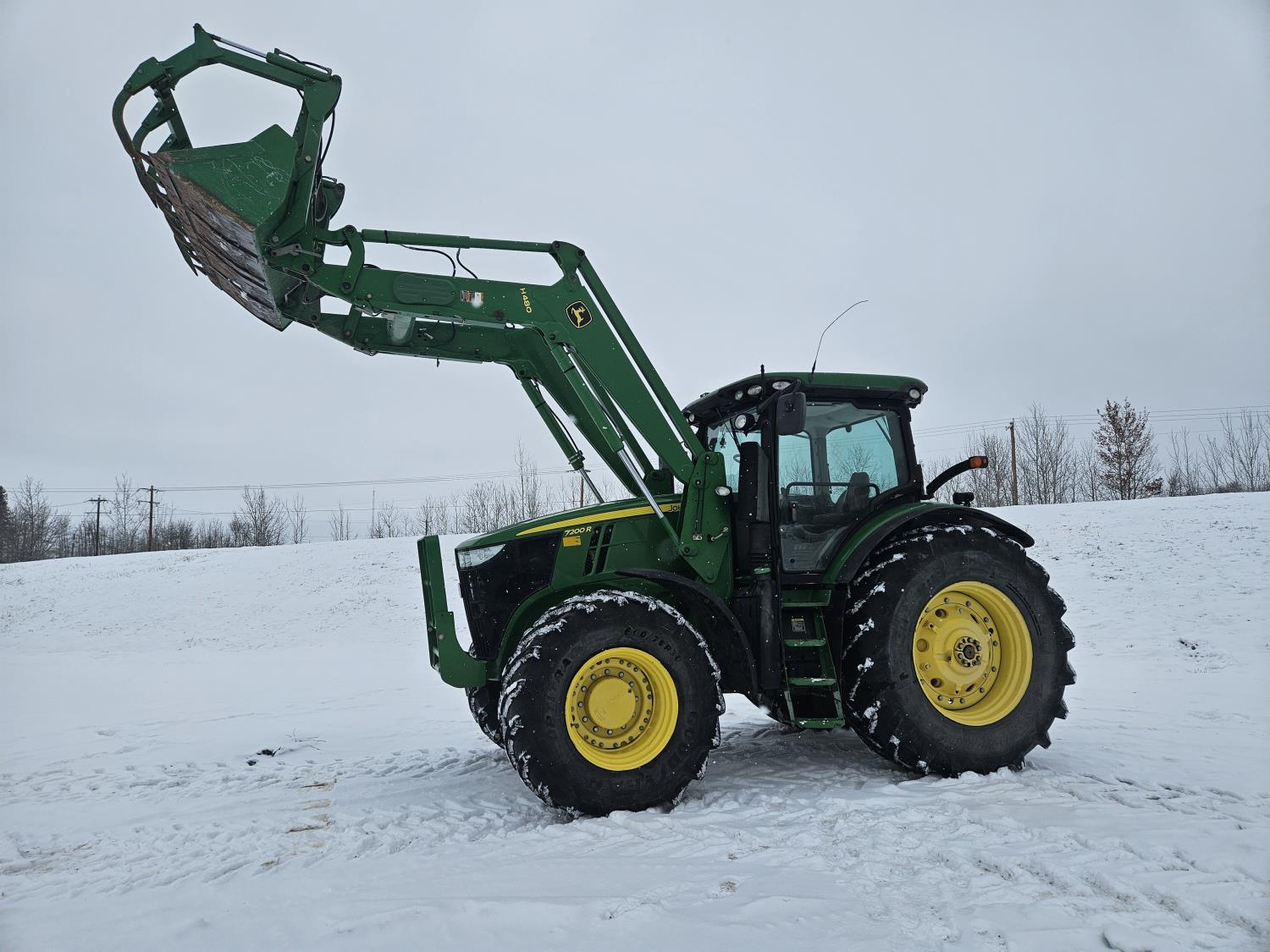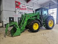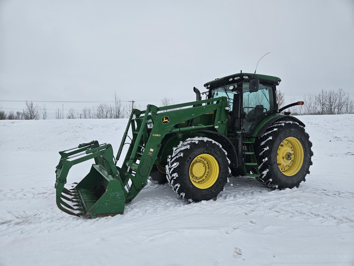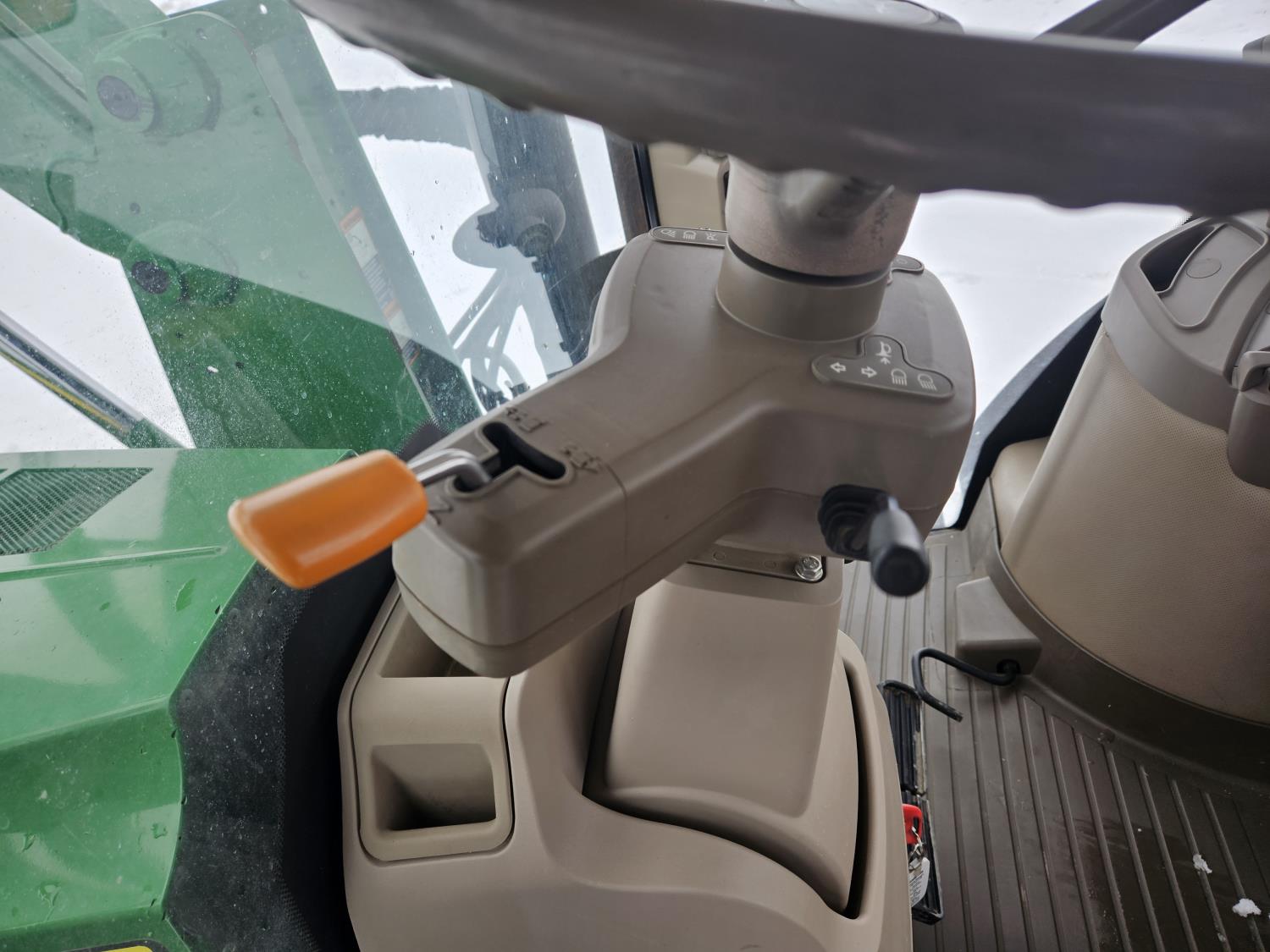 John Deere H480 loader, 96 inch Q/A bucket, grapple, joystick, 6.8 L 6 cylinder 200 HP, diesel engine, DEF required, 20 speed power shift transmission, left hand reverser, cab, A/C, radio, buddy seat, Integrated GPS, Green Star 3, 540/1000 PTO, 3 rear hydraulic outlets, 600/70R30 front tires, front fenders,, 710/70R42 rear tires, rear wheel weights