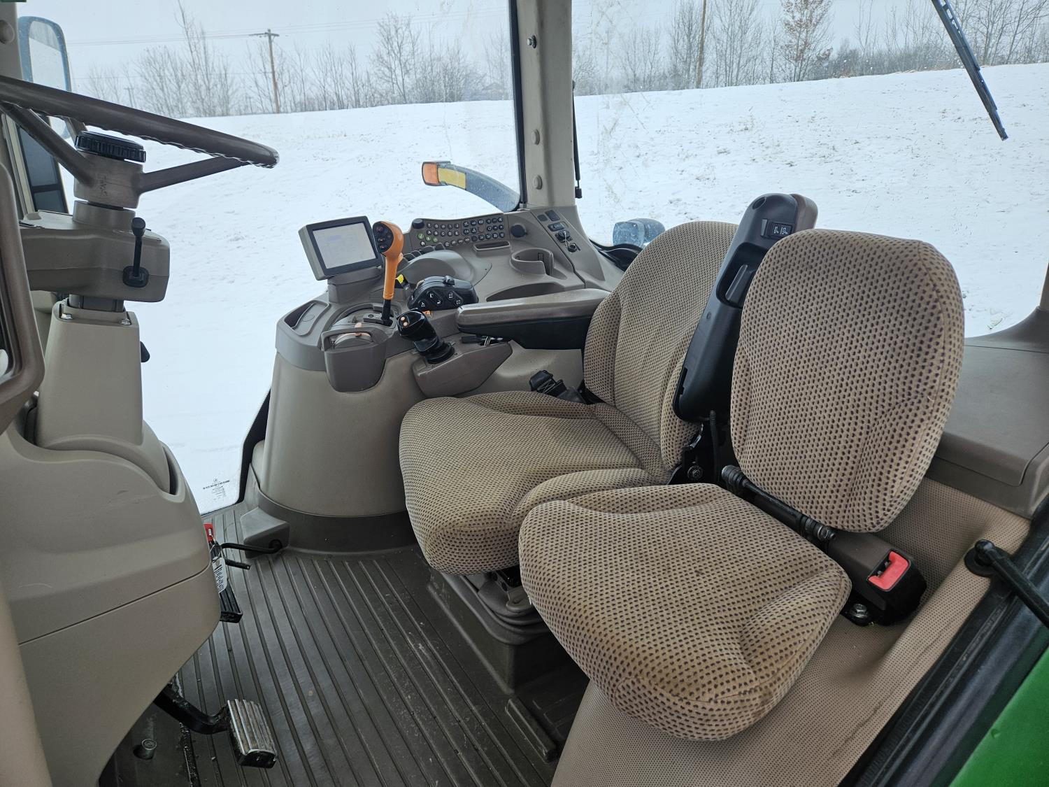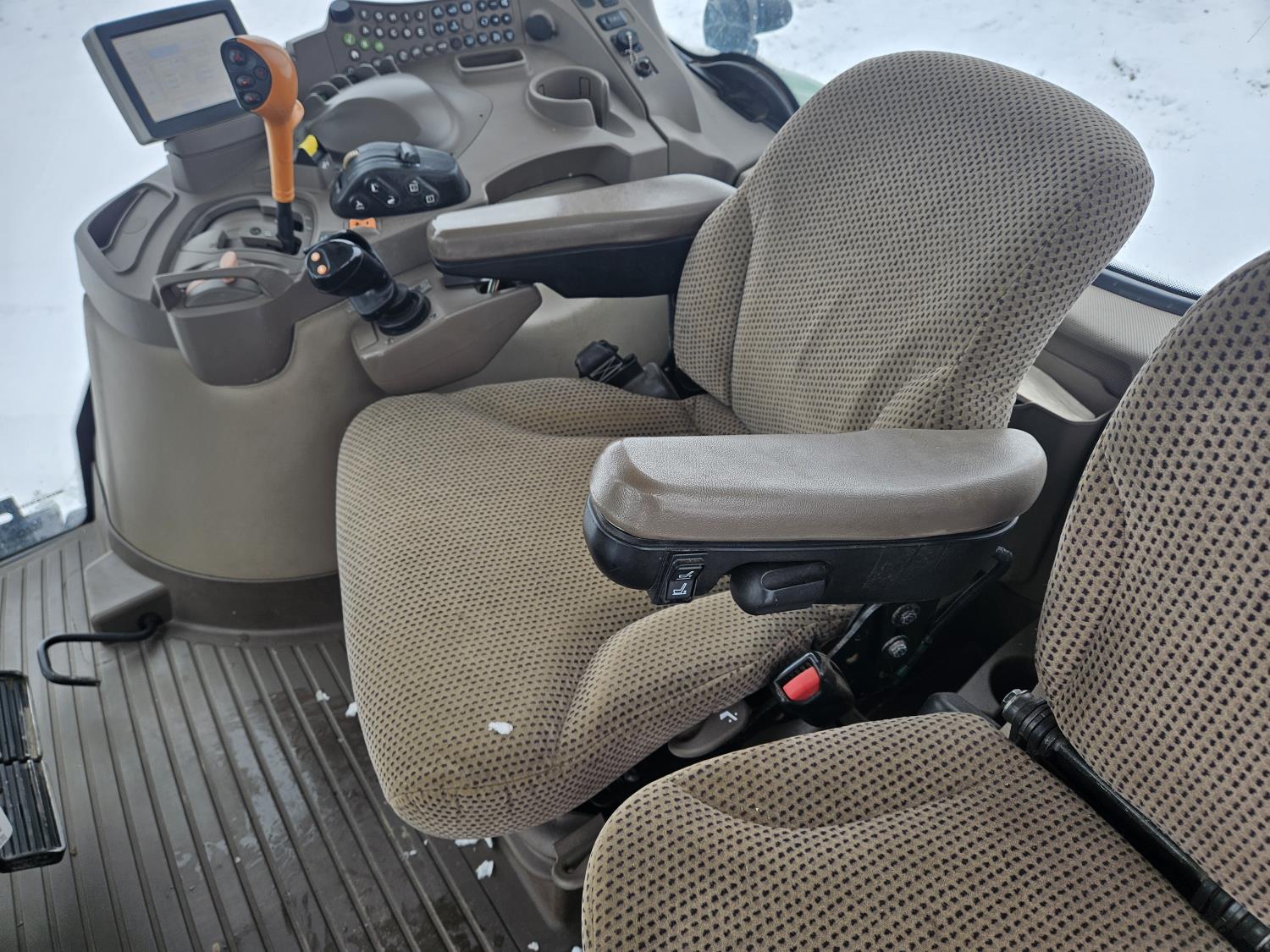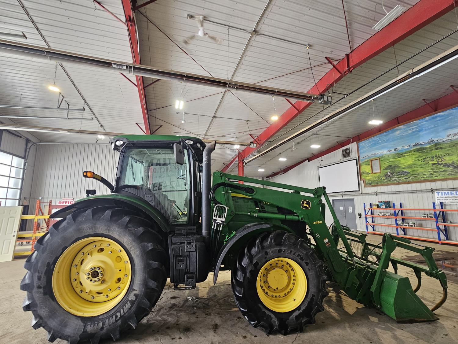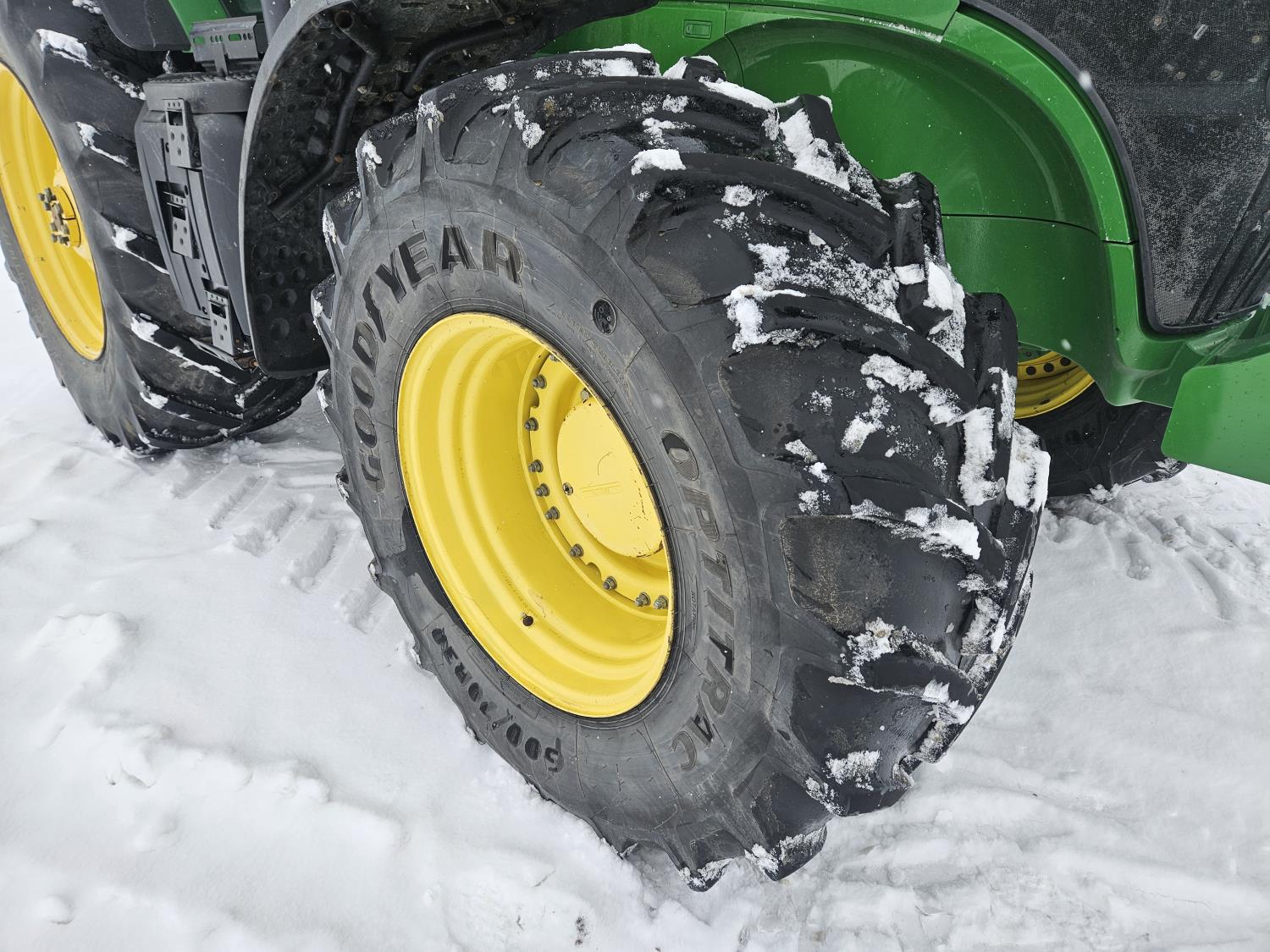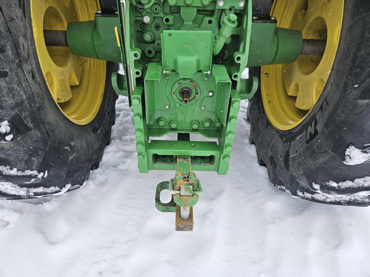 John Deere H480 loader, 96 inch Q/A bucket, grapple, joystick, 6.8 L 6 cylinder 200 HP, diesel engine, DEF required, 20 speed power shift transmission, left hand reverser, cab, A/C, radio, buddy seat, Integrated GPS, Green Star 3, 540/1000 PTO, 3 rear hydraulic outlets, 600/70R30 front tires, front fenders,, 710/70R42 rear tires, rear wheel weights