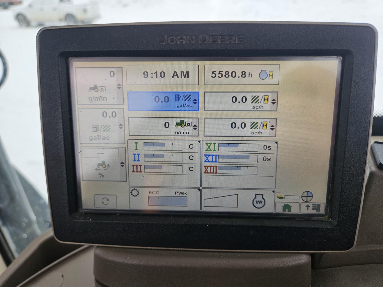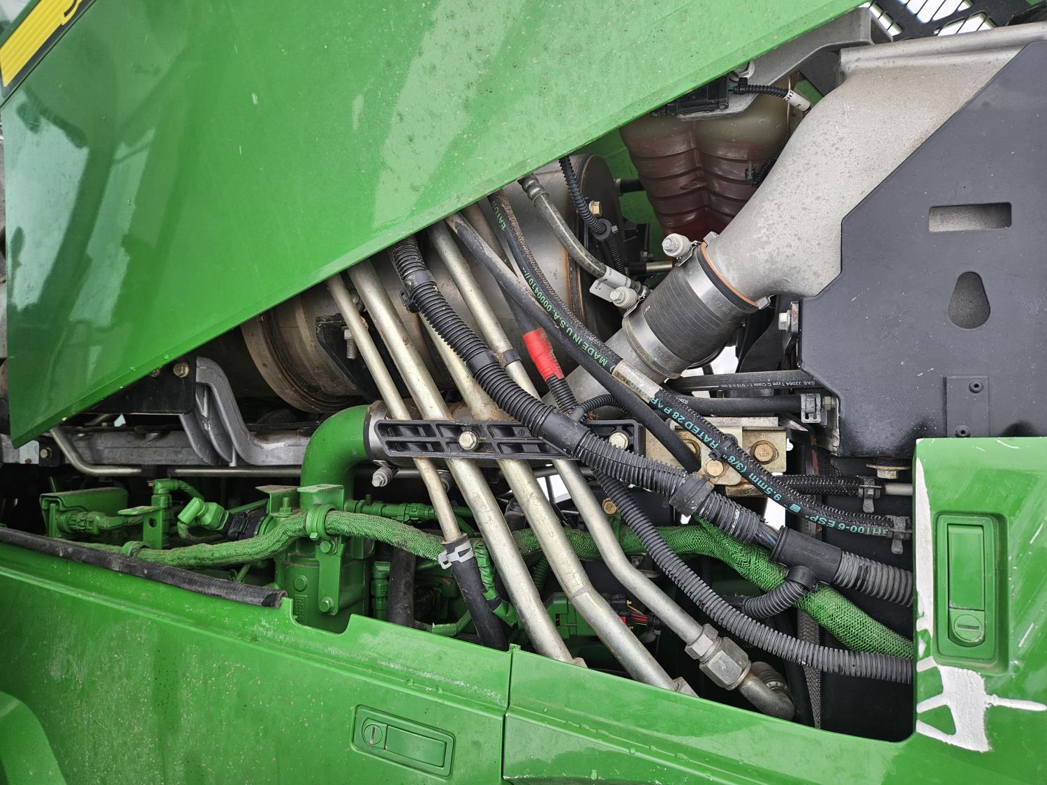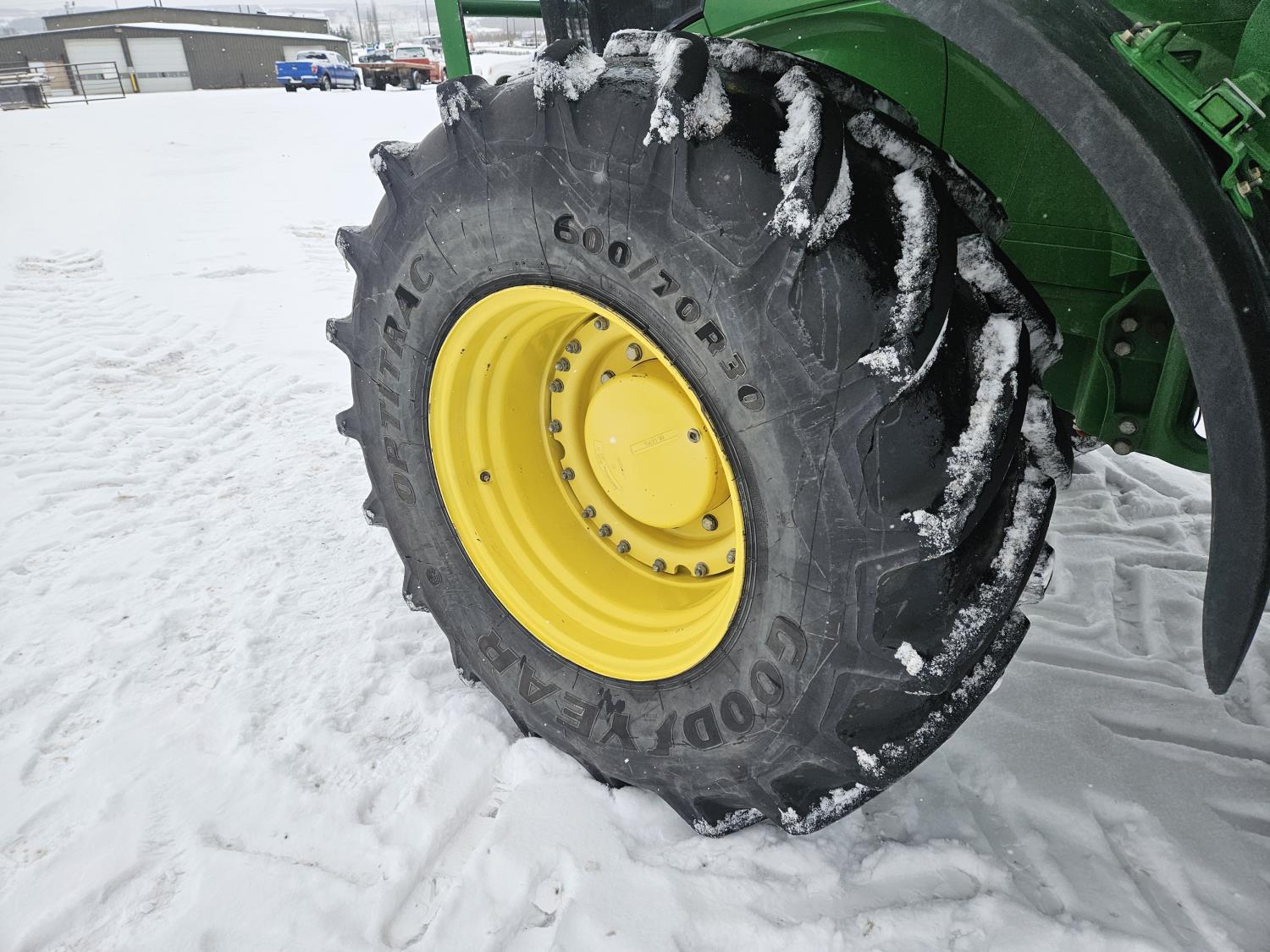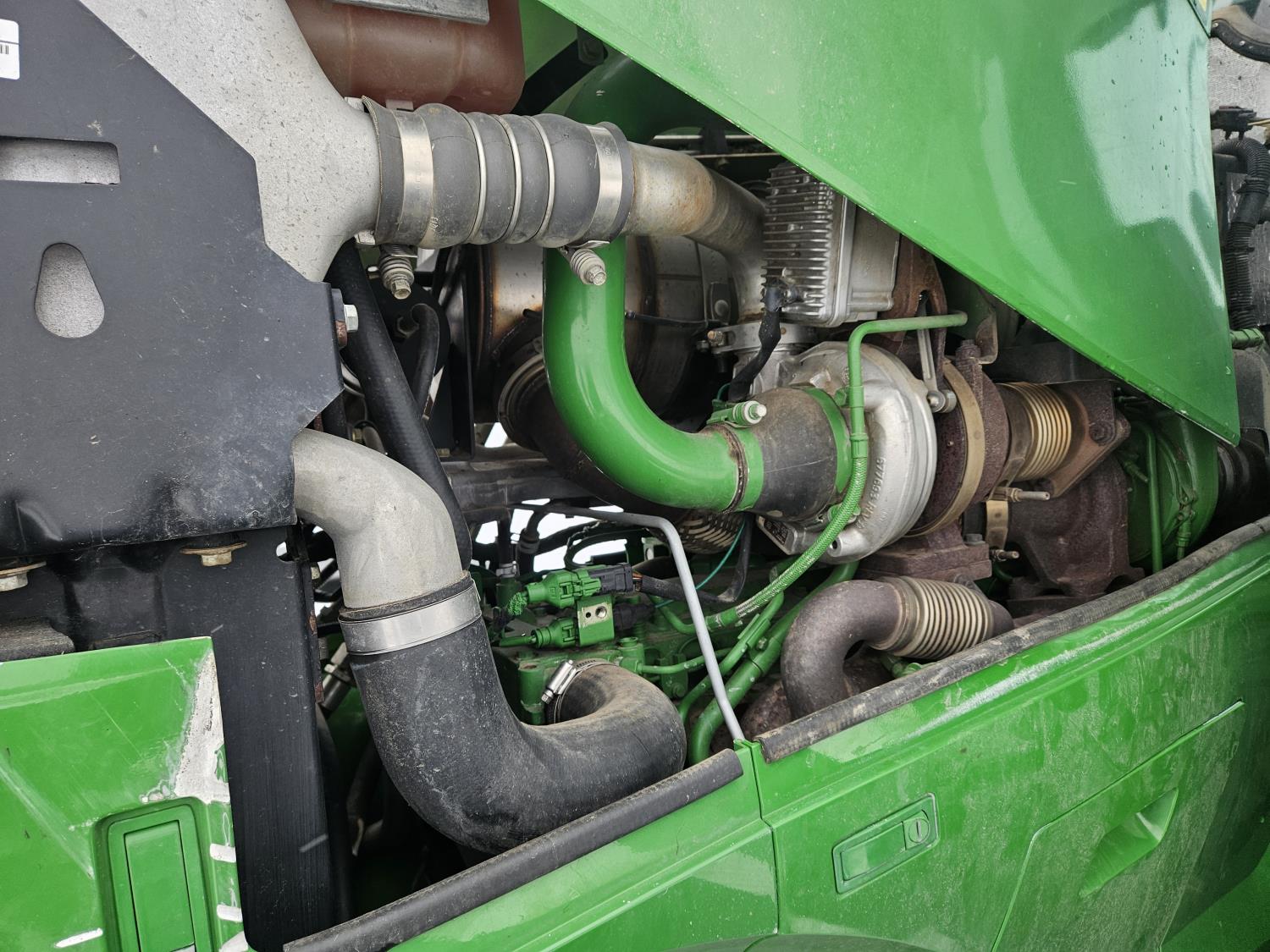 John Deere H480 loader, 96 inch Q/A bucket, grapple, joystick, 6.8 L 6 cylinder 200 HP, diesel engine, DEF required, 20 speed power shift transmission, left hand reverser, cab, A/C, radio, buddy seat, Integrated GPS, Green Star 3, 540/1000 PTO, 3 rear hydraulic outlets, 600/70R30 front tires, front fenders,, 710/70R42 rear tires, rear wheel weights