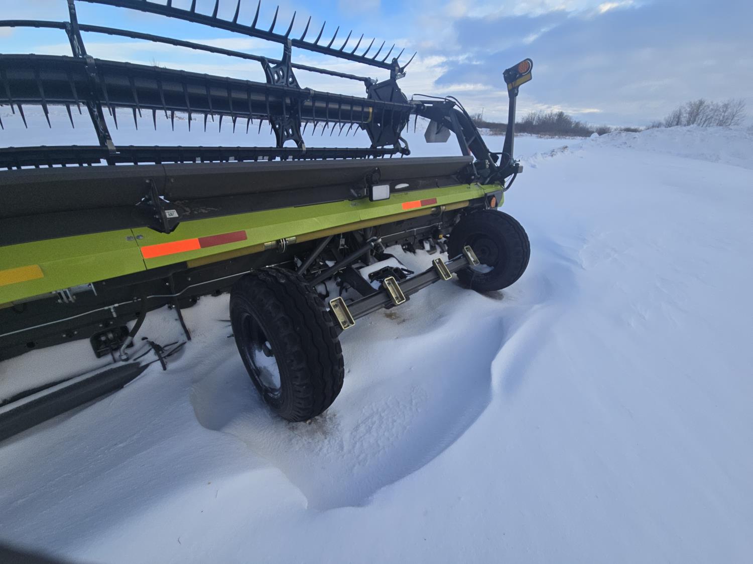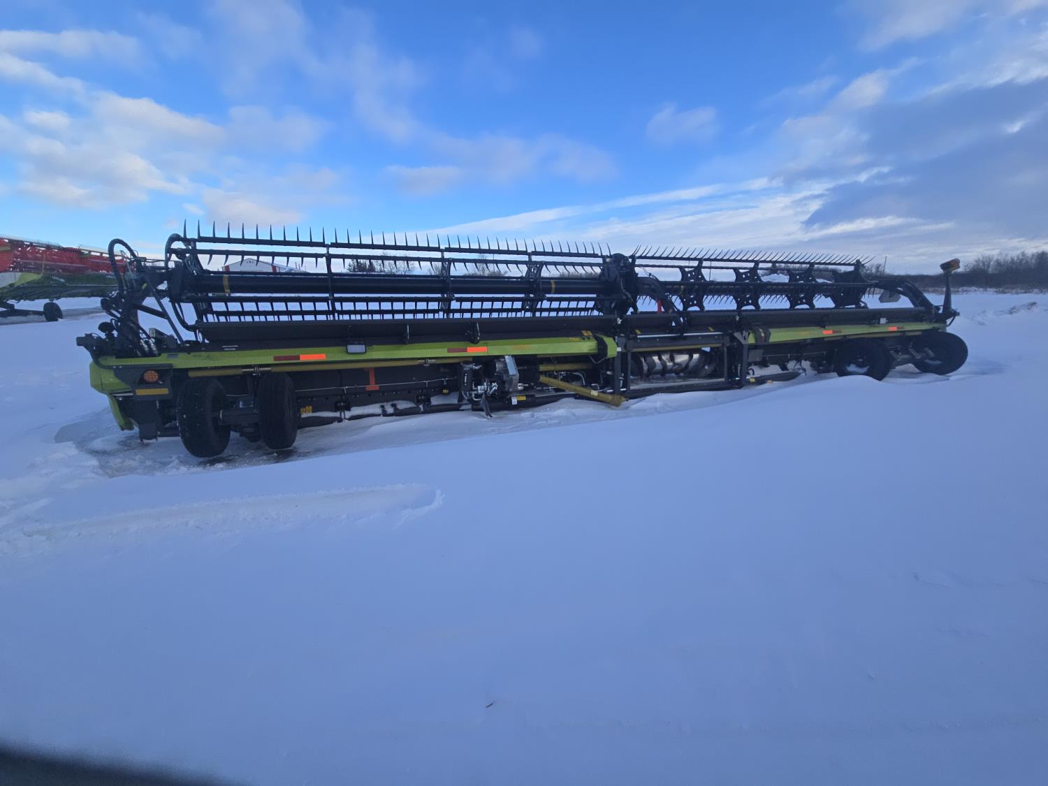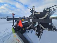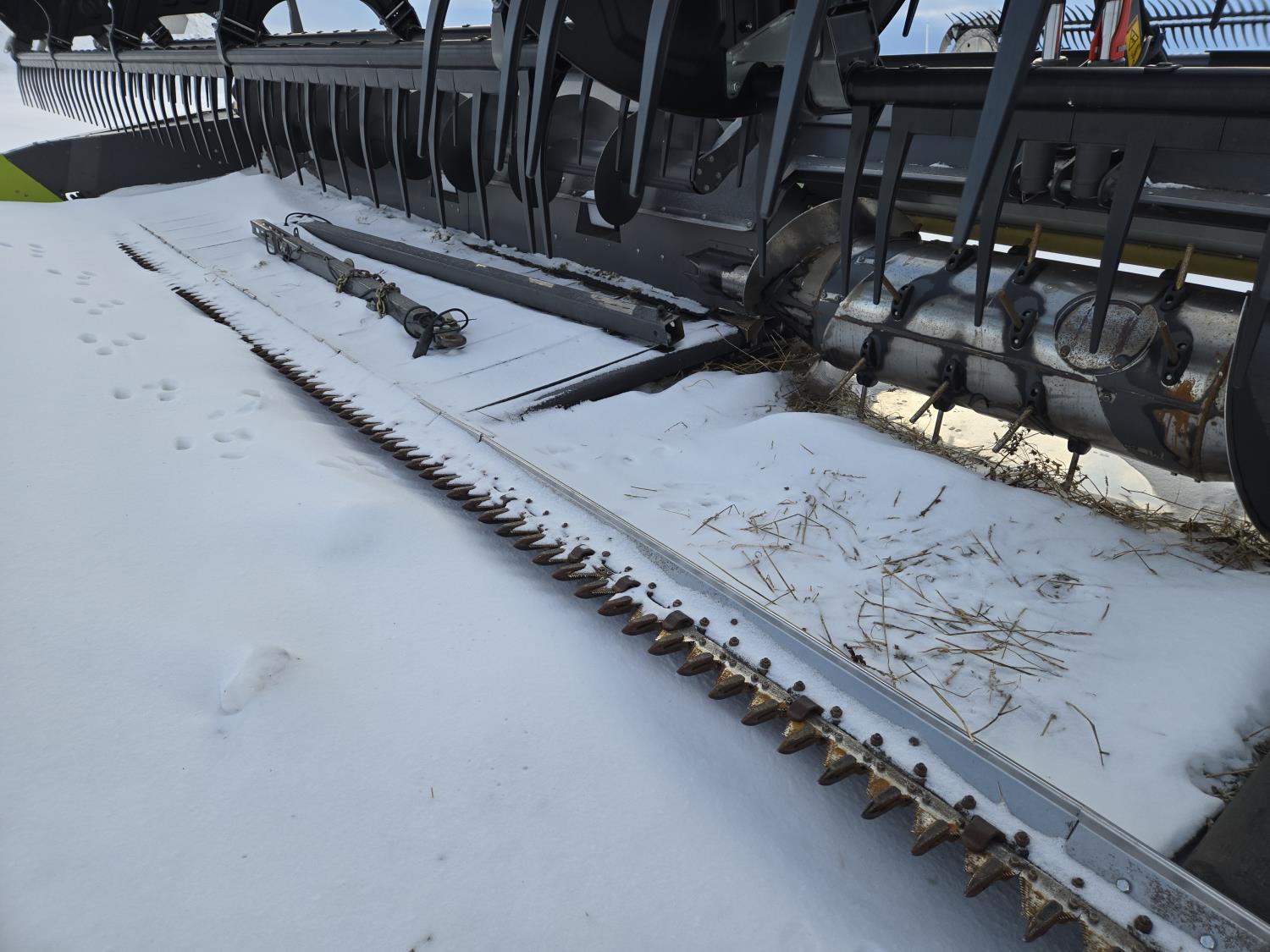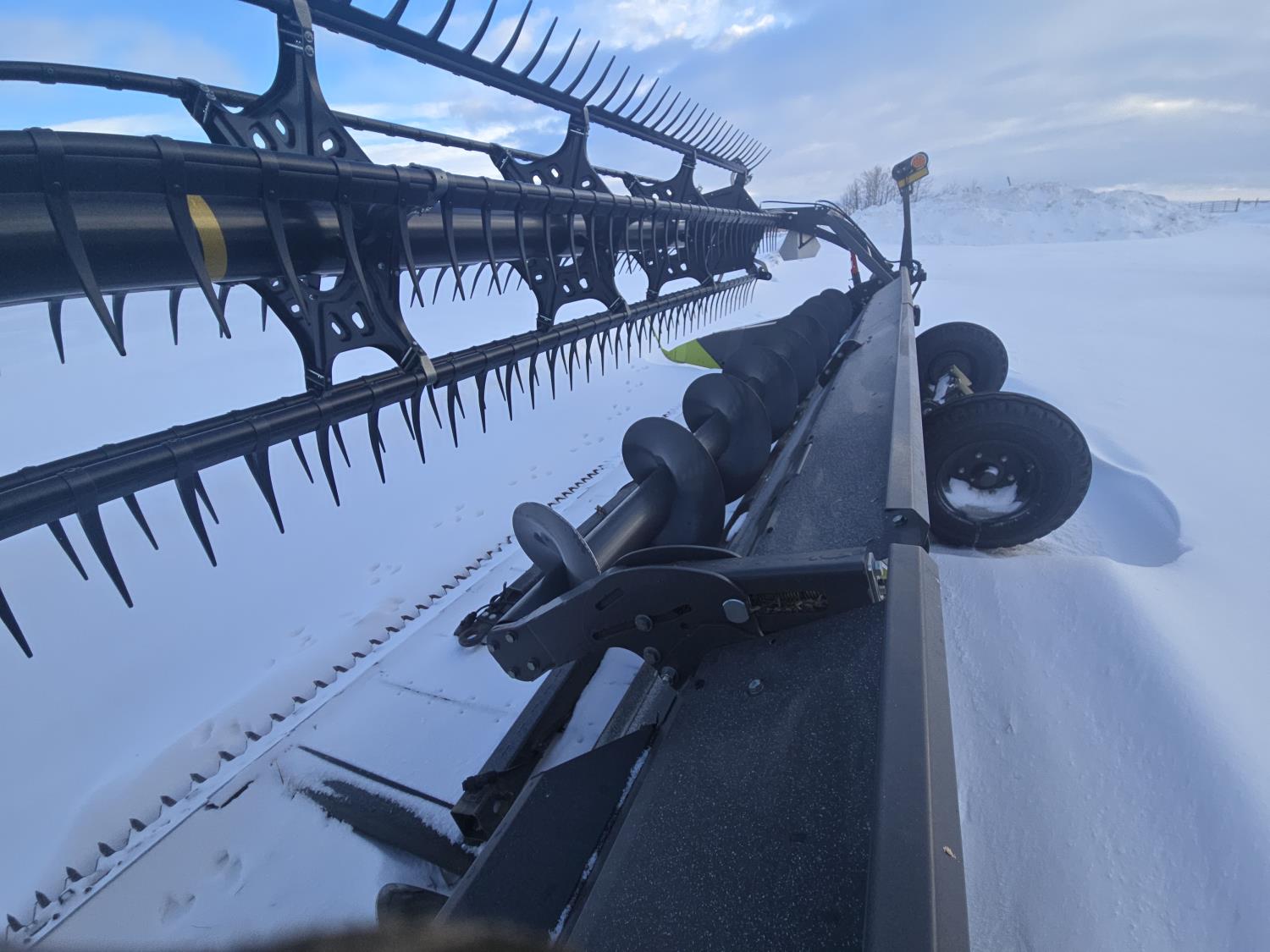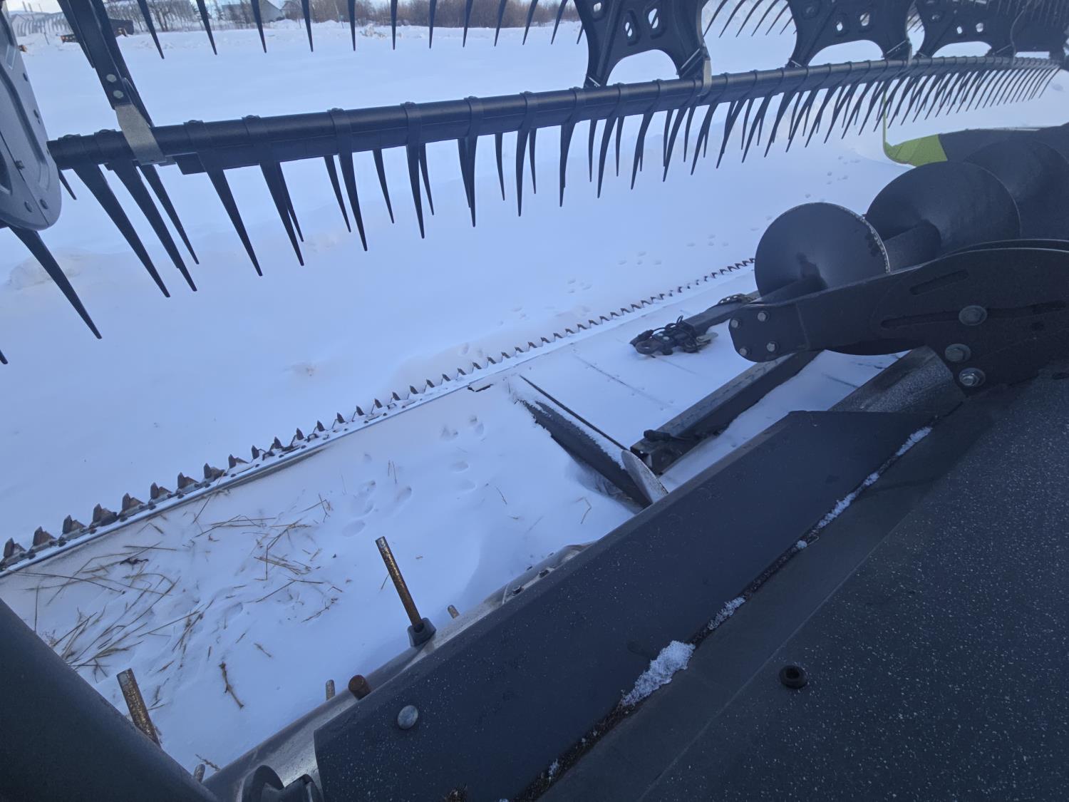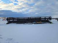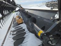 pickup reel, fore & aft, top cross auger, integrated transport, split reel, gauge wheels, canola knife, Auto guidance with 6 sensors, LED light package, reel speed and auto belt speed, stone deflector plate, 280/75R15.3 tires