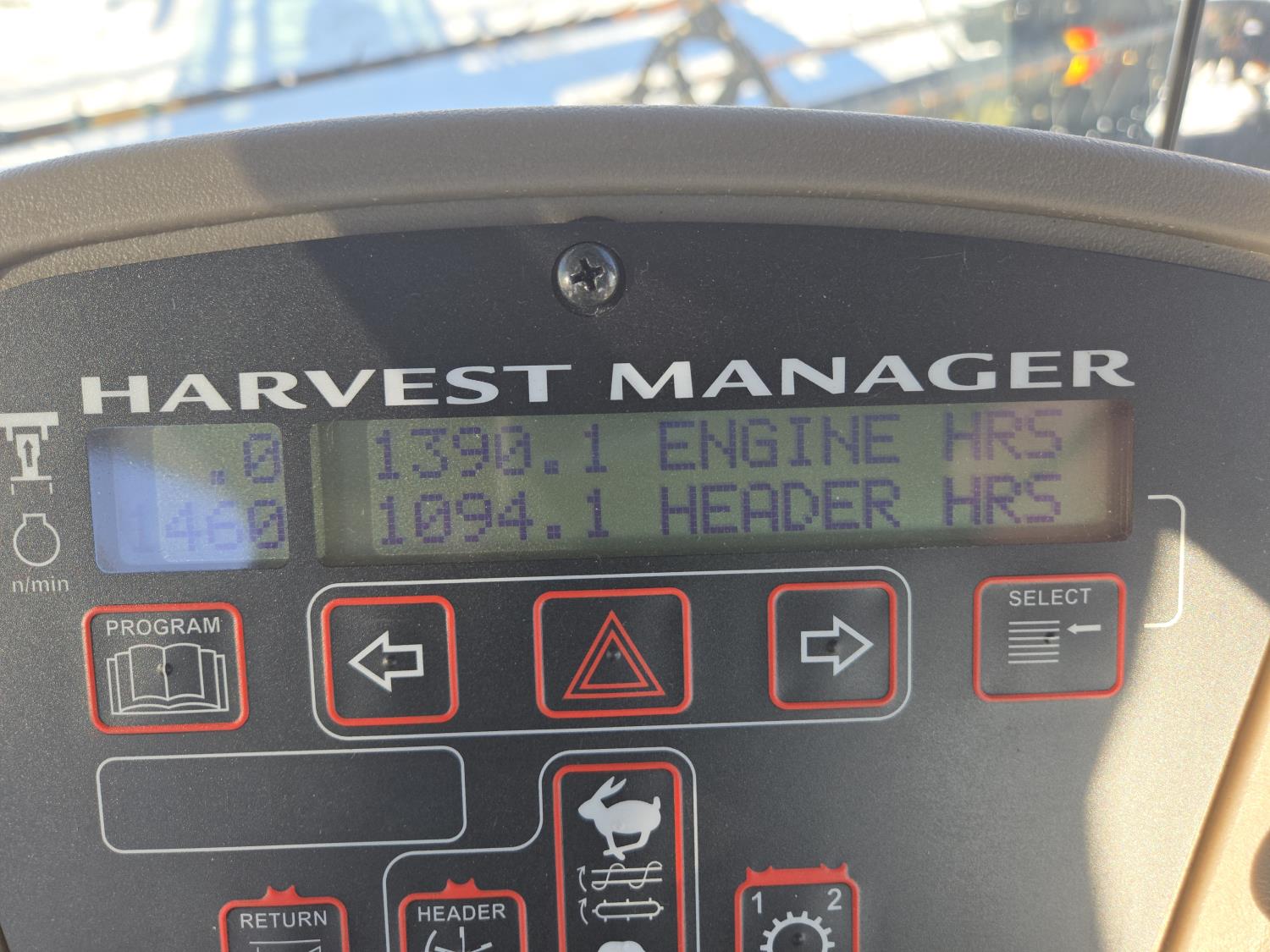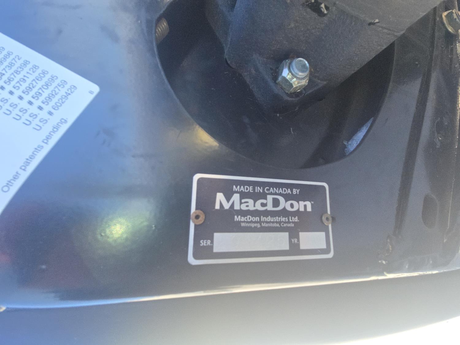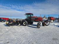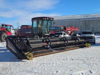 2009 MacDon D60-S center delivery rigid draper header, batt reel, single knife, variable speed reel, fore & aft, gauge wheels, skid plates, crop dividers, swath roller, (2) Roto shear crop cutters, A/C, radio, upgraded stereo, air ride seat, buddy seat, monitor, 18.4-26 front tires