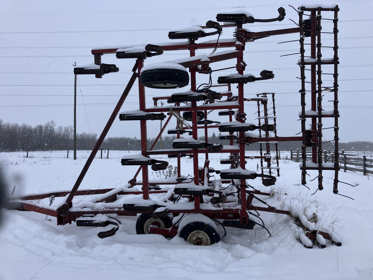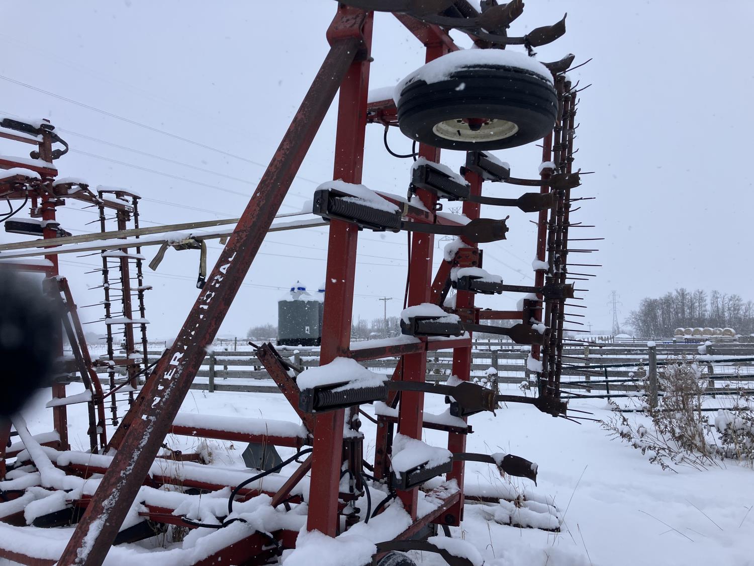 10 inch spacing, spikes, spring tooth harrows, walking axles on main frame, 15" main frame tires, 15" wing tires
