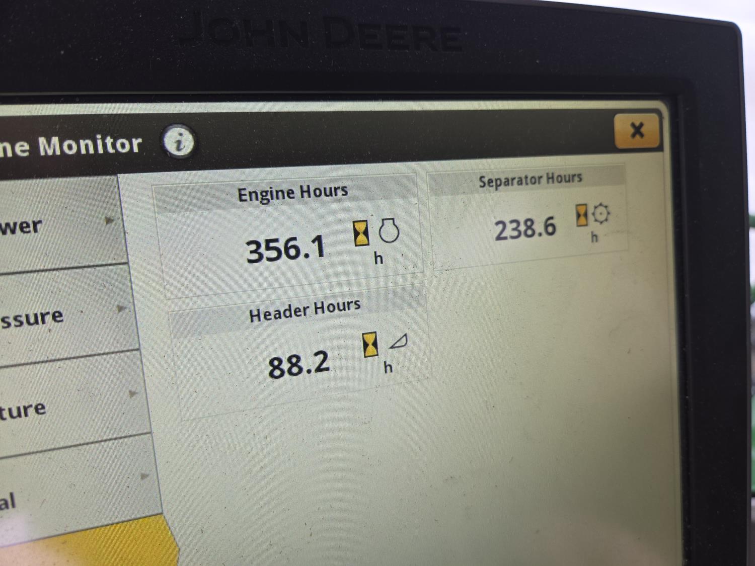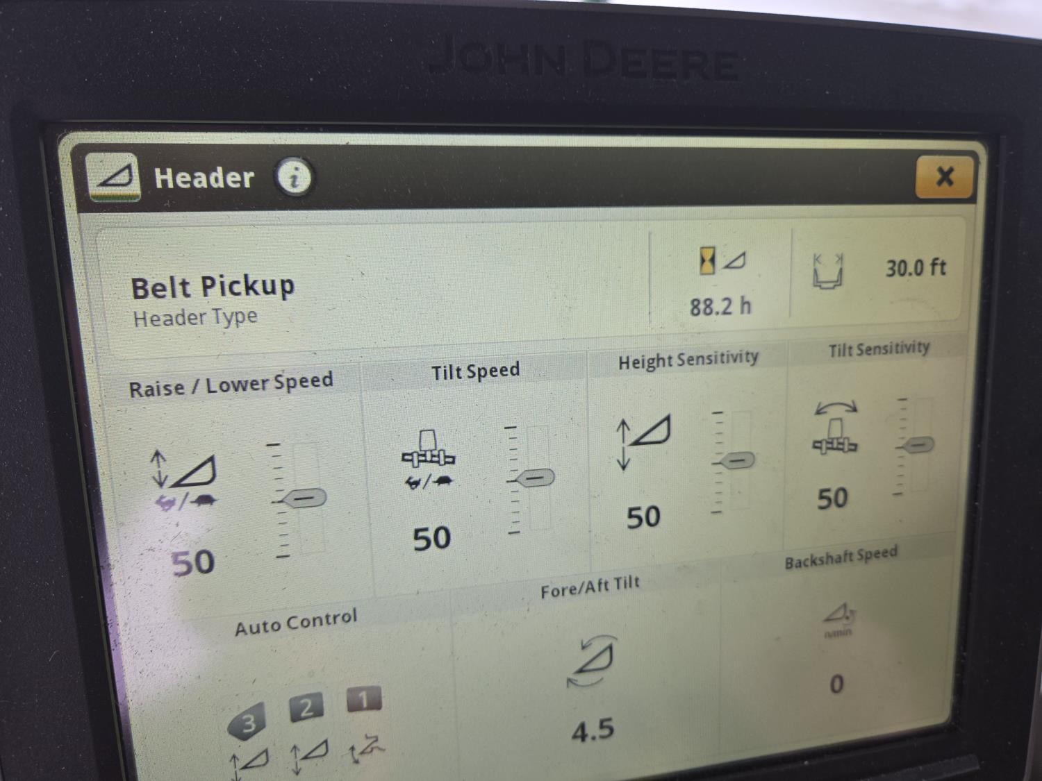 variable speed reel, auto header height, fore & aft, reverser, lateral tilt, rock trap, yield & moisture, chaff spreader, fine cut chopper, auto fold grain tank extensions, 31 ft auger, premium lighting, A/C, radio, buddy seat, Premium cloth seats, 4600 monitor, extended monitor, grain automation, Star Fire Integrated receiver, 710/70R42 front tires, duals
