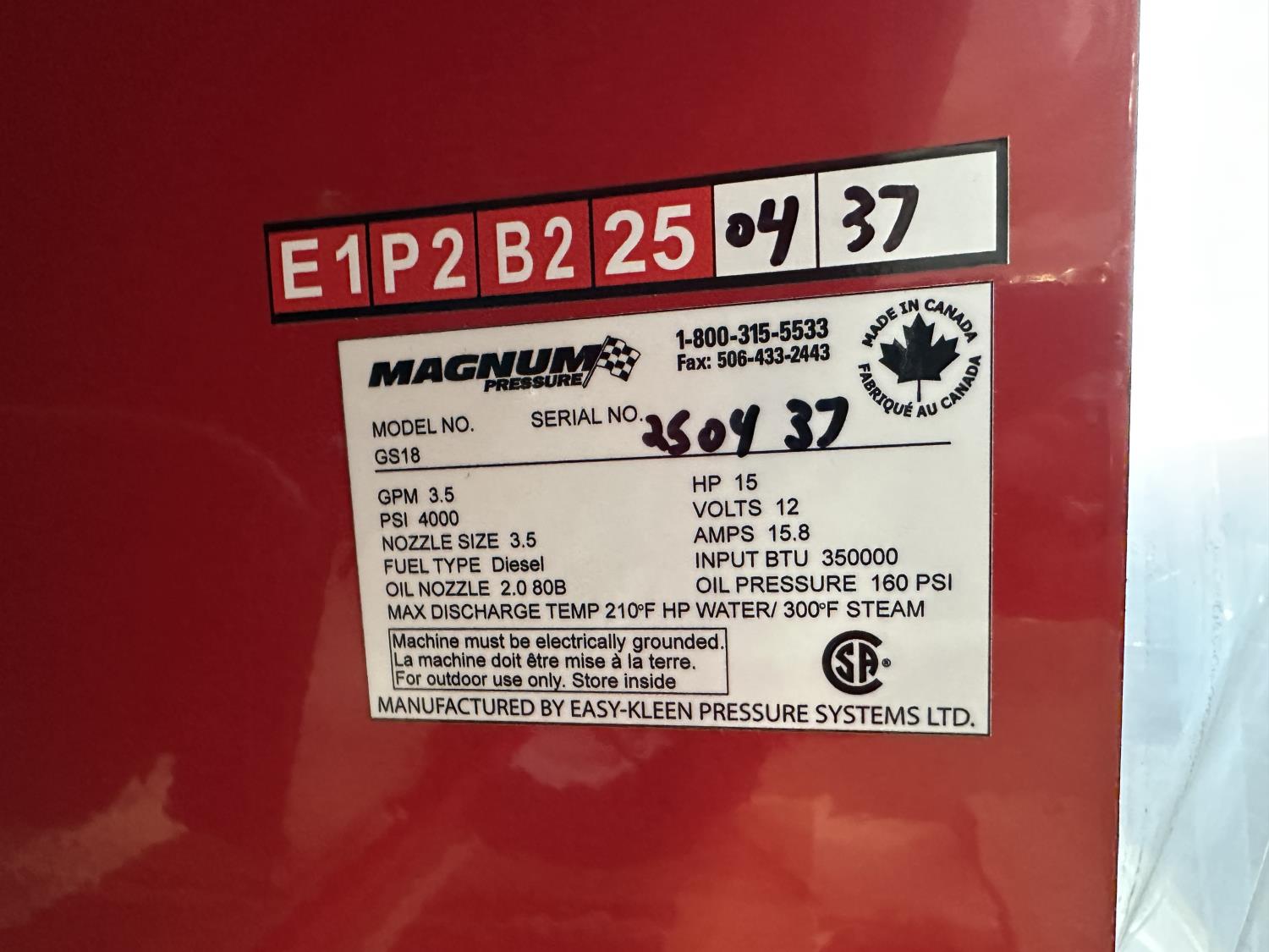 3.5 GPM at 4000 PSI, 15 HP, gasoline engine, electric start, 12 volt burner, oil/diesel fired burned/thermostat, schedule 80 coil with stainless steel housing, fully welded, powder coated frame, 10 gallon poly fuel tank, 30' hose and wand