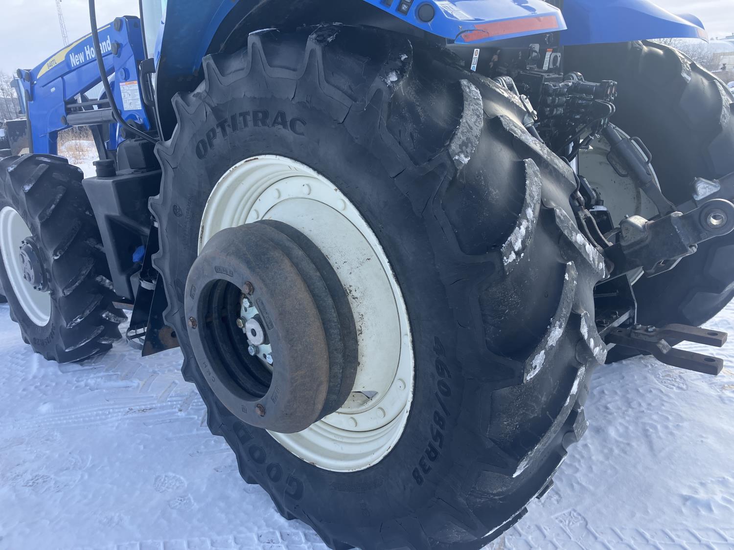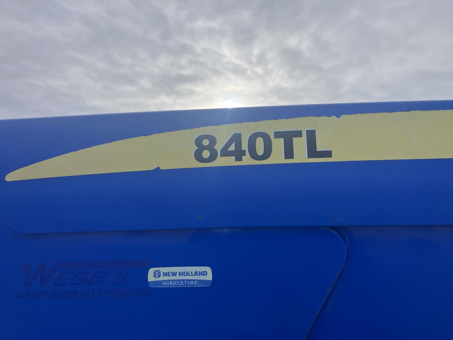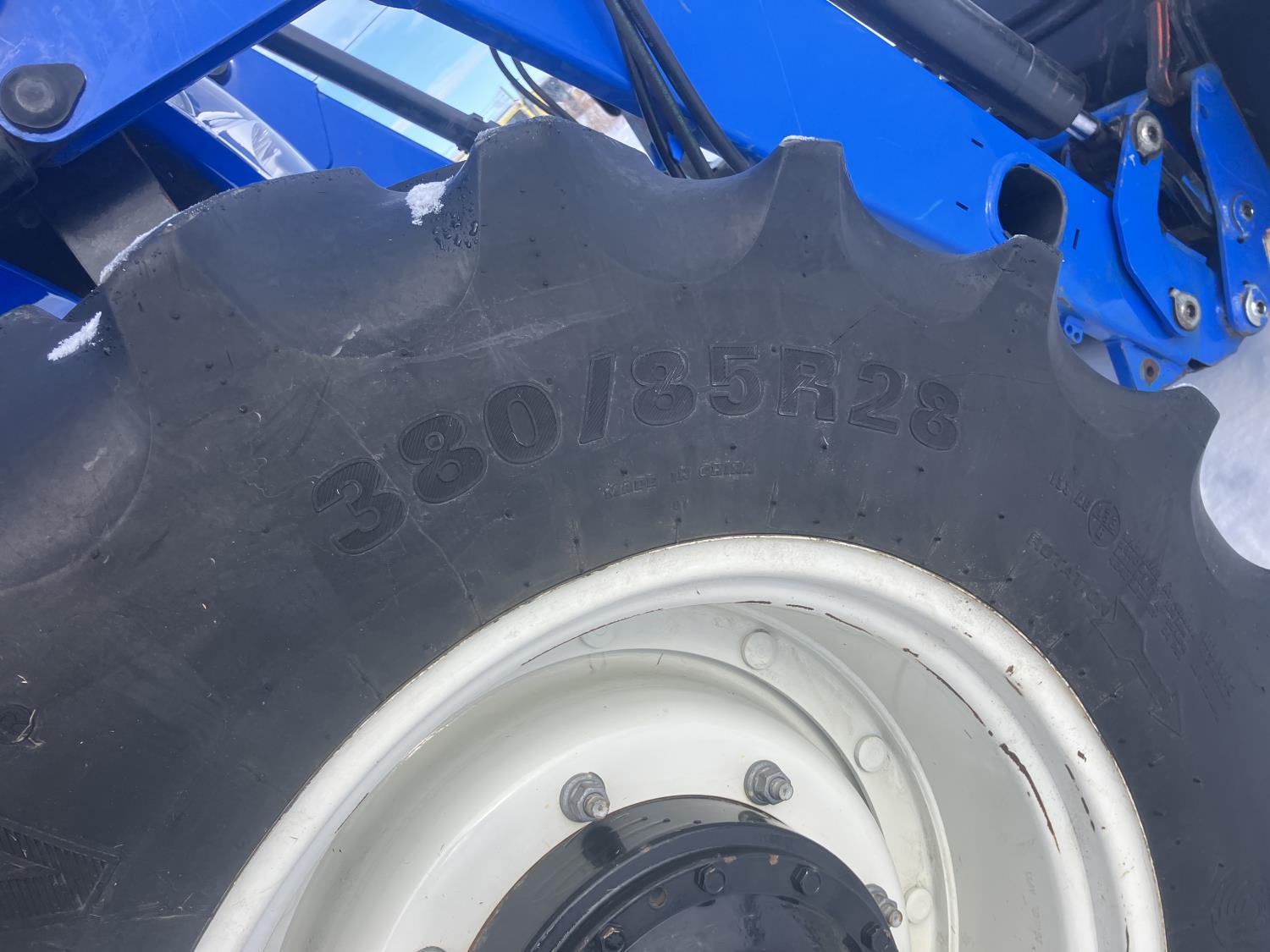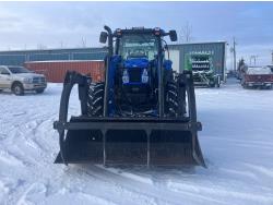 New Holland 840TL loader, grapple, bale forks, mid mount hydraulic connection, FPT 6.7 6 cylinder 165 HP, engine, DEF deleted, 16 speed partial power shift transmission, cab, left hand reverser, rear differential lock, A/C, air ride seat, buddy seat, Sun roof, front and rear window shades, AM/FM Bluetooth integrated radio, engine and transmission block heaters, L&R mirrors, tilt and telescopic steering wheel, rear flood work lights, 540/1000 PTO, 3 point hitch, 3 point hitch exterior control, 3 rear hydraulic outlets, 380/85R28 front tires, 460/85R38 rear tires