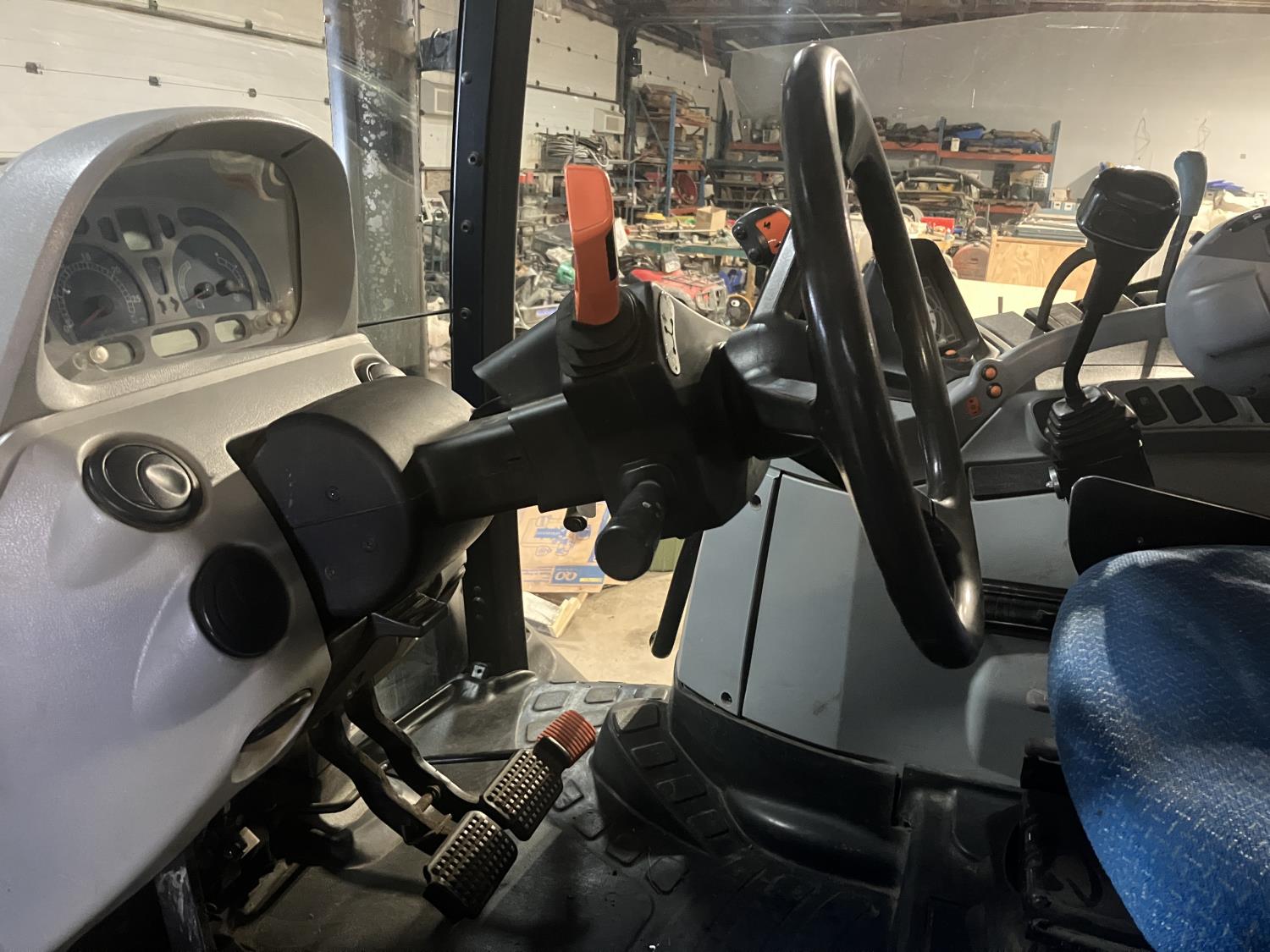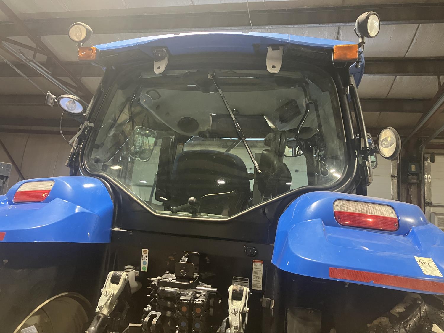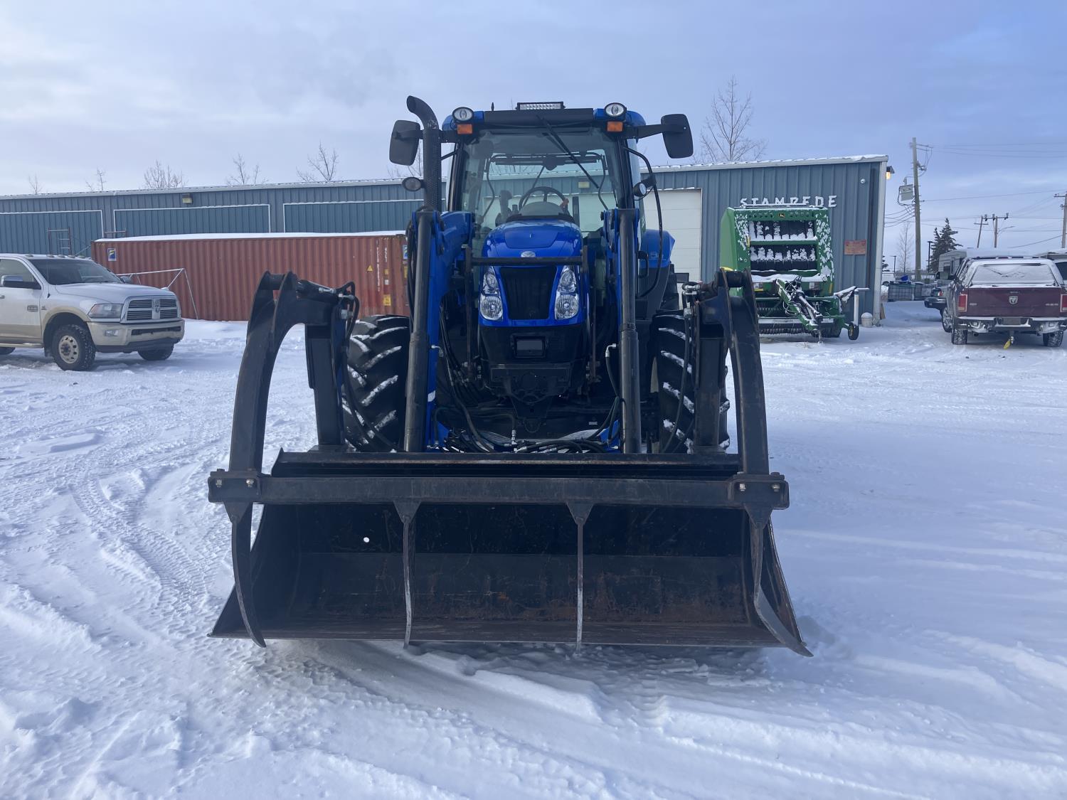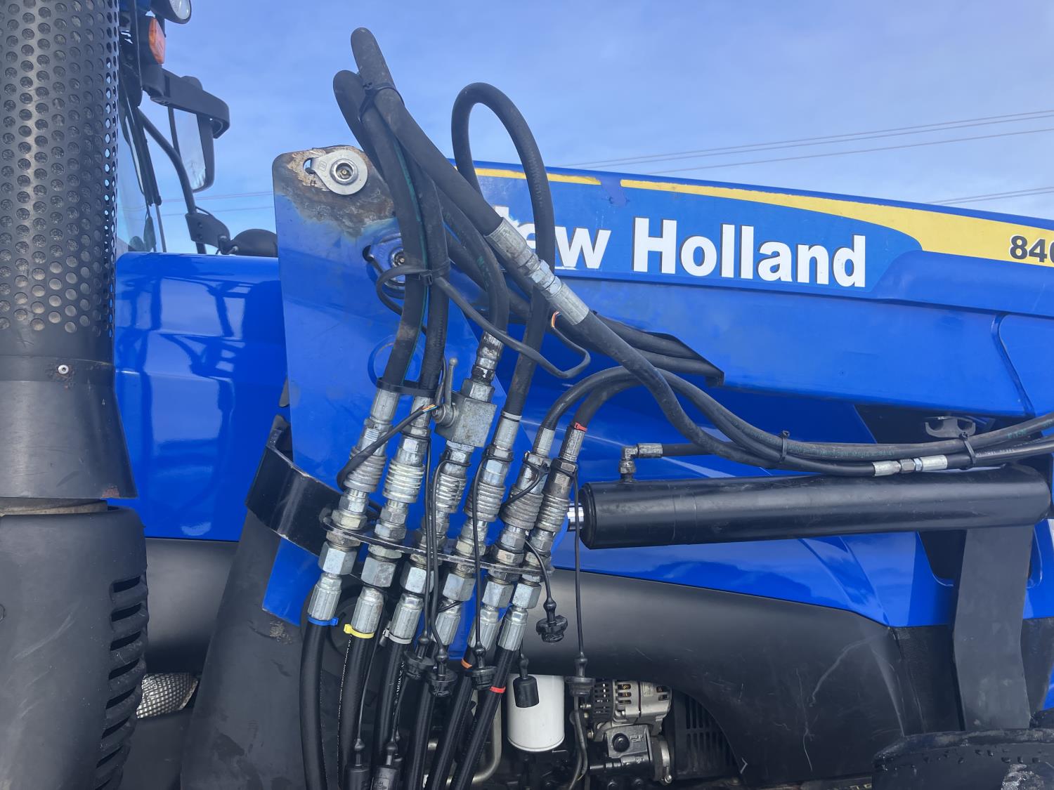 New Holland 840TL loader, grapple, bale forks, mid mount hydraulic connection, FPT 6.7 6 cylinder 165 HP, engine, DEF deleted, 16 speed partial power shift transmission, cab, left hand reverser, rear differential lock, A/C, air ride seat, buddy seat, Sun roof, front and rear window shades, AM/FM Bluetooth integrated radio, engine and transmission block heaters, L&R mirrors, tilt and telescopic steering wheel, rear flood work lights, 540/1000 PTO, 3 point hitch, 3 point hitch exterior control, 3 rear hydraulic outlets, 380/85R28 front tires, 460/85R38 rear tires