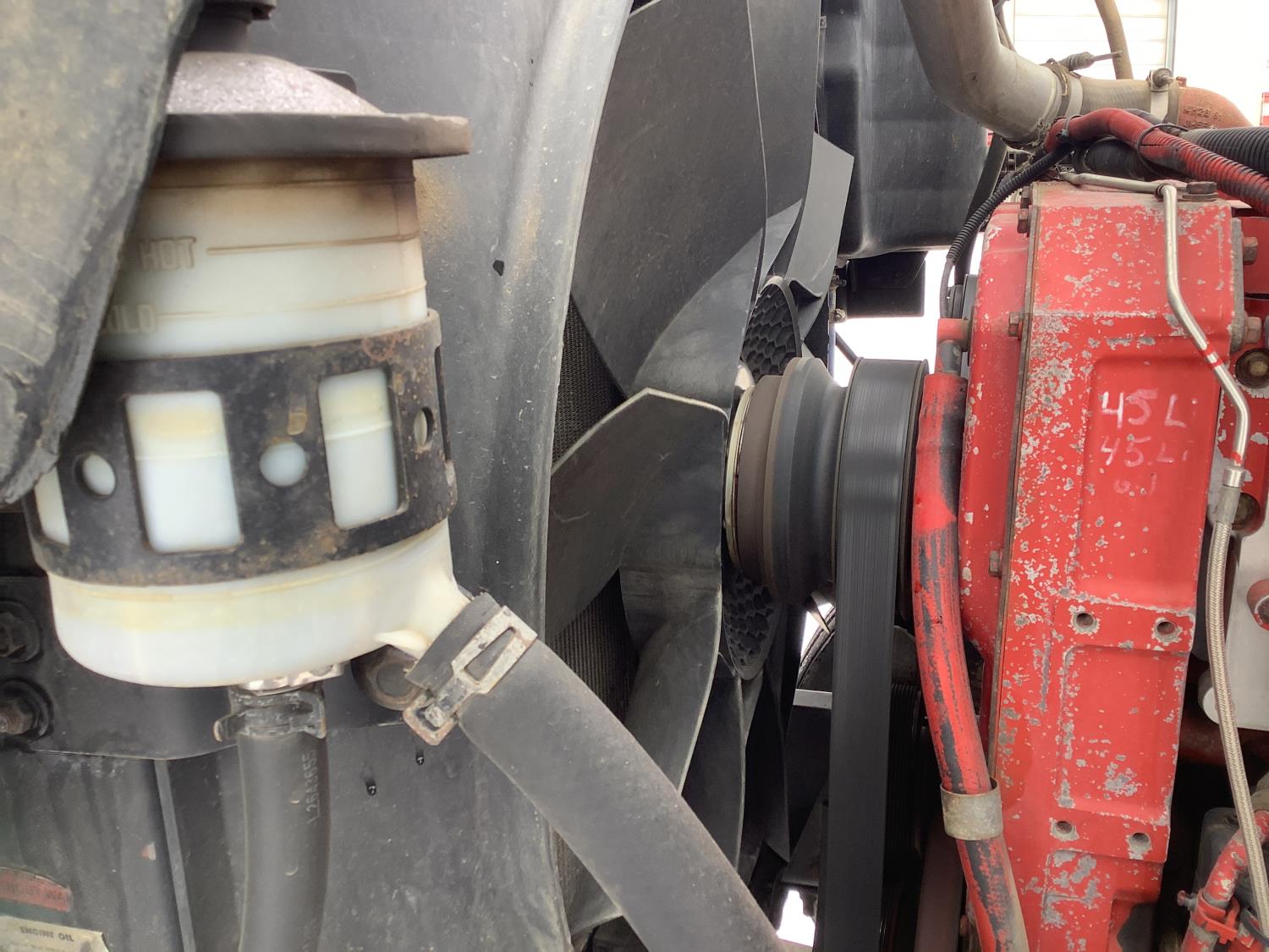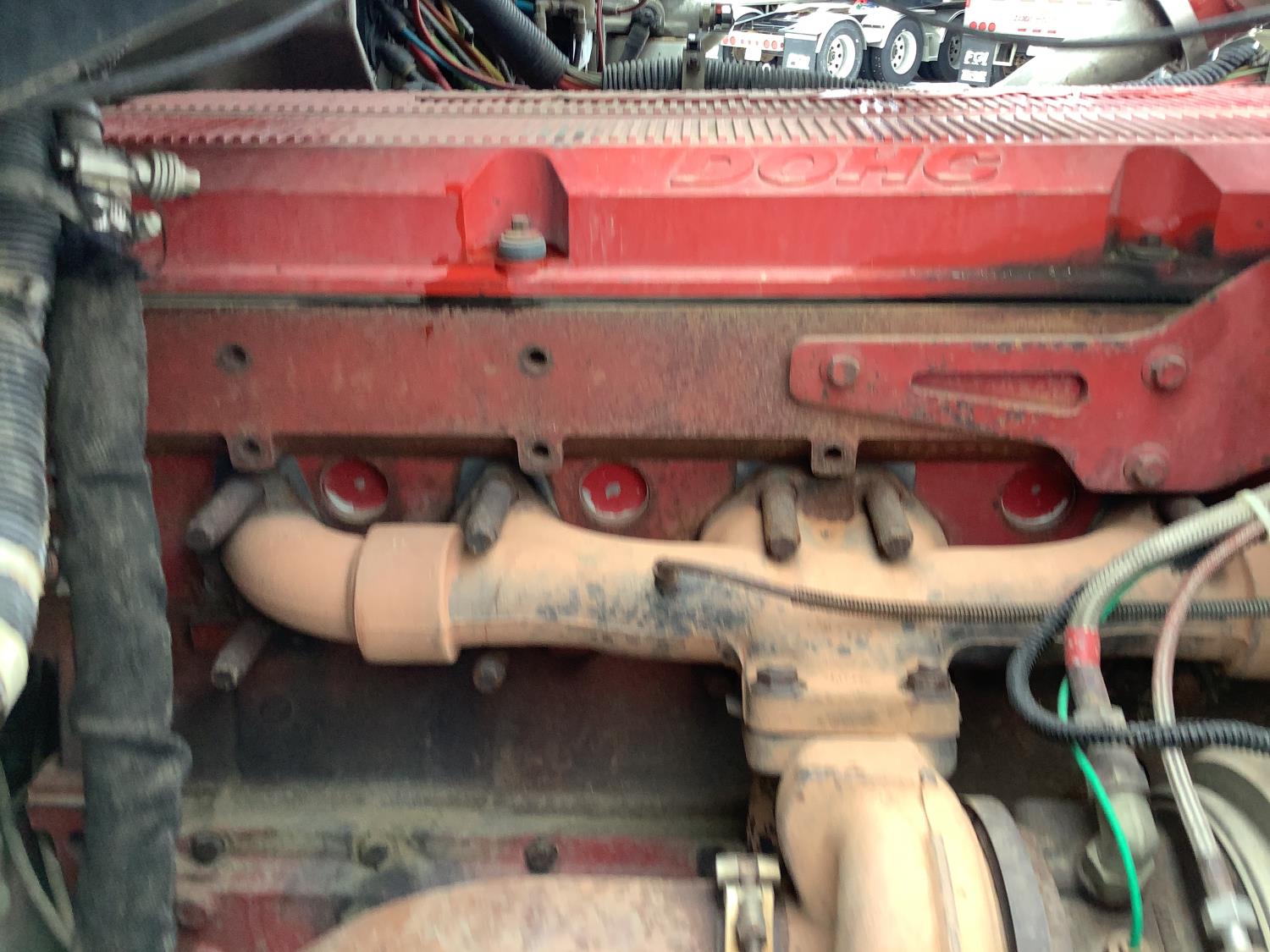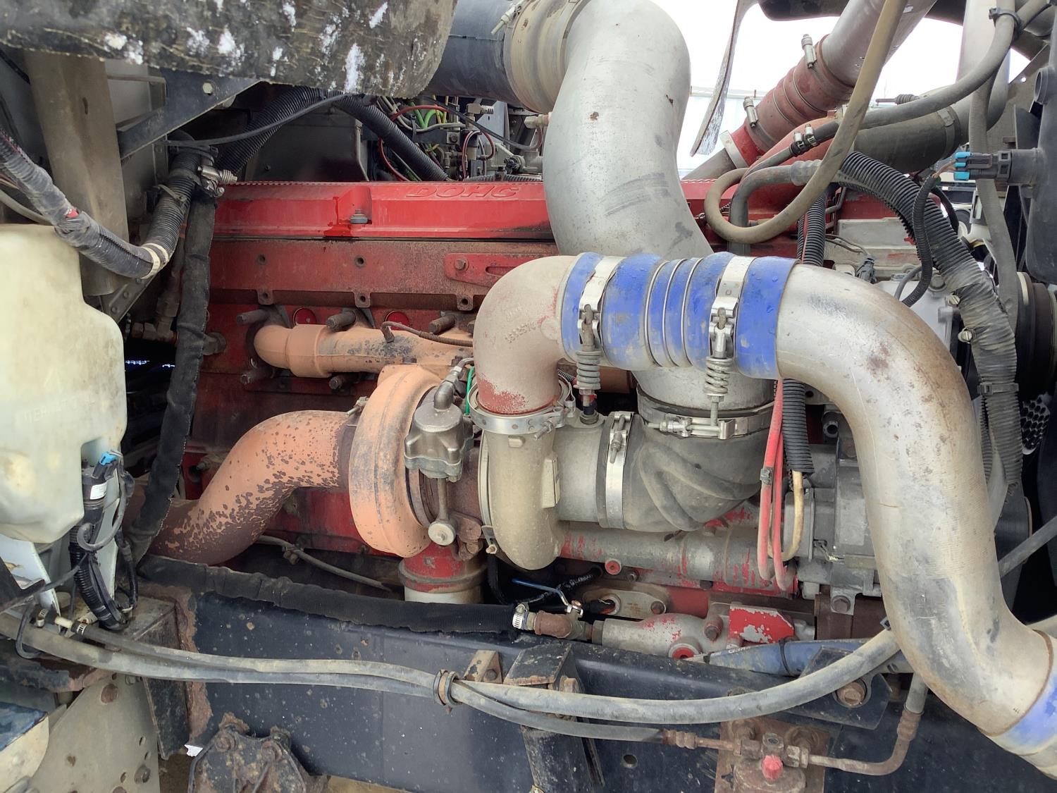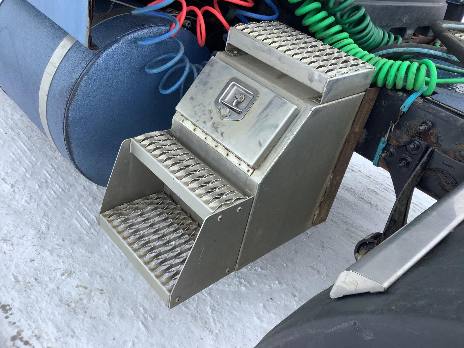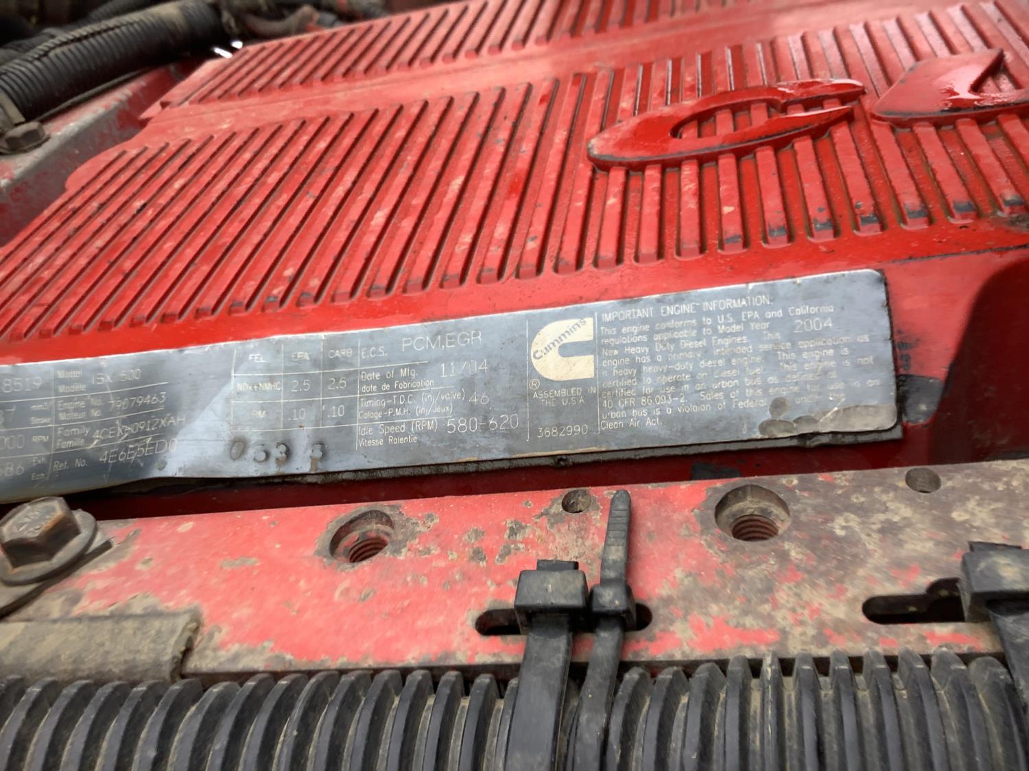 Cummins ISX 500 15 L 6 cylinder 500 HP engine, engine brake, Eaton Fuller 18 speed manual transmission, mid rise 72 inch sleeper, air ride seats, Eagle package, air ride cab, hydraulic wet kit, beacons, air slide raised 5th wheel, step tool box, air ride suspension, 12,000 lb front axle, full lockers, super 40000 rears, 1/2 moon rear fenders, all aluminum wheels, 11R24.5 tires