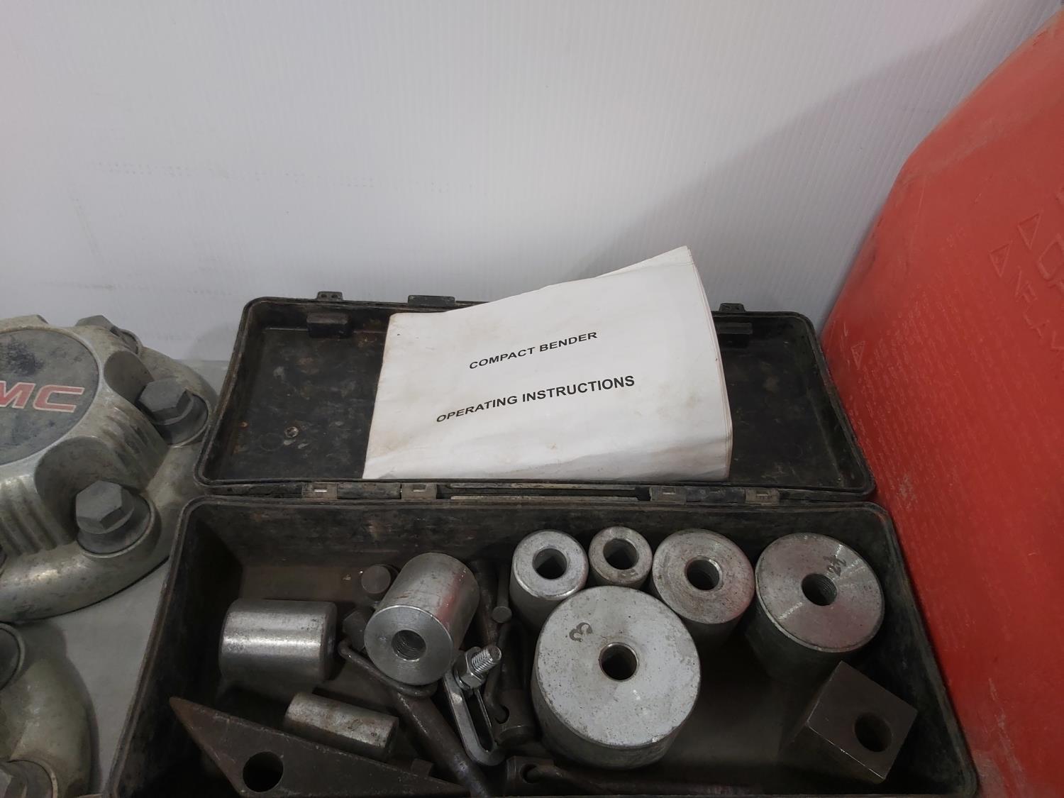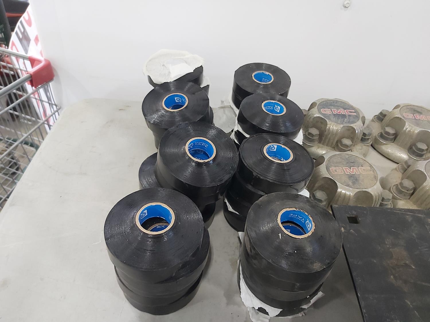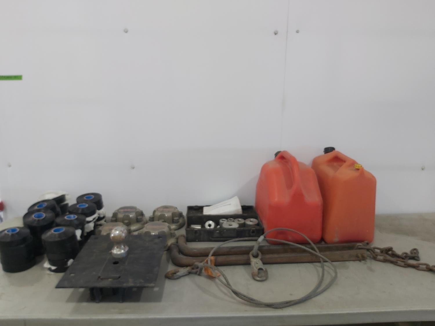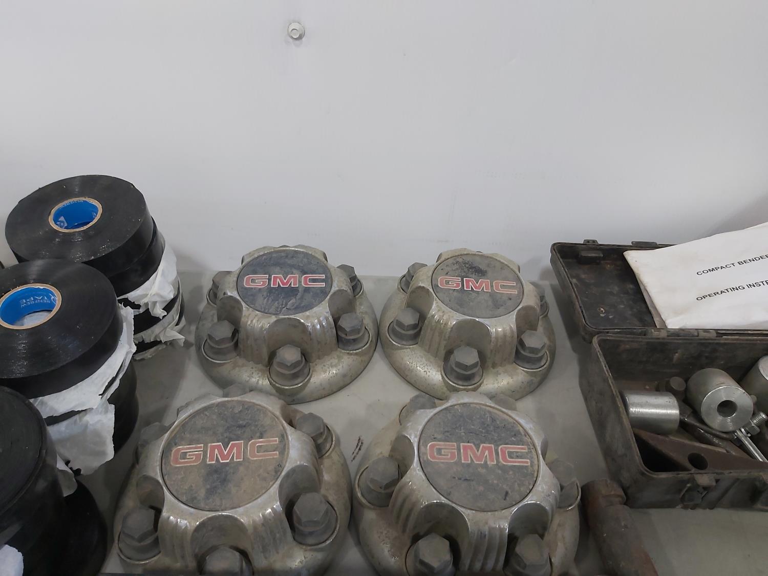 (40) rolls of Renfrew pipe tape, (4) GMC hub cap covers, 5TH wheel hitch, compact bender, (2) fuel cans, 5/16 inch shaw's anchor sling, (2) 31 inch stabilizer bars