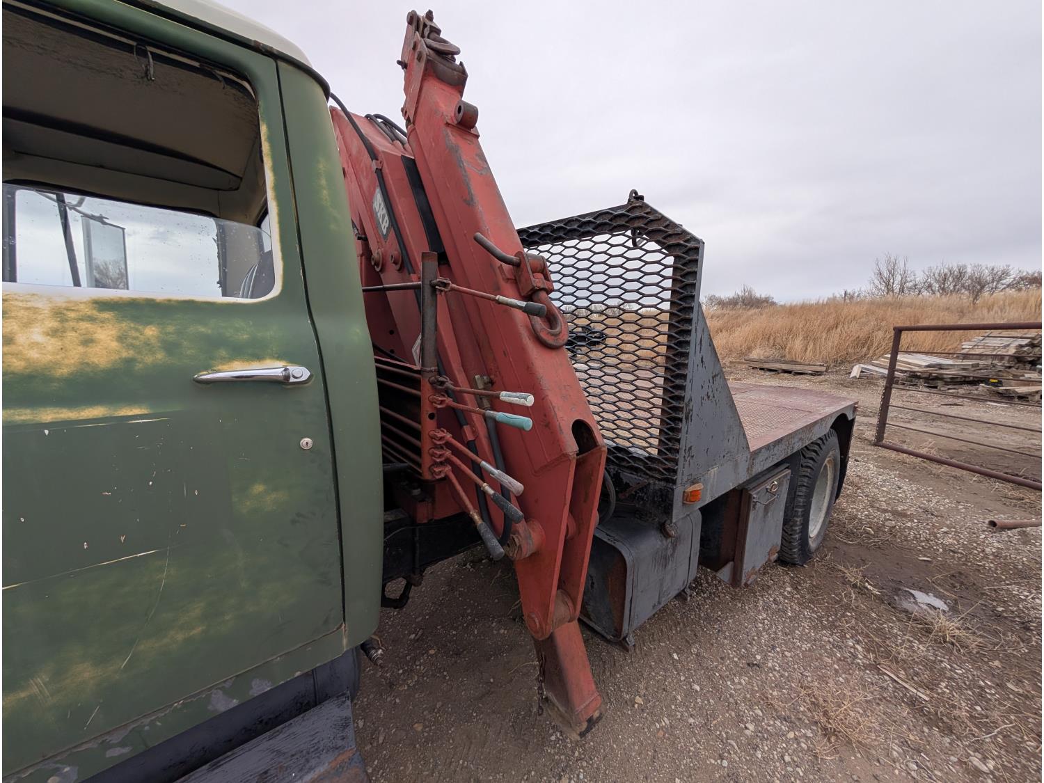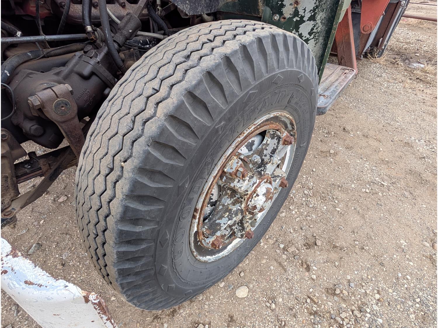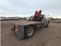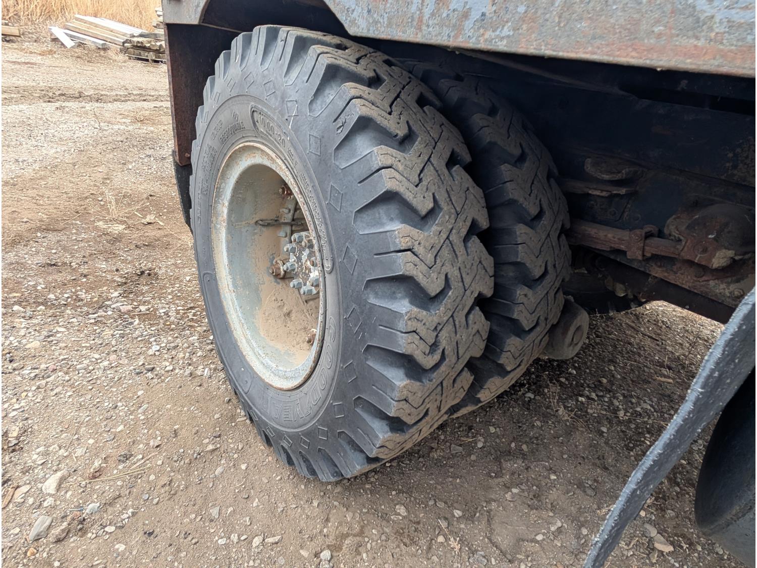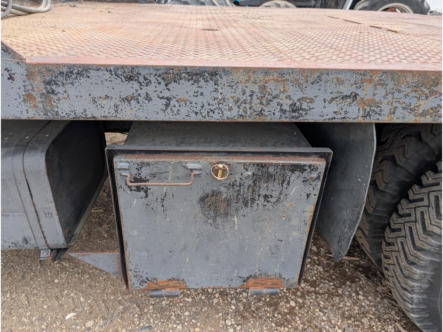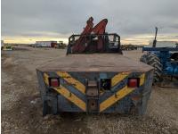 V8 gas engine, 5X2 manual transmission, 28 inch x 22 inch x 19 inch steel tool boxes, 8 ft x 9 ft 10 inch deck, SKB 40008K2 3 section 20 ft knuckle front mount crane, outriggers, spring suspension, 187 inch WB, 10.00-20 tires