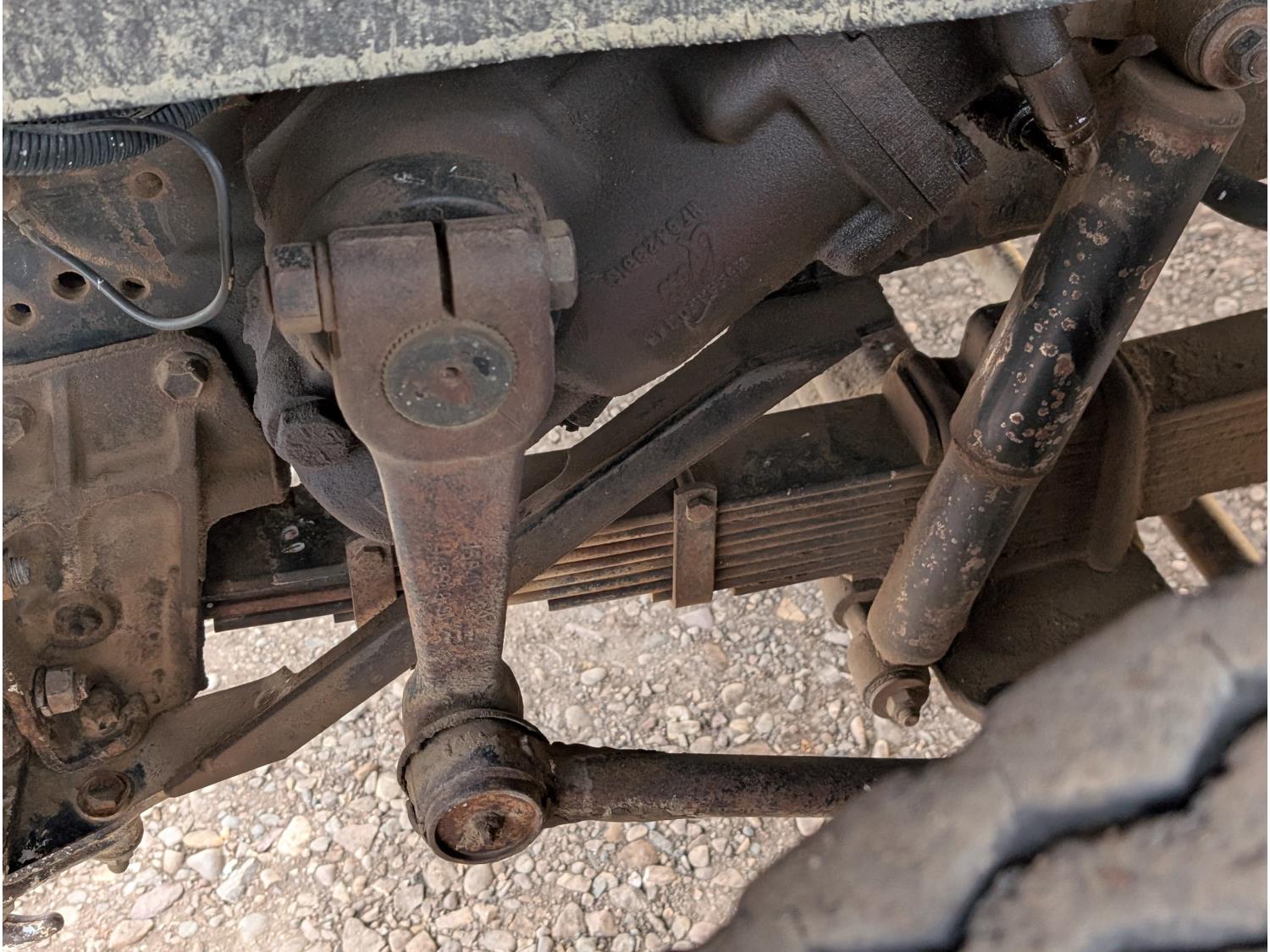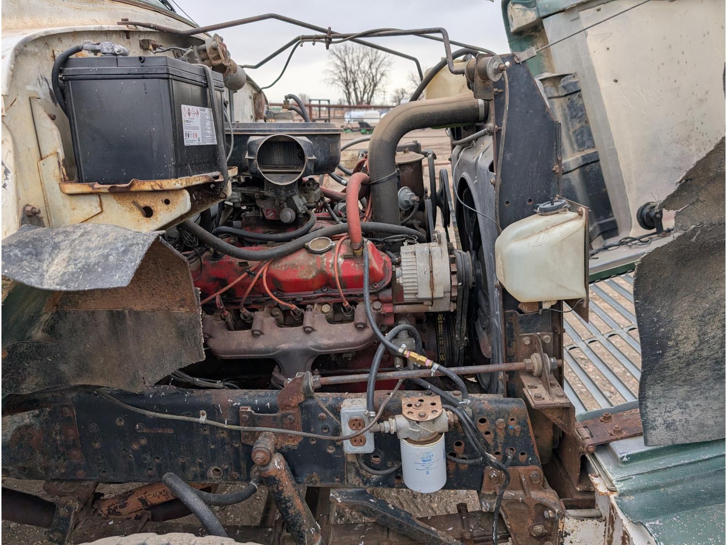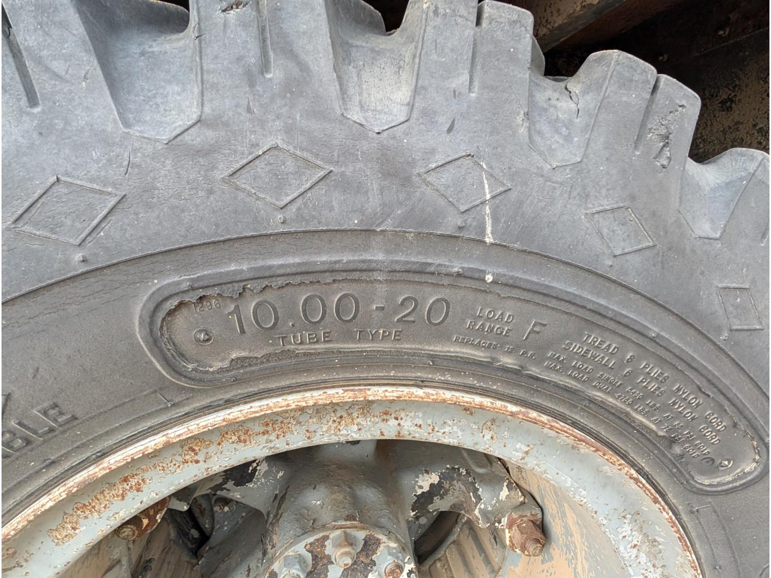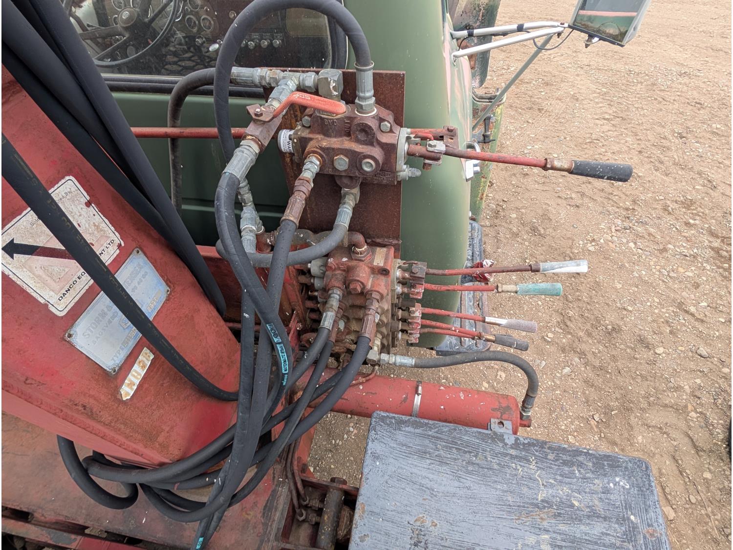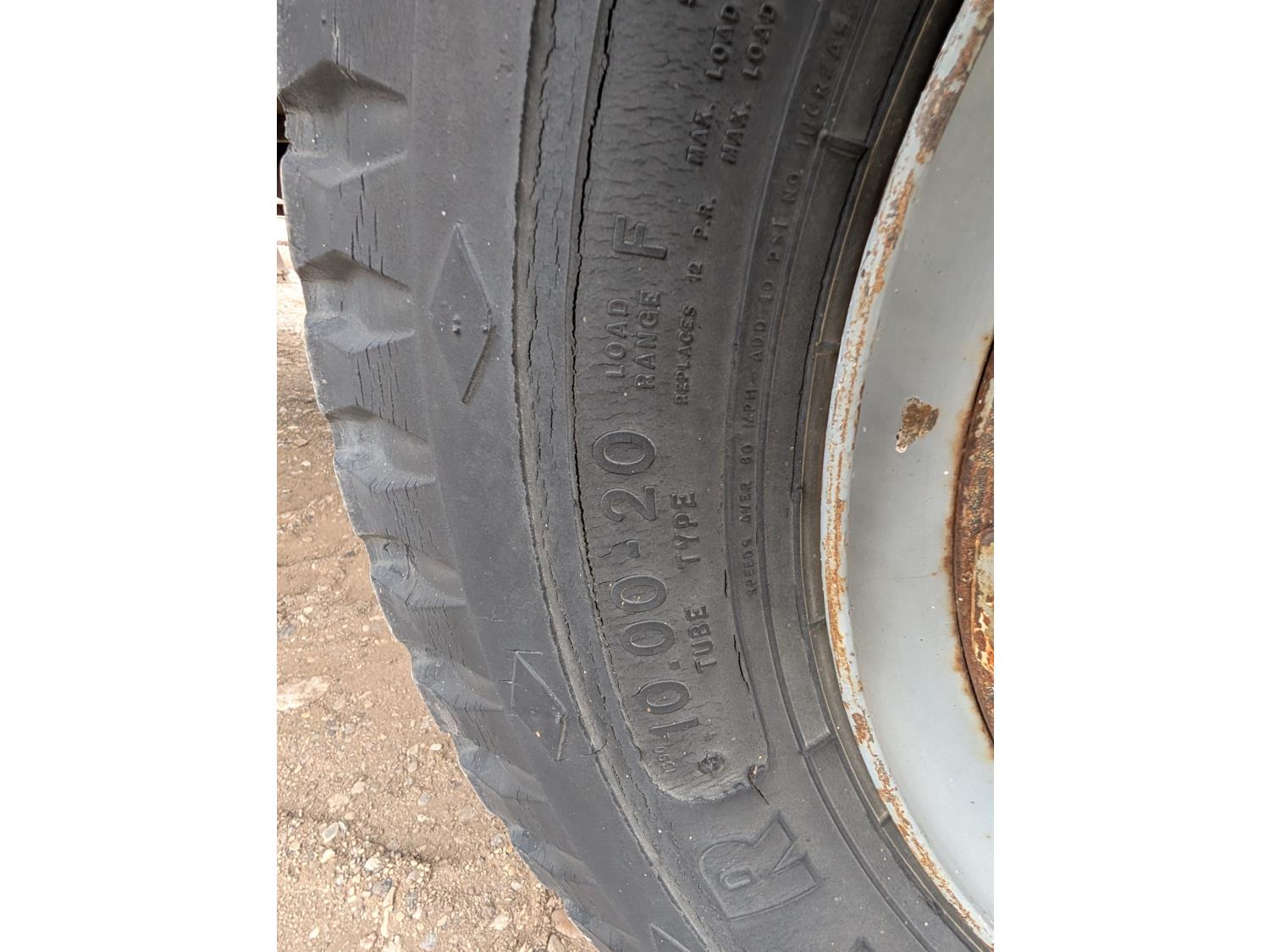 V8 gas engine, 5X2 manual transmission, 28 inch x 22 inch x 19 inch steel tool boxes, 8 ft x 9 ft 10 inch deck, SKB 40008K2 3 section 20 ft knuckle front mount crane, outriggers, spring suspension, 187 inch WB, 10.00-20 tires