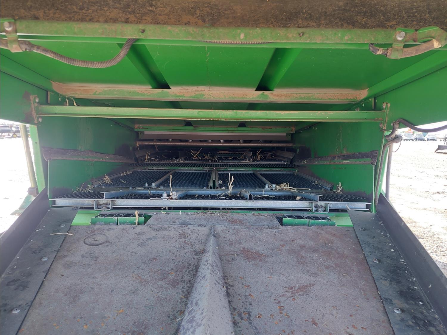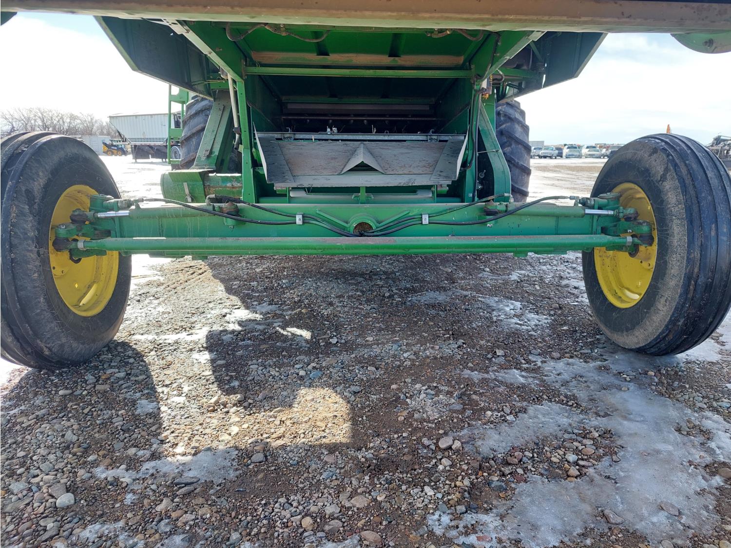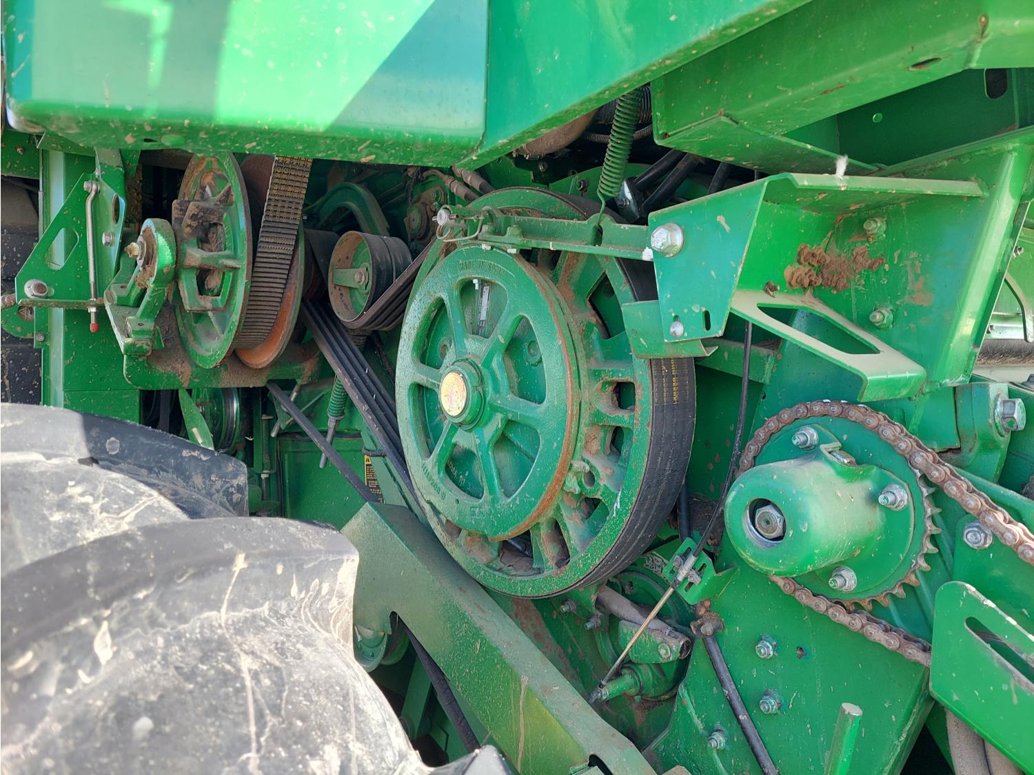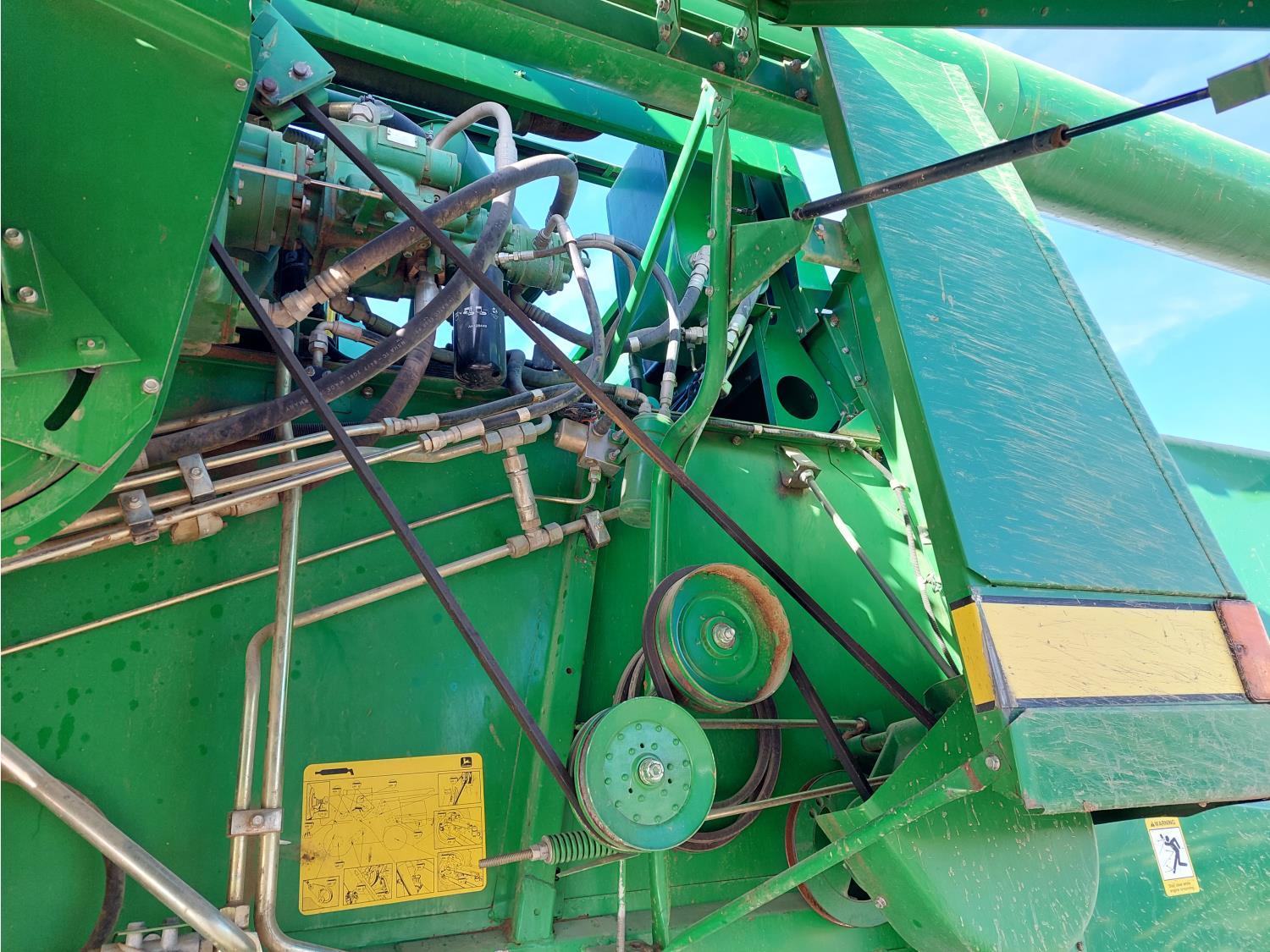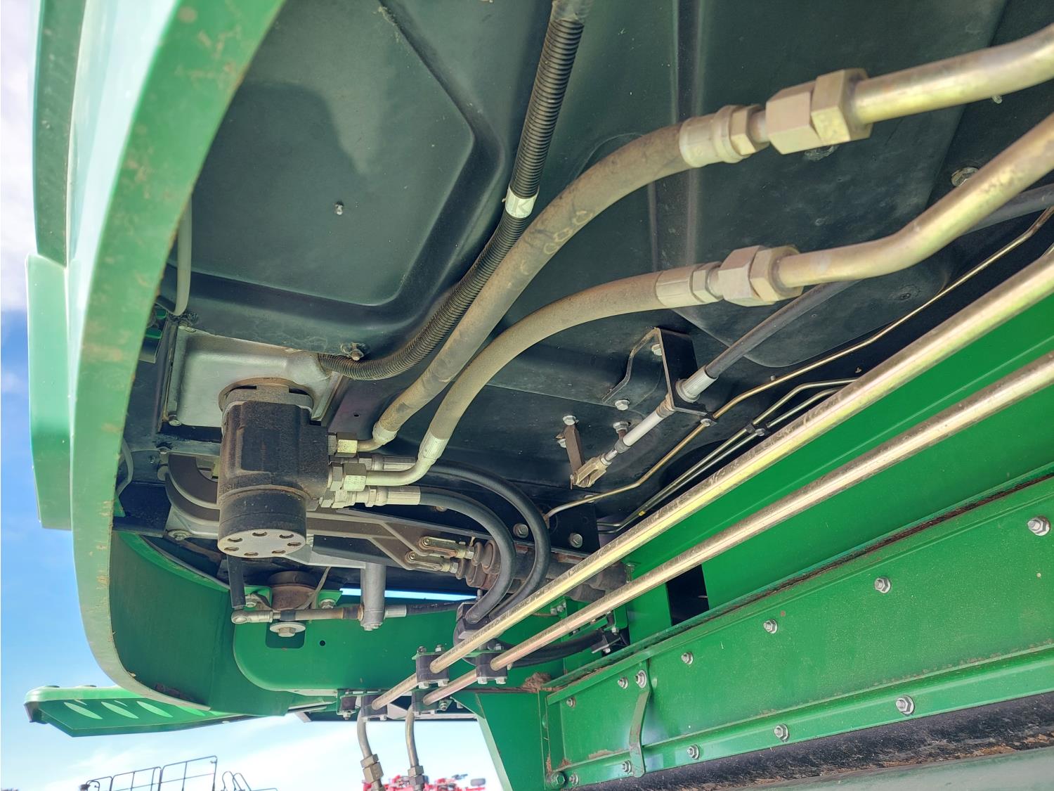 John Deere pick-up header, variable speed reel, auto header height, reverser, rock trap, chopper, 30 ft auger, Big Top grain tank extensions, slow down kit for beans , A/C, radio, air ride seat, buddy seat, 24.5-32 front tires, 11.25-24 rear tires