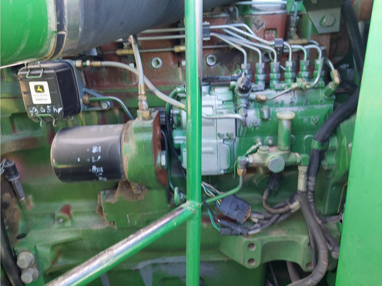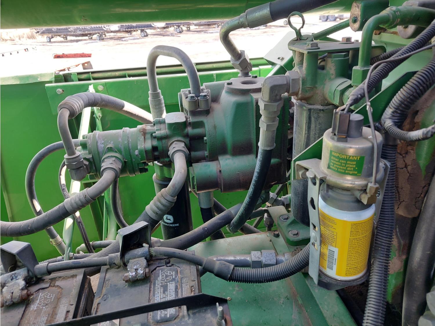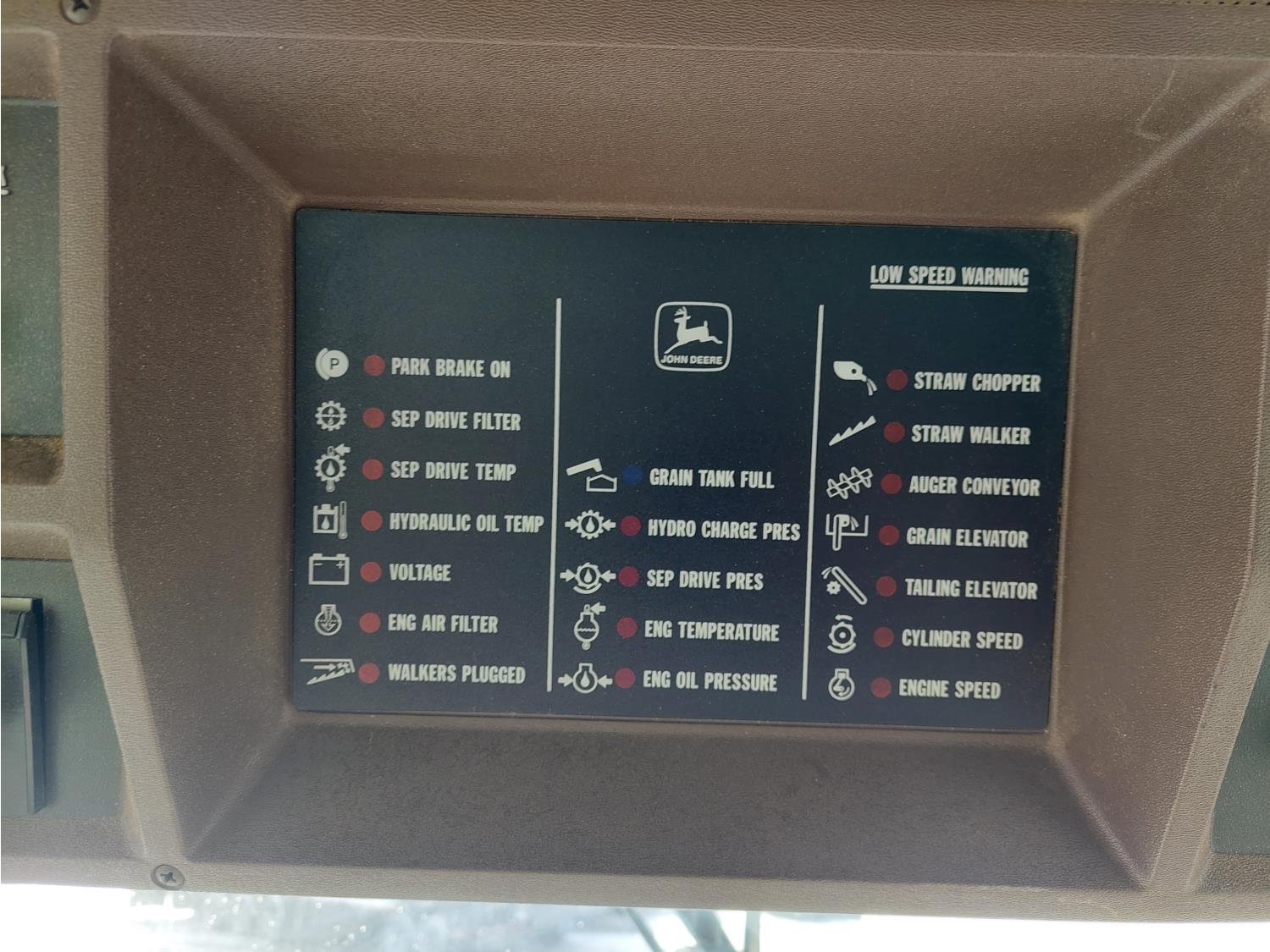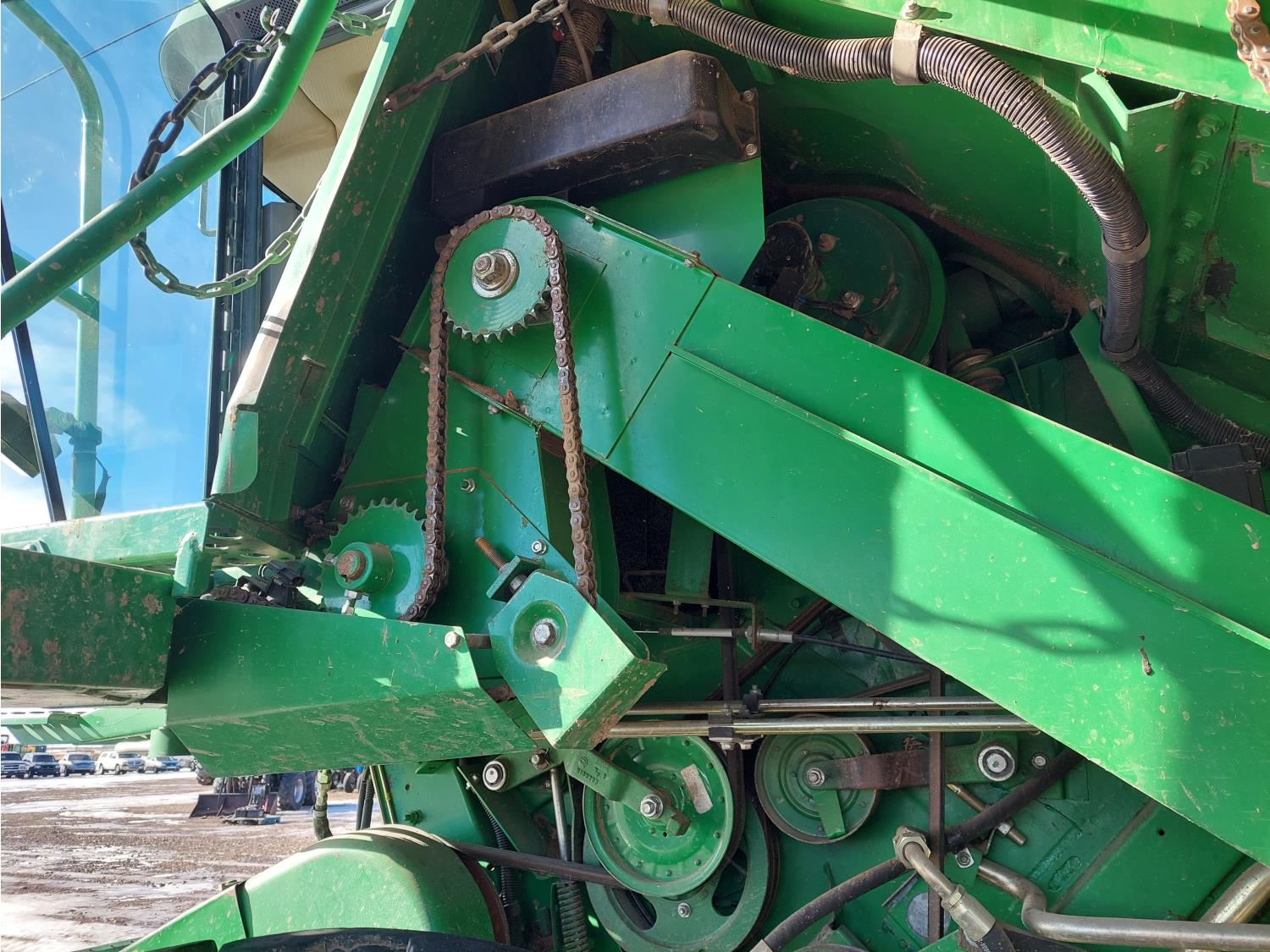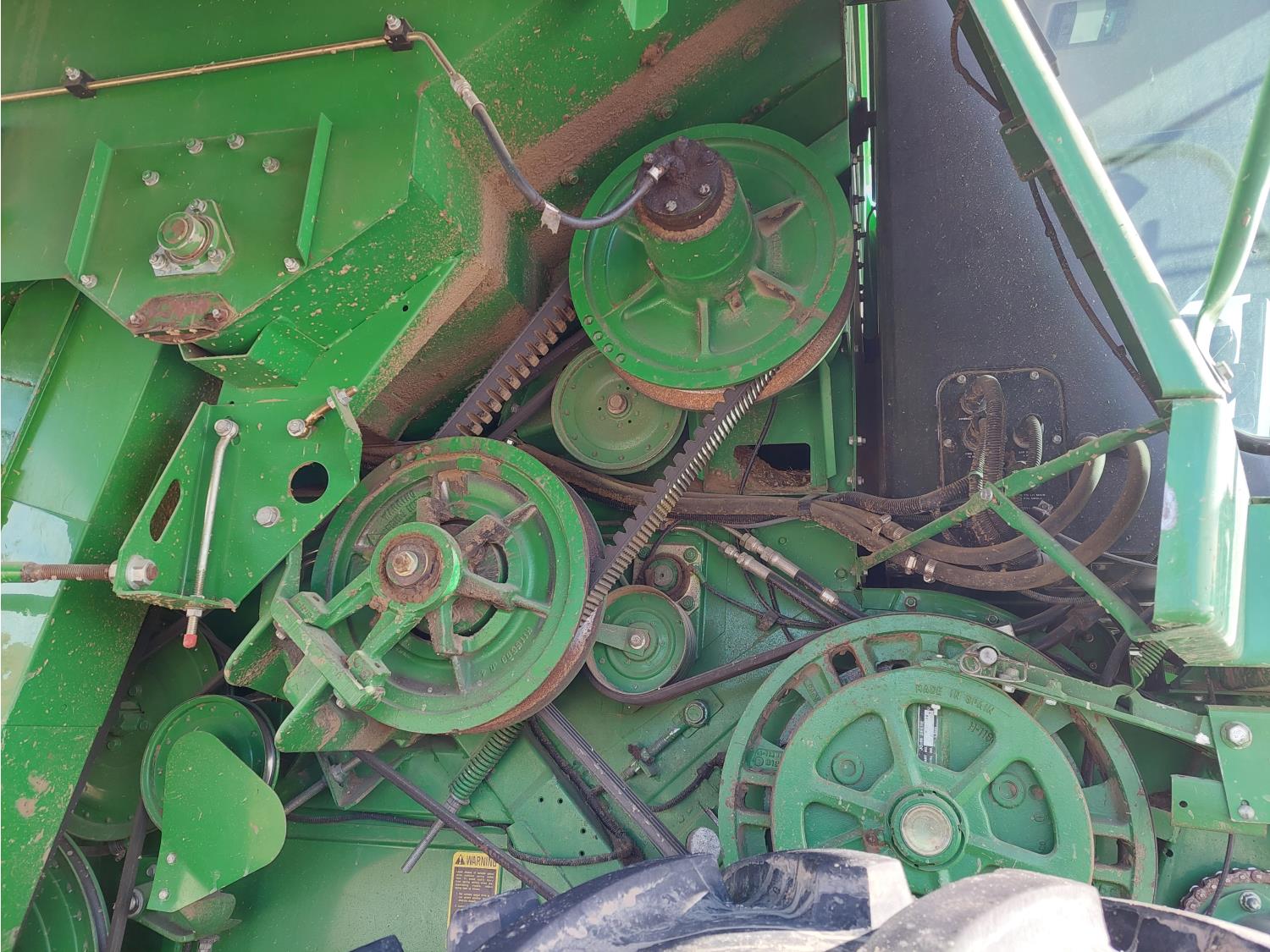 John Deere pick-up header, variable speed reel, auto header height, reverser, rock trap, chopper, 30 ft auger, Big Top grain tank extensions, slow down kit for beans , A/C, radio, air ride seat, buddy seat, 24.5-32 front tires, 11.25-24 rear tires