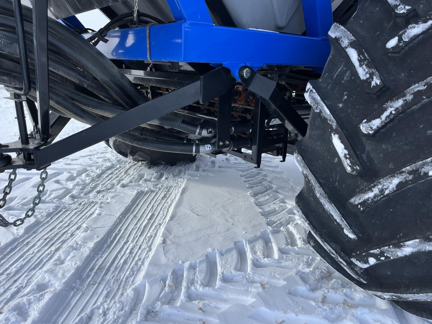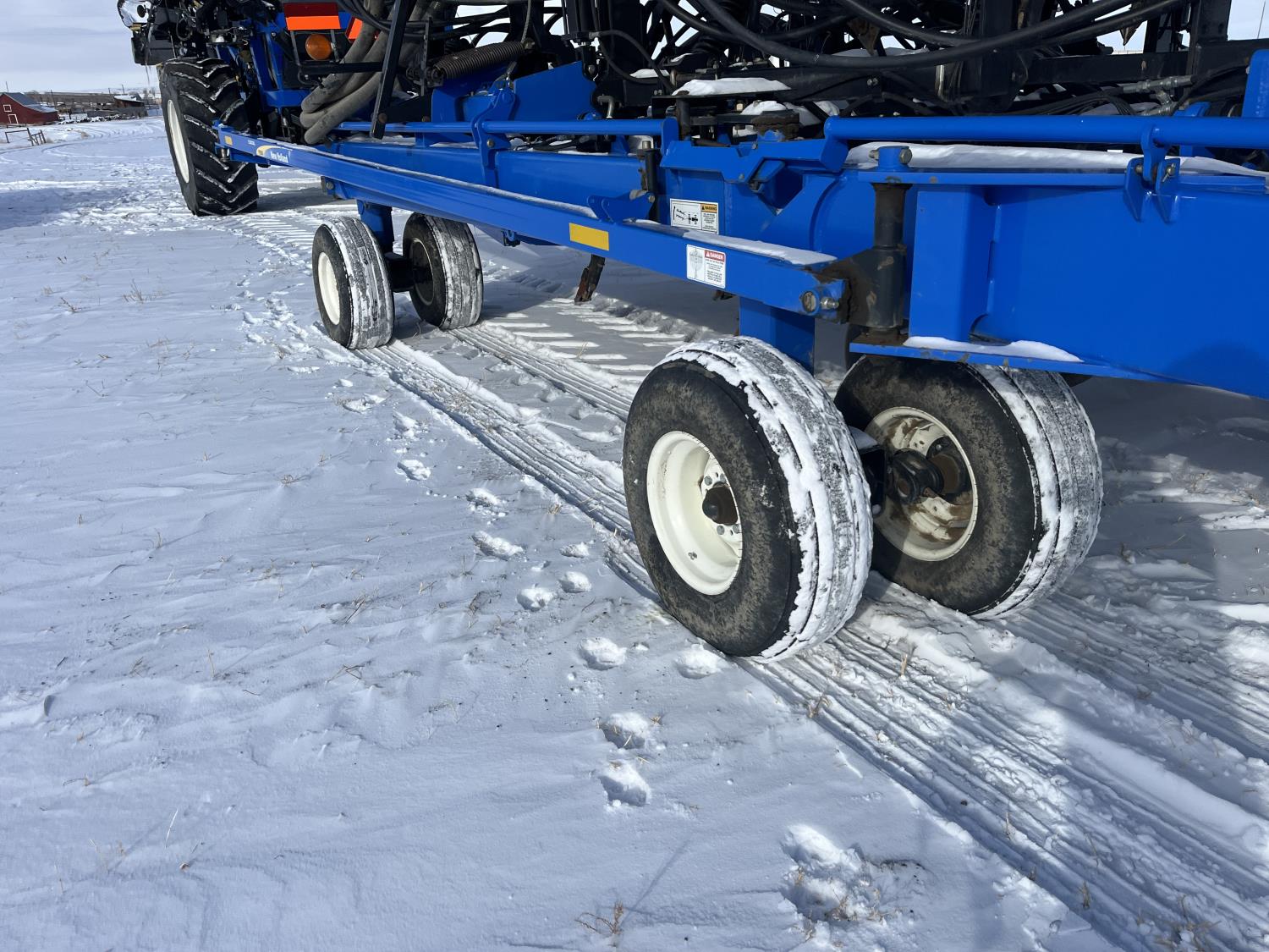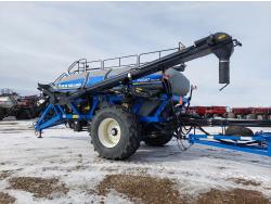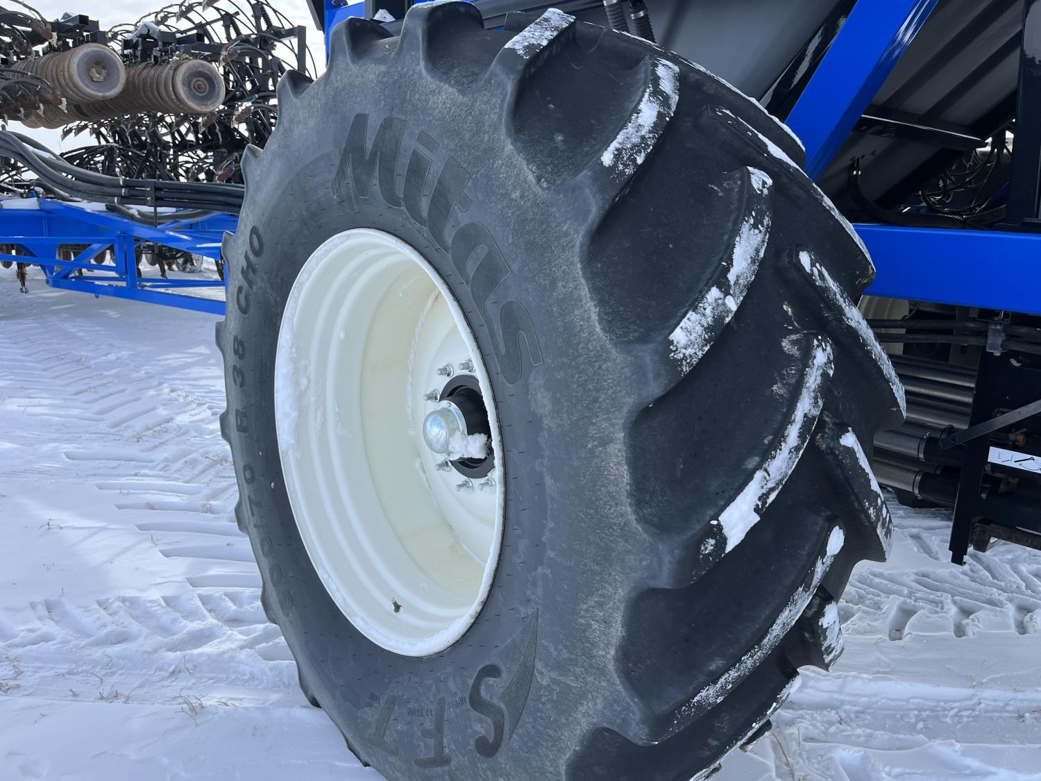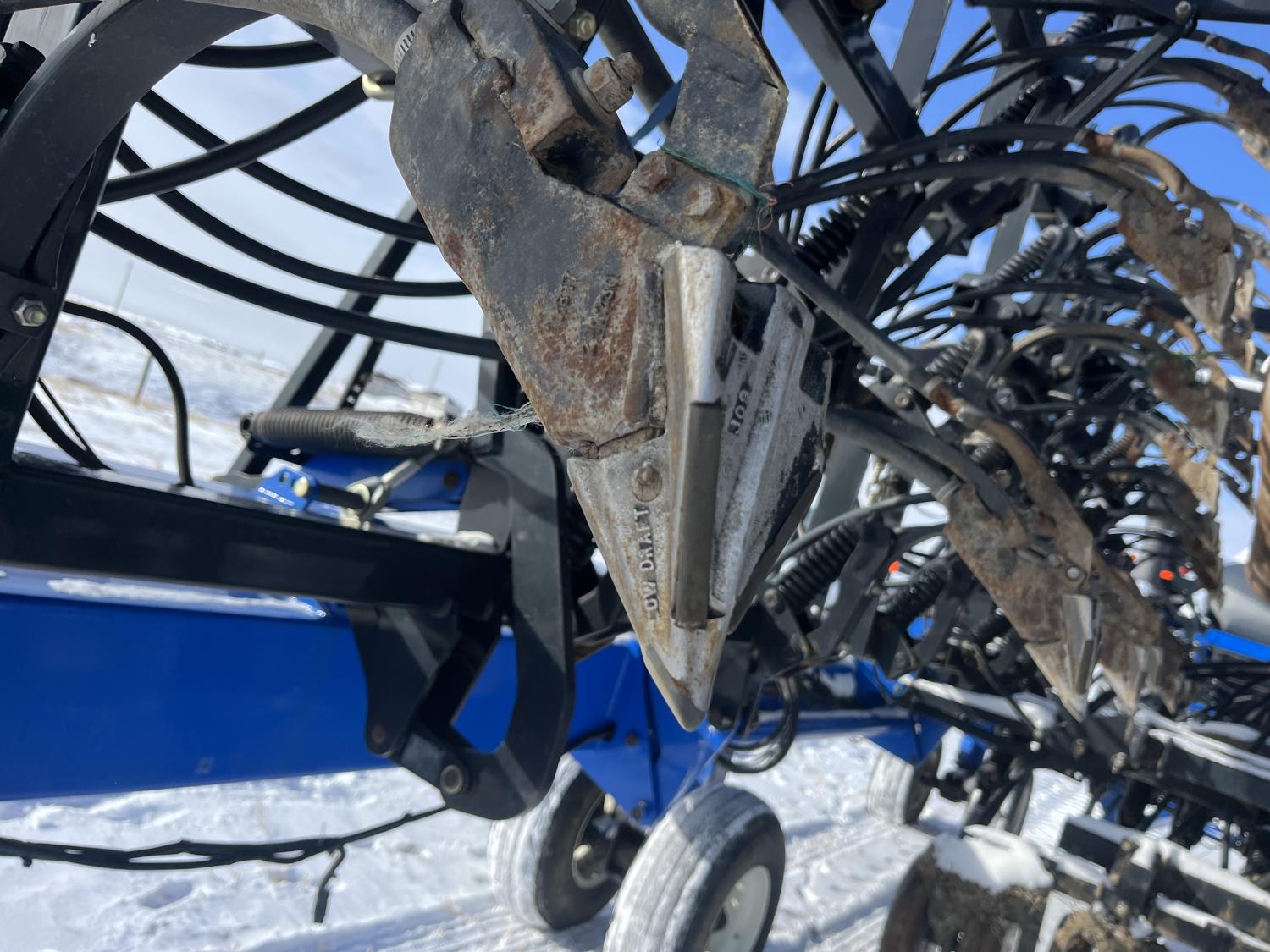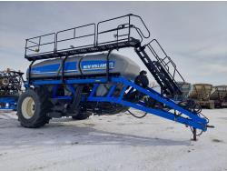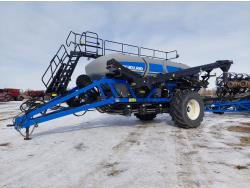 10 inch spacing, double shoot 3.5 inch Dutch openers, 4.5 inch steel packers, seed monitor, Air Cart: 4 compartments, 15 inch loading conveyor, double fan, sectional control, 800/70R33 tires, 30,100 acres seeded on cart, approx 45,000 acres seeded on drill, canola tank, New Holland Intelliview monitor