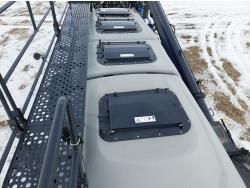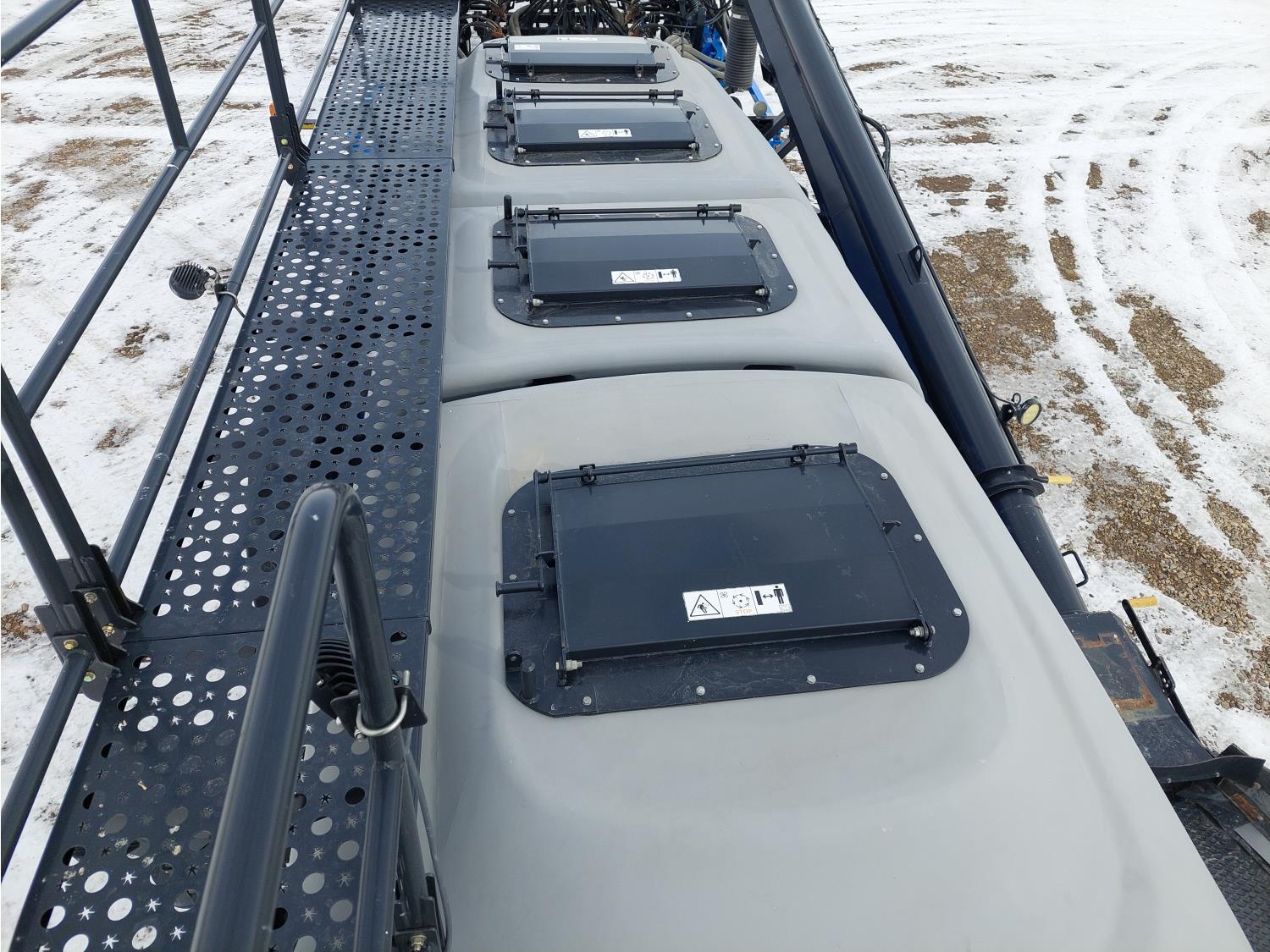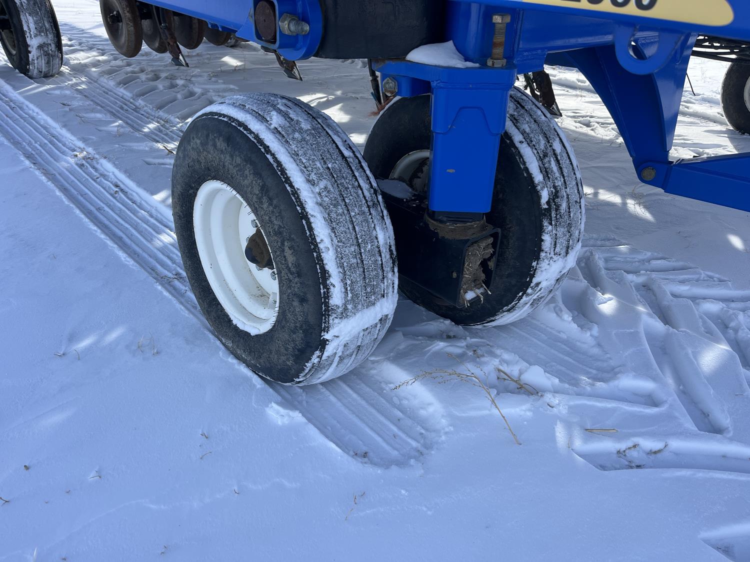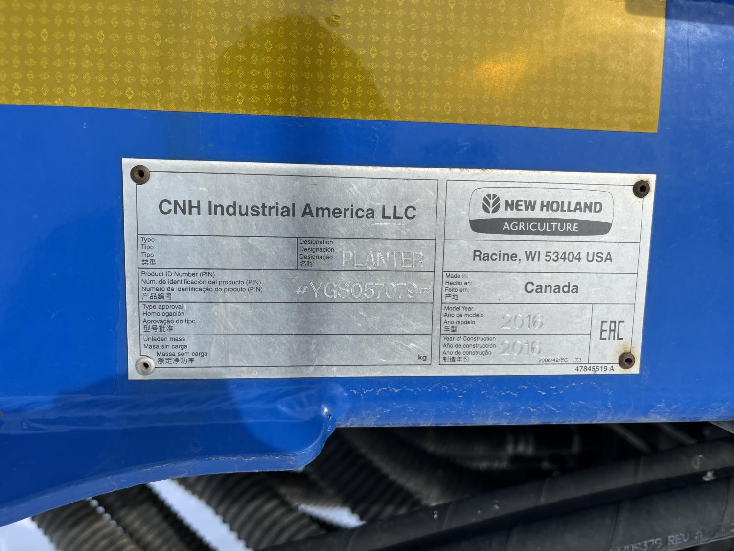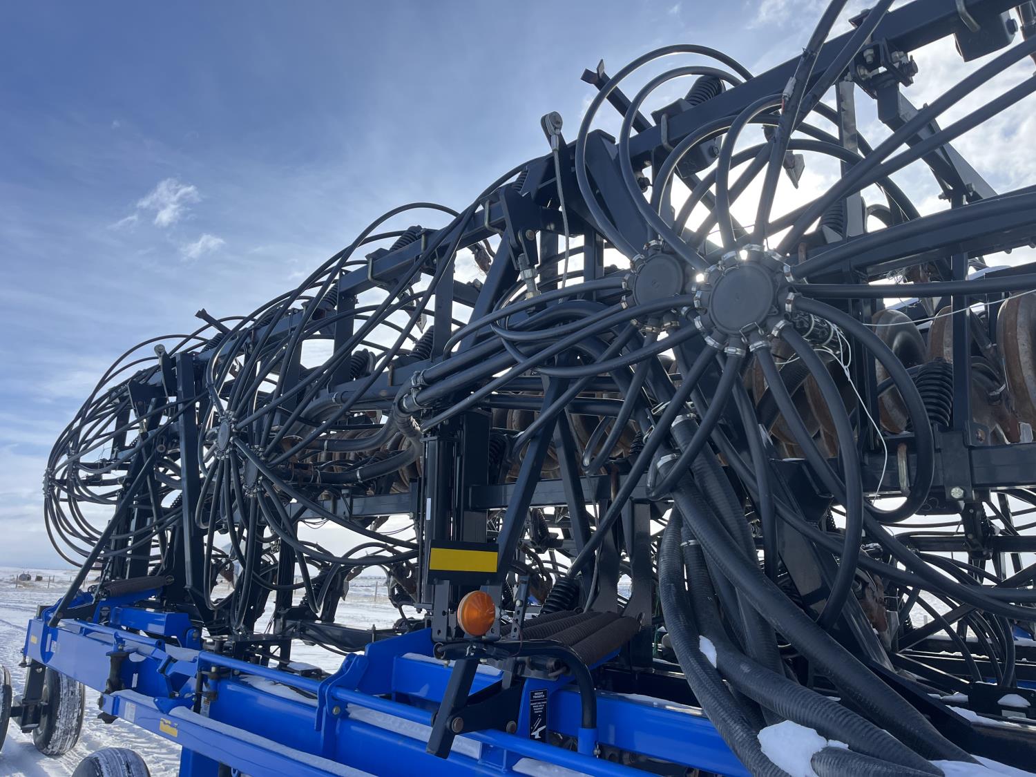 10 inch spacing, double shoot 3.5 inch Dutch openers, 4.5 inch steel packers, seed monitor, Air Cart: 4 compartments, 15 inch loading conveyor, double fan, sectional control, 800/70R33 tires, 30,100 acres seeded on cart, approx 45,000 acres seeded on drill, canola tank, New Holland Intelliview monitor
