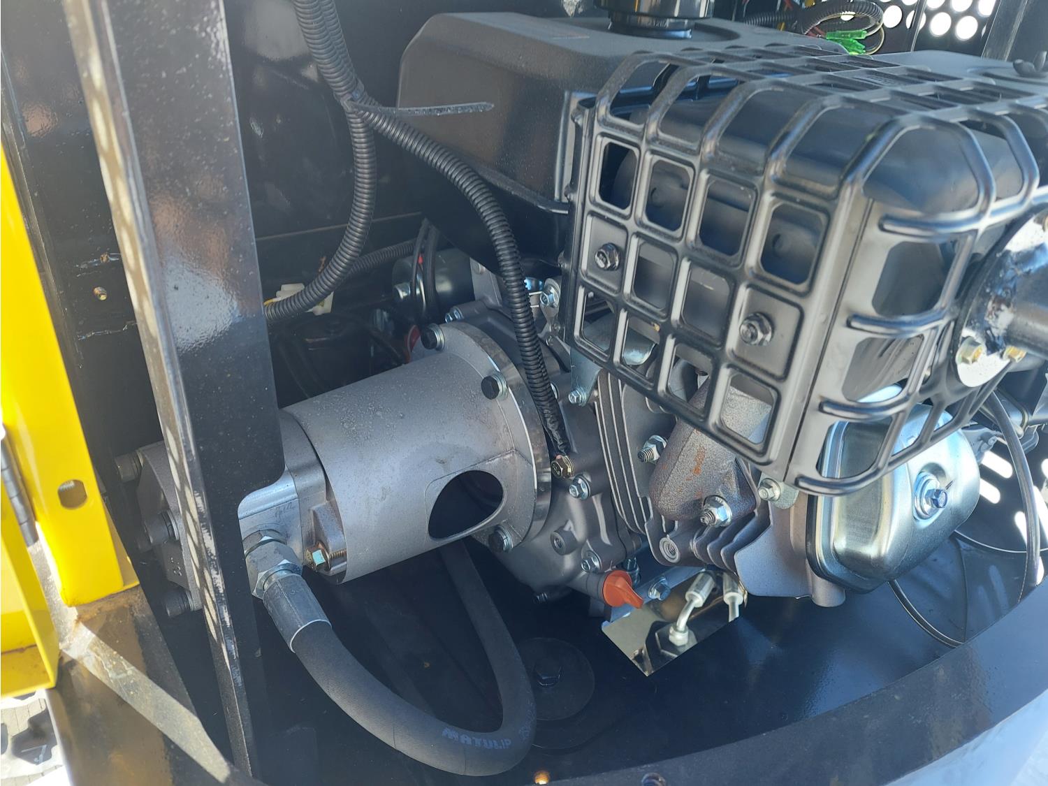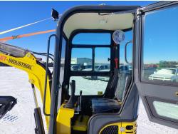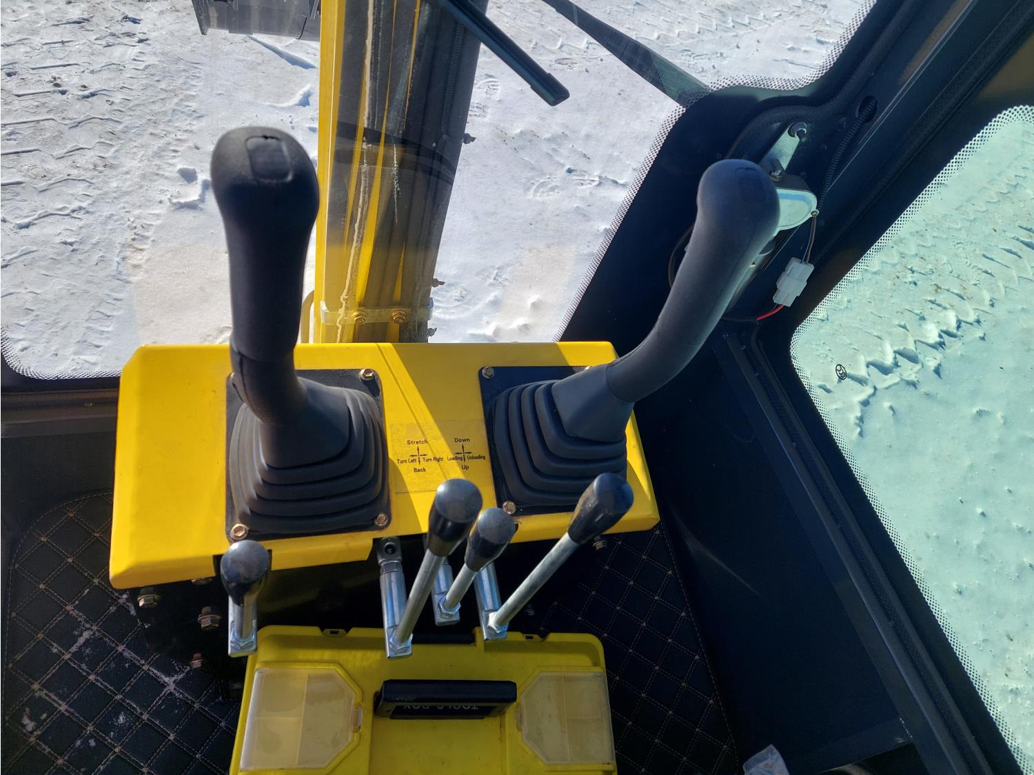 Enclosed cab, 15 HP gas engine, 16 inch dig bucket, manual thumb, 2 Ft 4 inch stick, 39 inch backfill blade, 7 inch rubber tracks