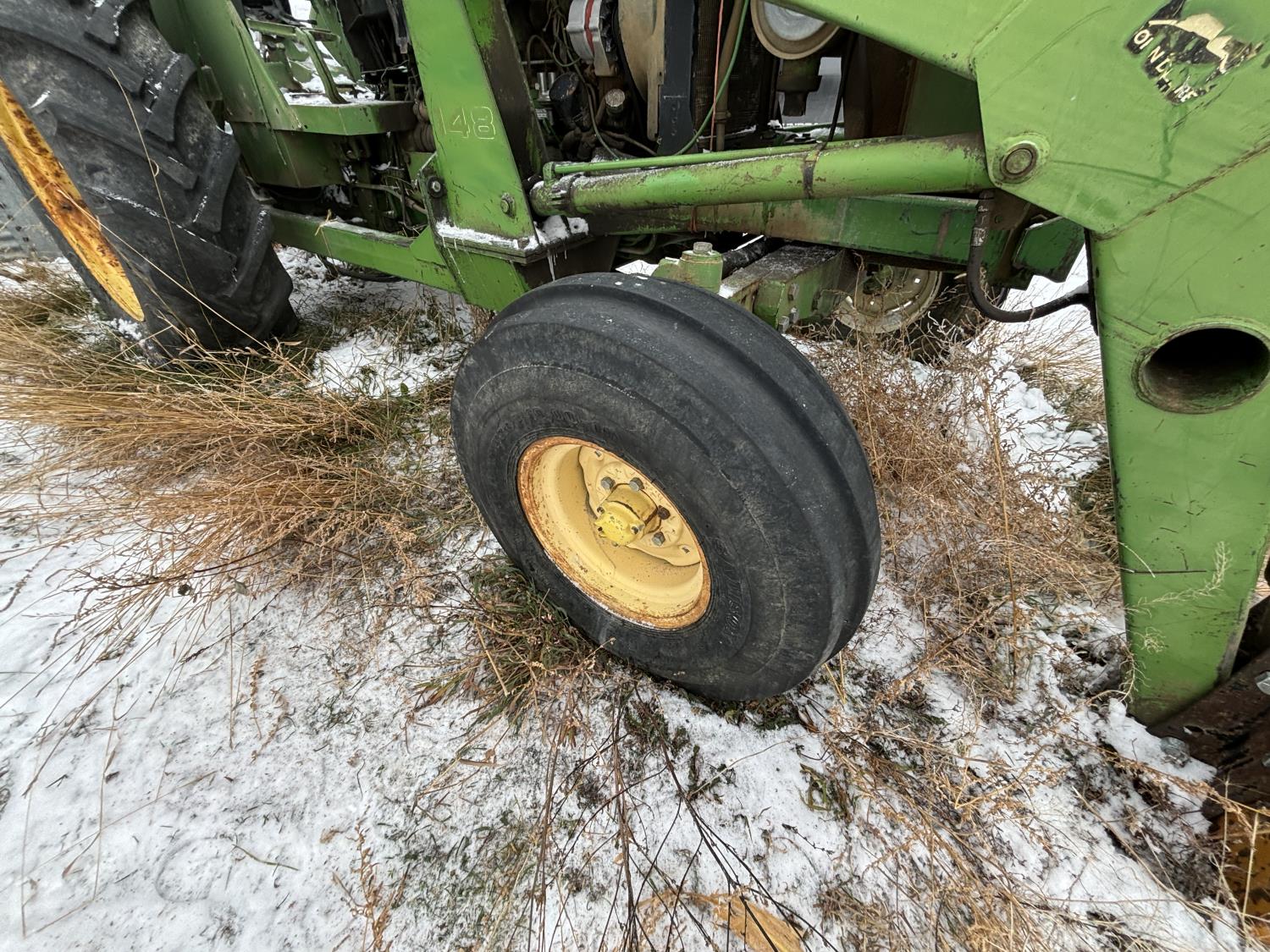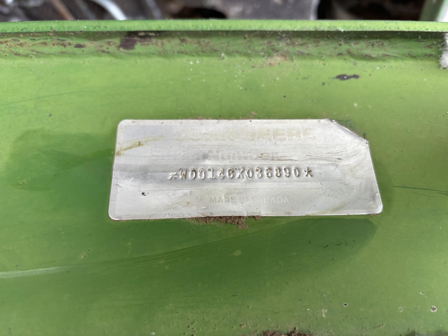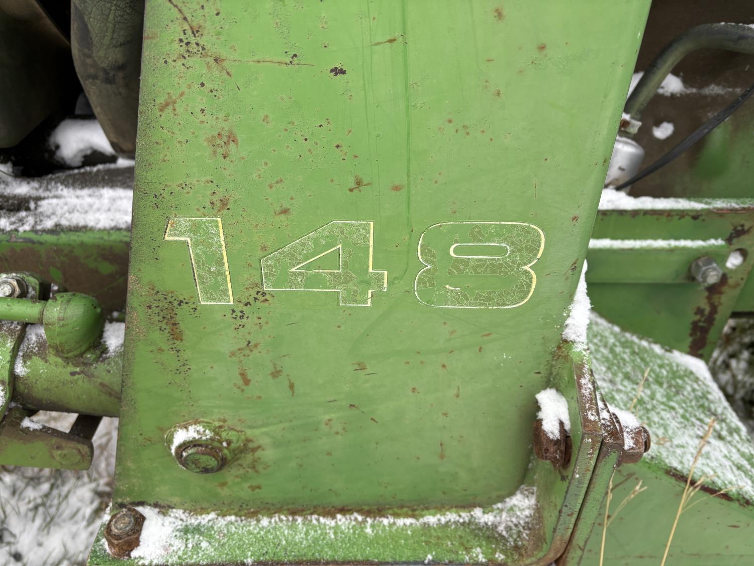 John Deere 148 loader, 54 inch bale forks,John Deere 5.9 L 6 cylinder 97 HP, diesel engine, 84 PTO HP, 16 speed partial synchro transmission, open station platform, 540 PTO, 3 point hitch, 2 rear hydraulic outlets, rear wheel weights, 10.00-16 front tires, 18.4-34 rear tires