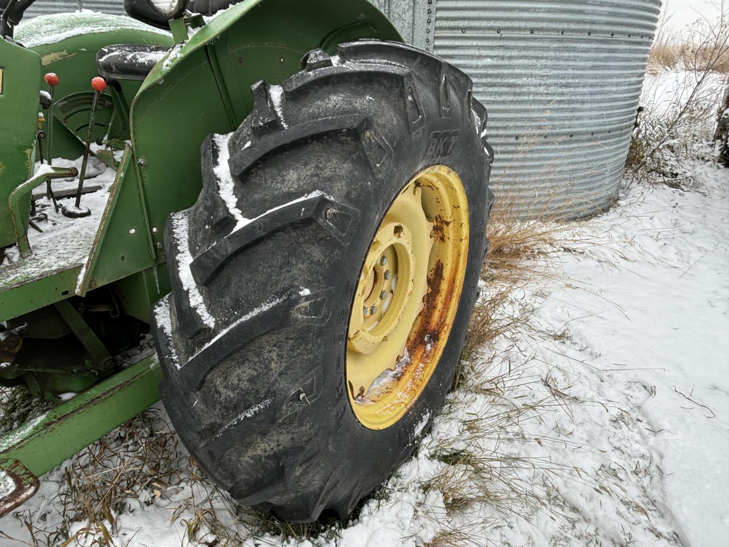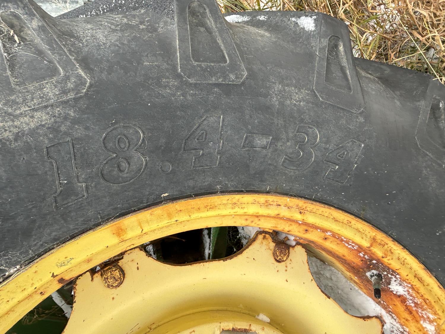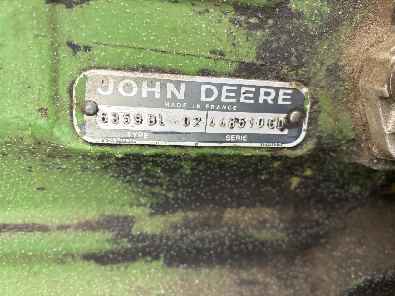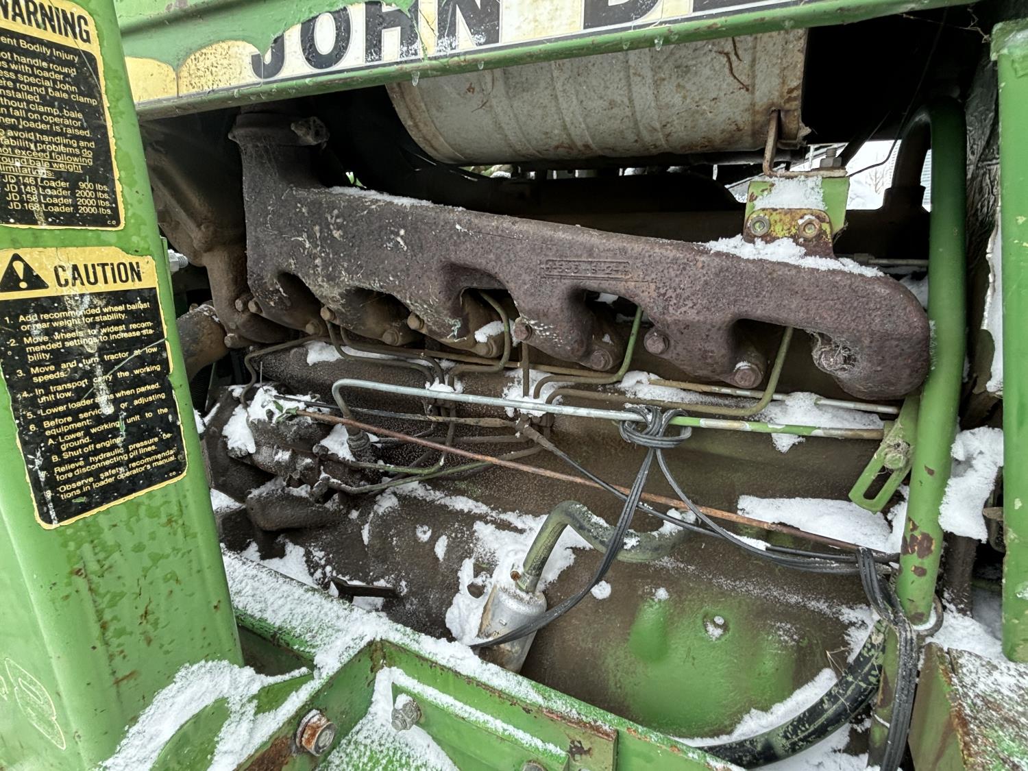 John Deere 148 loader, 54 inch bale forks,John Deere 5.9 L 6 cylinder 97 HP, diesel engine, 84 PTO HP, 16 speed partial synchro transmission, open station platform, 540 PTO, 3 point hitch, 2 rear hydraulic outlets, rear wheel weights, 10.00-16 front tires, 18.4-34 rear tires