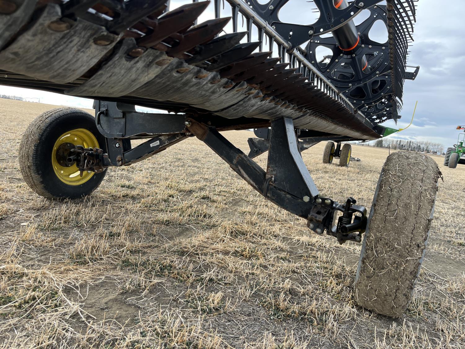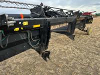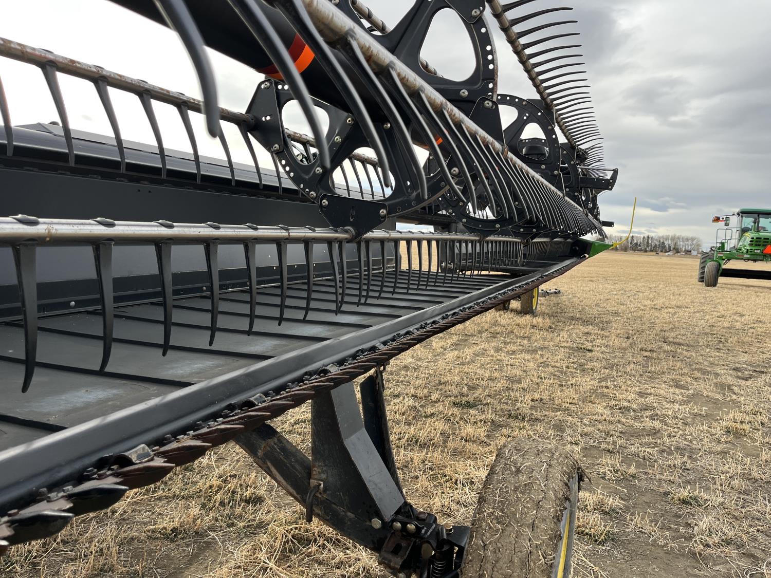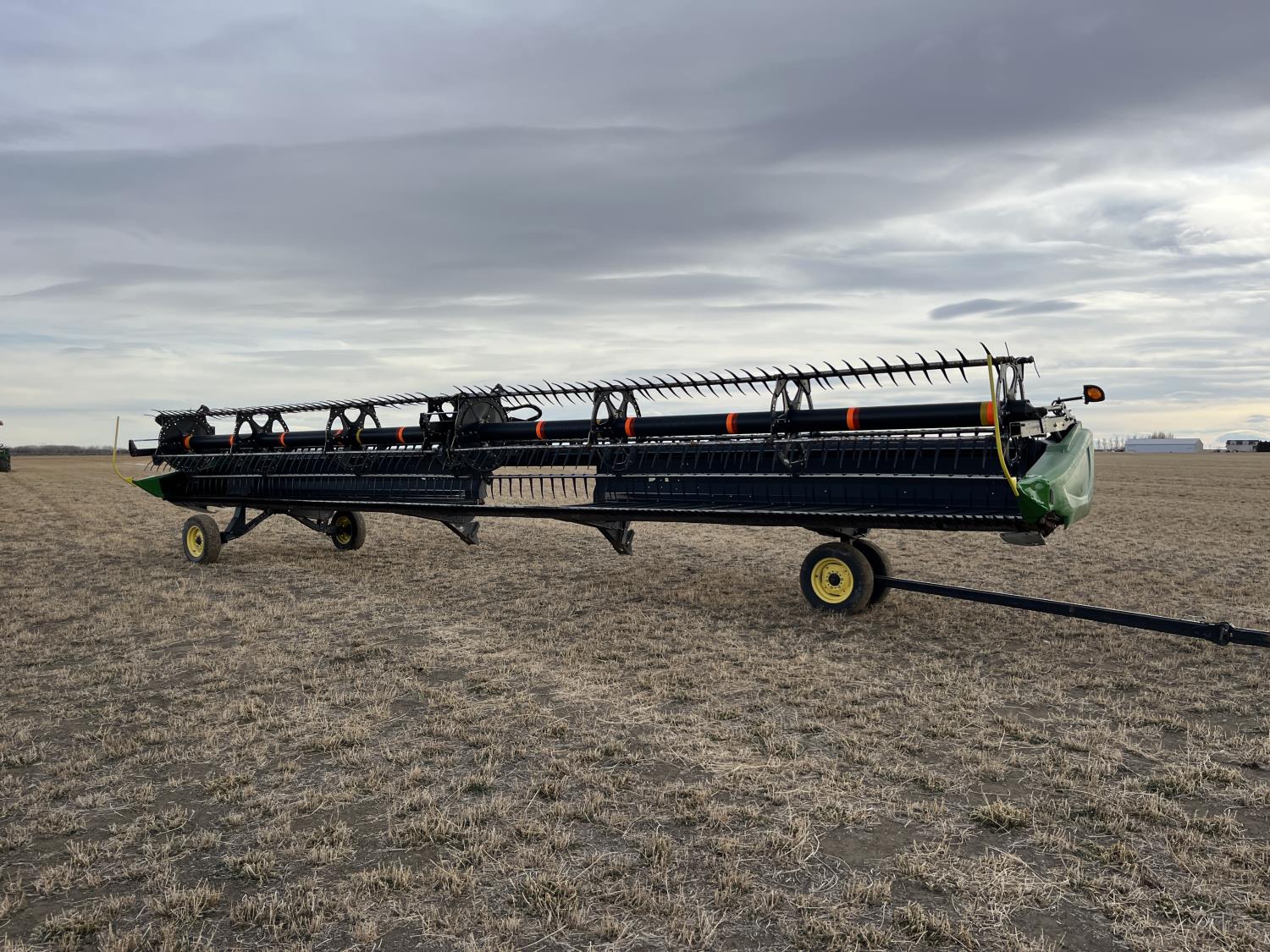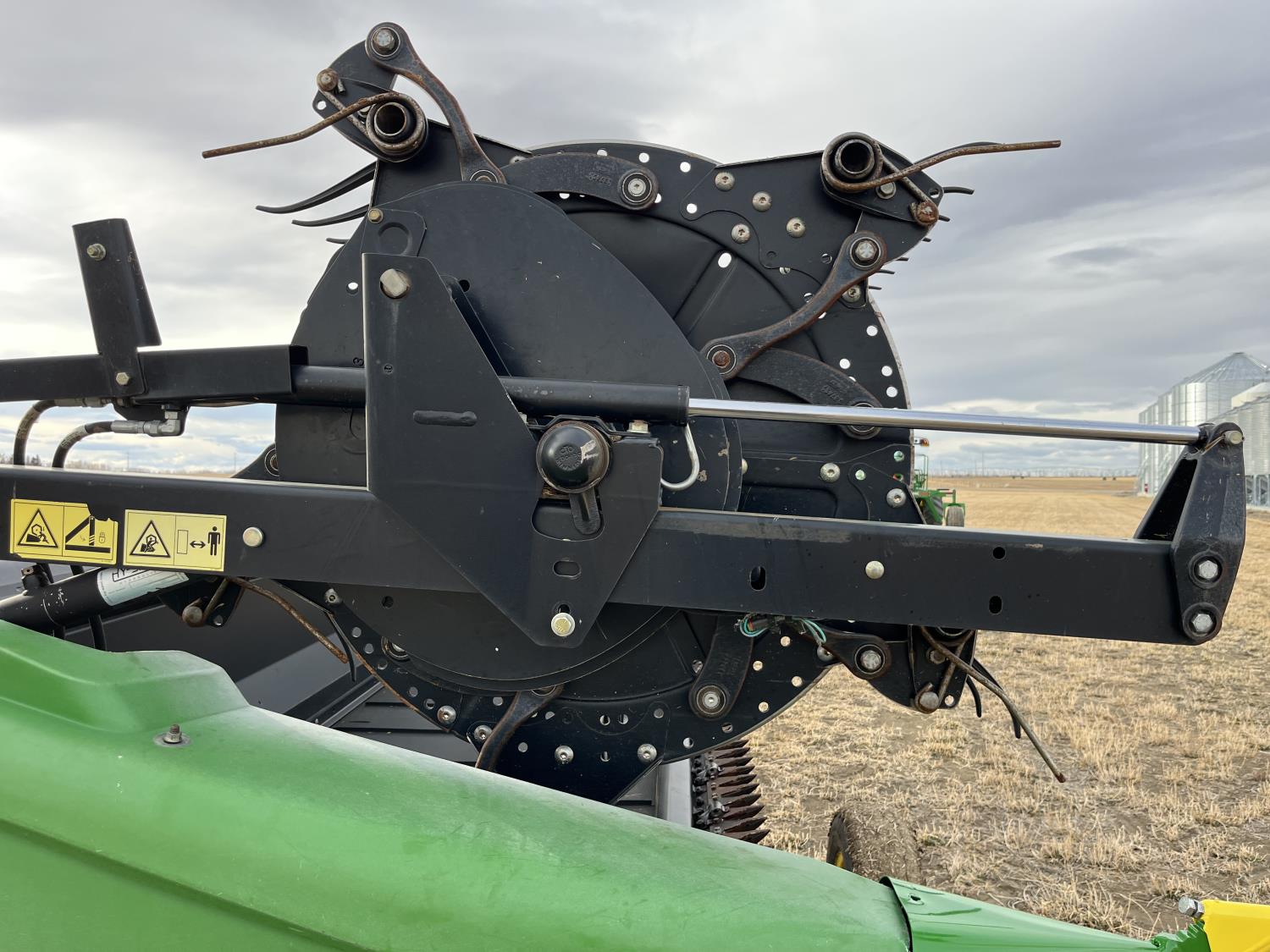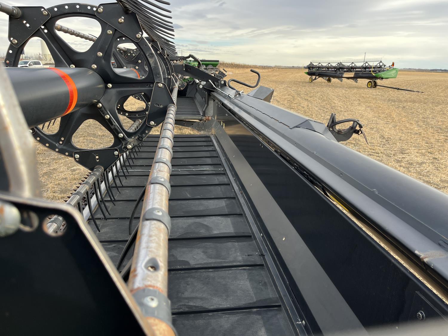 center delivery, split pickup reels, fore & aft, double knife drive, poly skid plates, crop dividers, factory transport, triple delivery ready but requires hydraulic kit