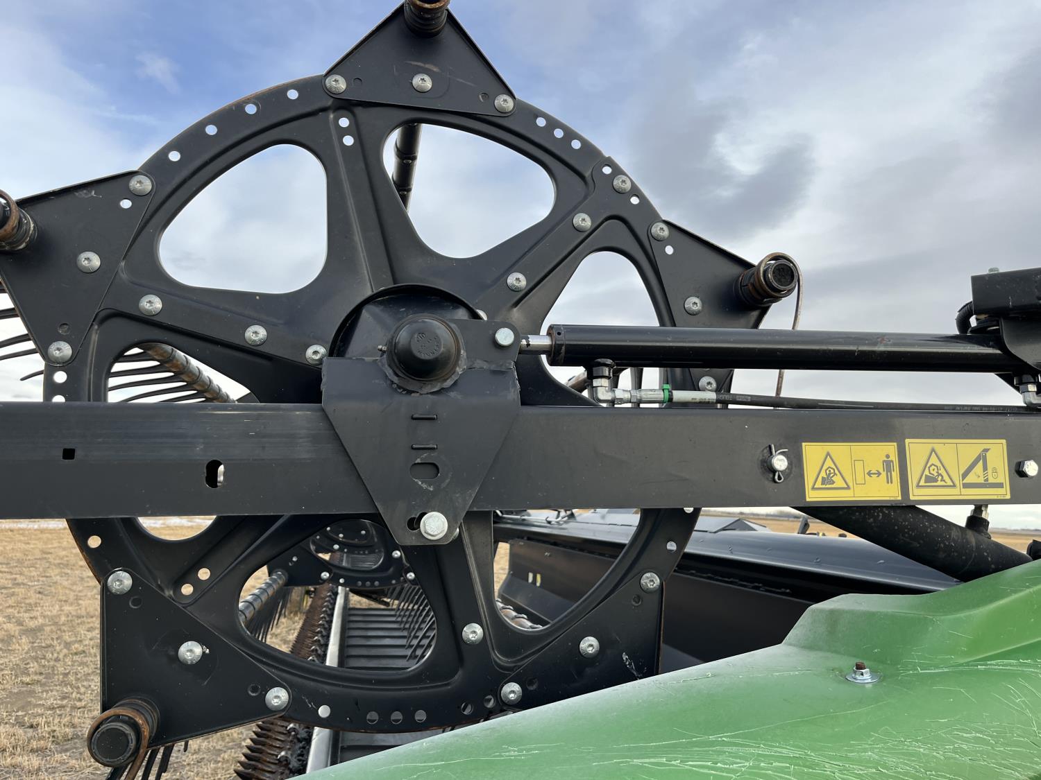 center delivery, split pickup reels, fore & aft, double knife drive, poly skid plates, crop dividers, factory transport, triple delivery ready but requires hydraulic kit