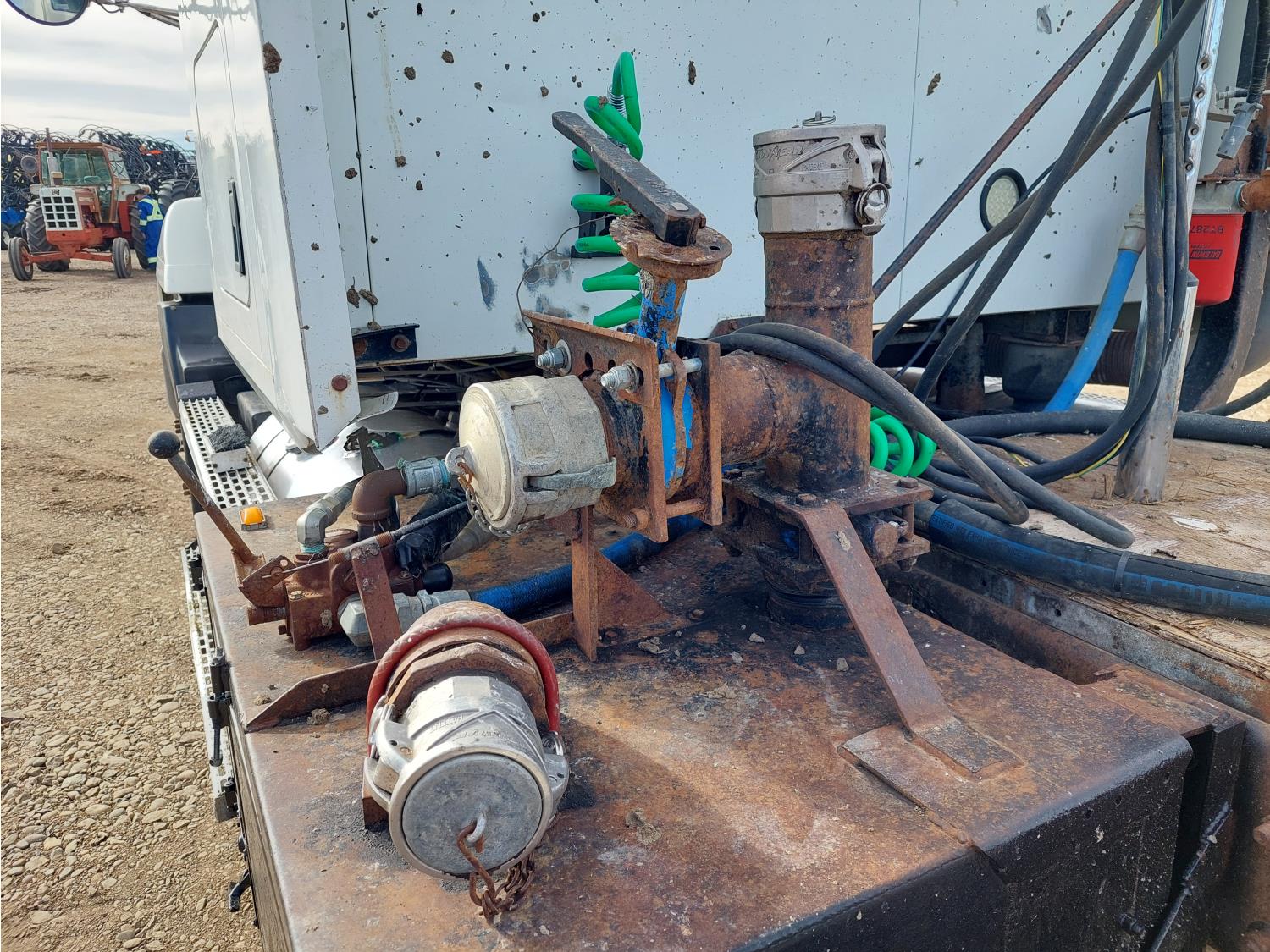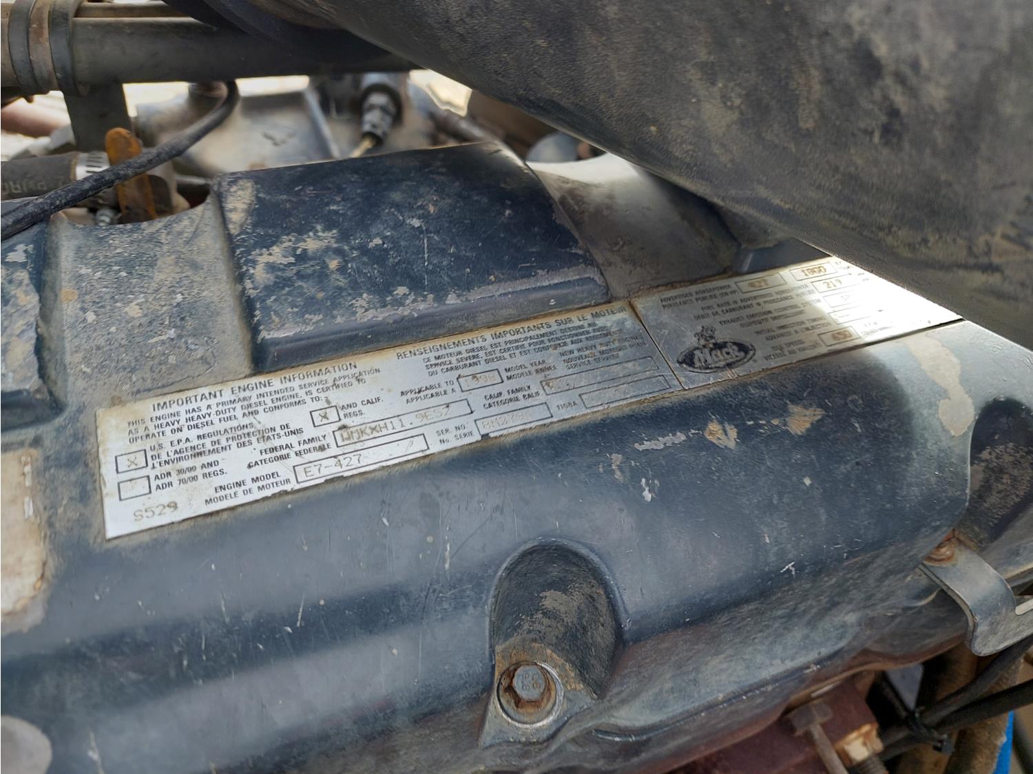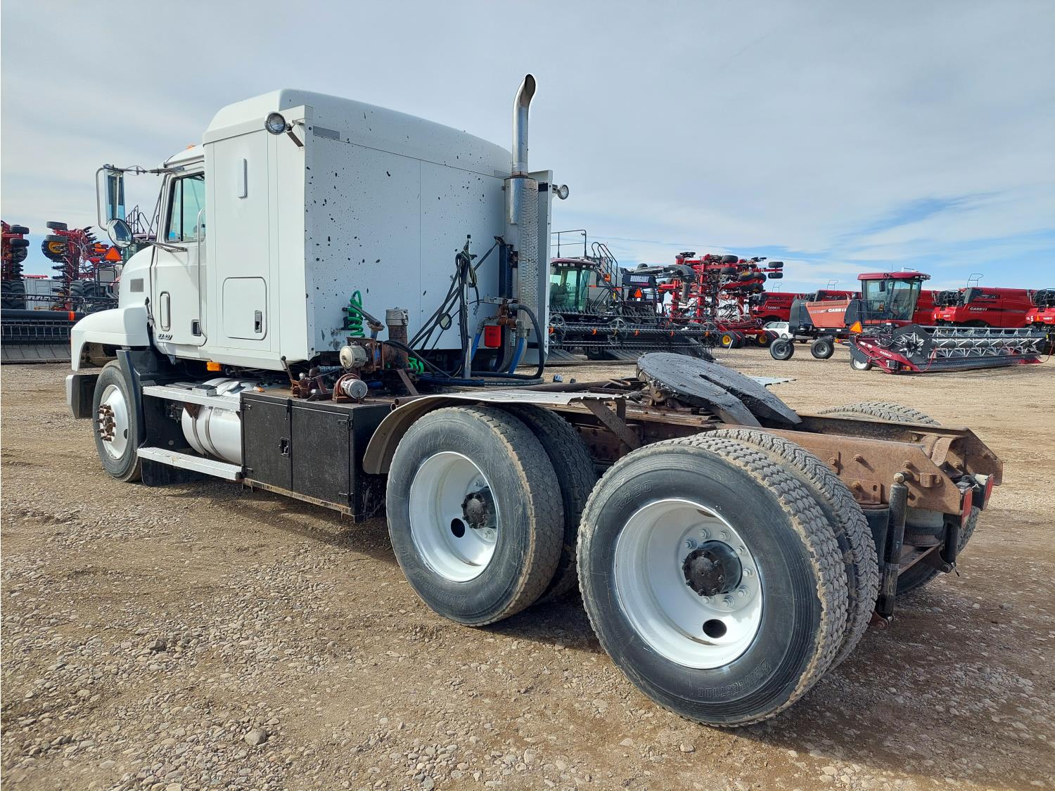 Mack E7-427 12.0 L 6 cylinder engine, engine brake, engine block heater, Maxitorque T2180 18 speed manual transmission, flat top 48 inch sleeper, A/C, cruise control, air ride driver seat, air ride cab, hydraulic wet kit, Muncie PTO, air ride suspension, 12,000 lb front axle, 38,000 lb rear axles, 3 way diff locks, 200 inch WB, single frame, 11R2.45 tires