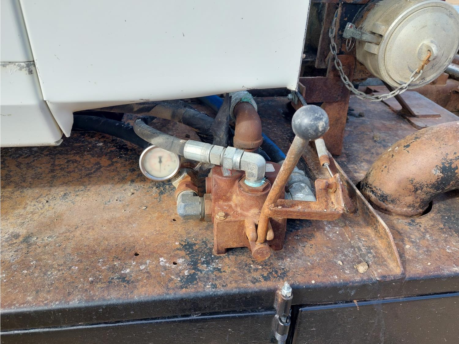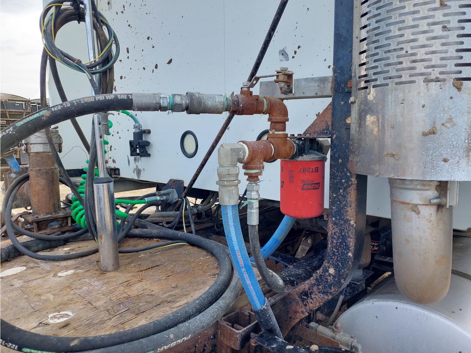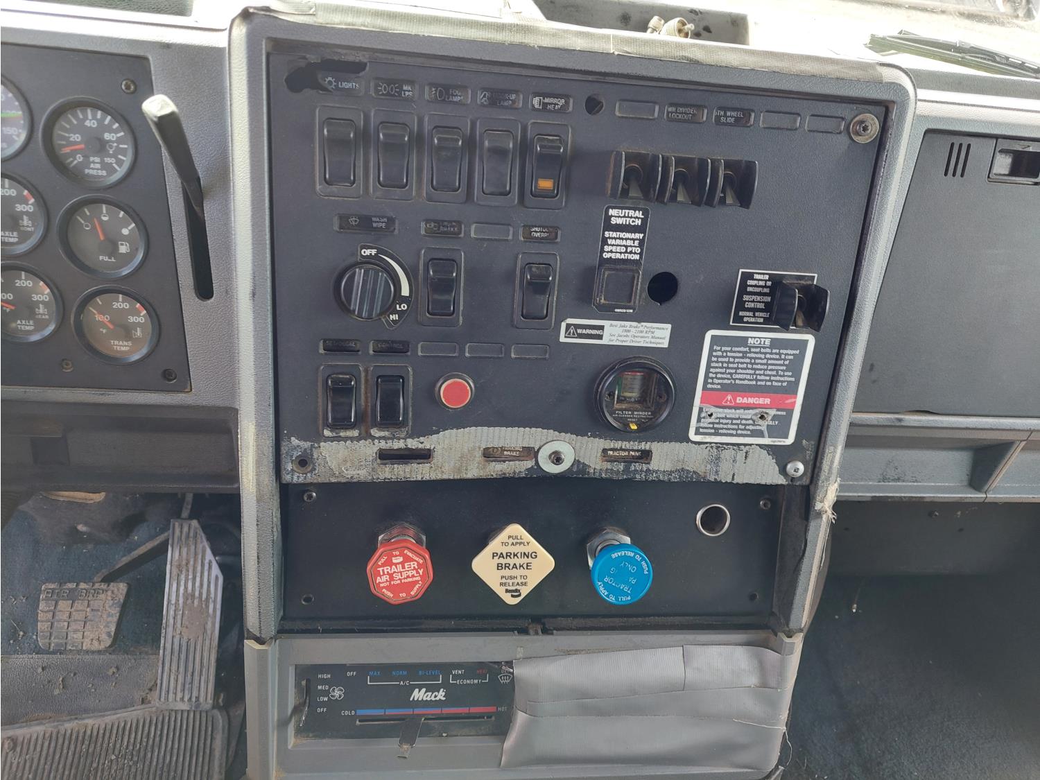 Mack E7-427 12.0 L 6 cylinder engine, engine brake, engine block heater, Maxitorque T2180 18 speed manual transmission, flat top 48 inch sleeper, A/C, cruise control, air ride driver seat, air ride cab, hydraulic wet kit, Muncie PTO, air ride suspension, 12,000 lb front axle, 38,000 lb rear axles, 3 way diff locks, 200 inch WB, single frame, 11R2.45 tires