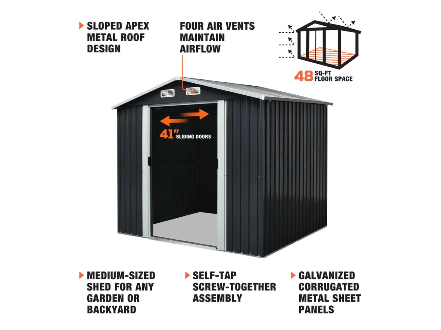 apex roof, 41 inch sliding door, 29 gauge corrugated metal, 67 inch edge height