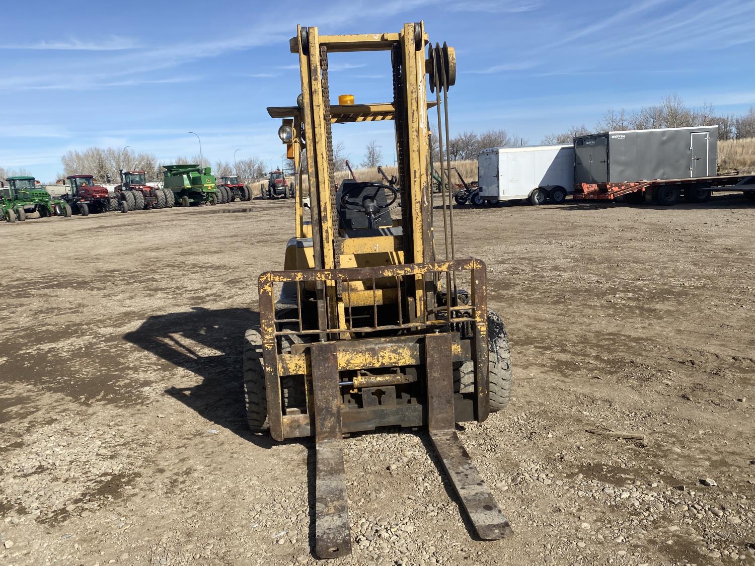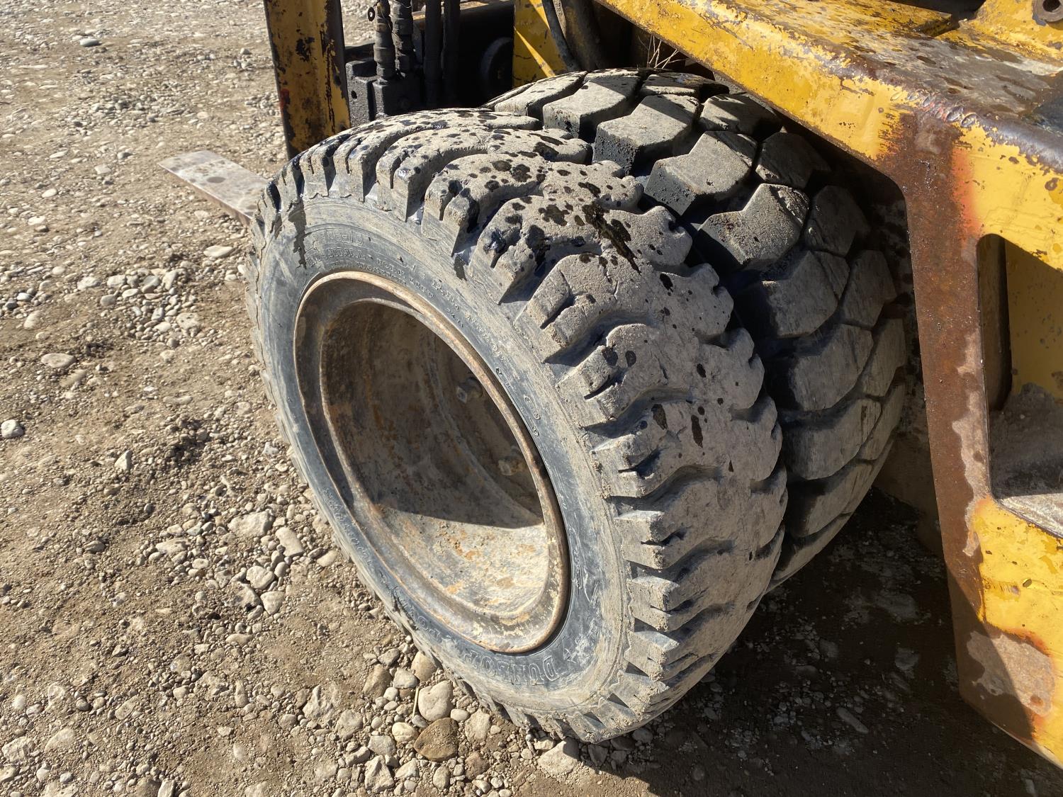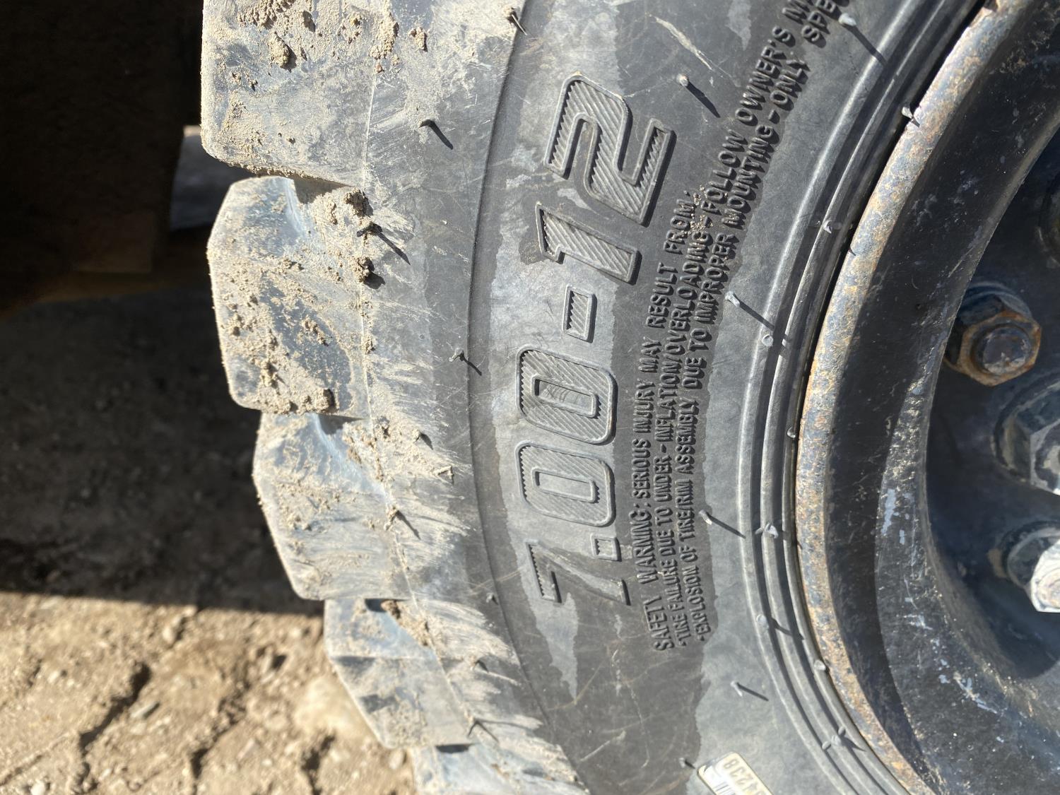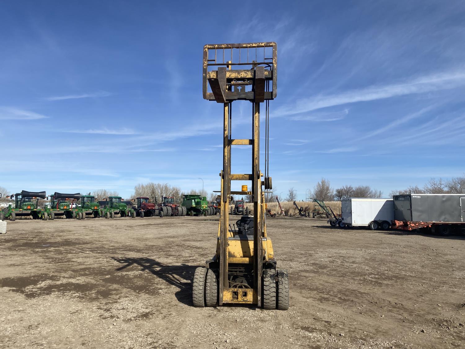 Open station with ROPS, gas, hydro transmission, left hand reverser, 8 ft 2 inch lowered mast height, 12 ft 1 in max lift height, 1 mast stages, 44 inch pallet forks, side shift, 28X8-15 front tires, 7-12 rear tires