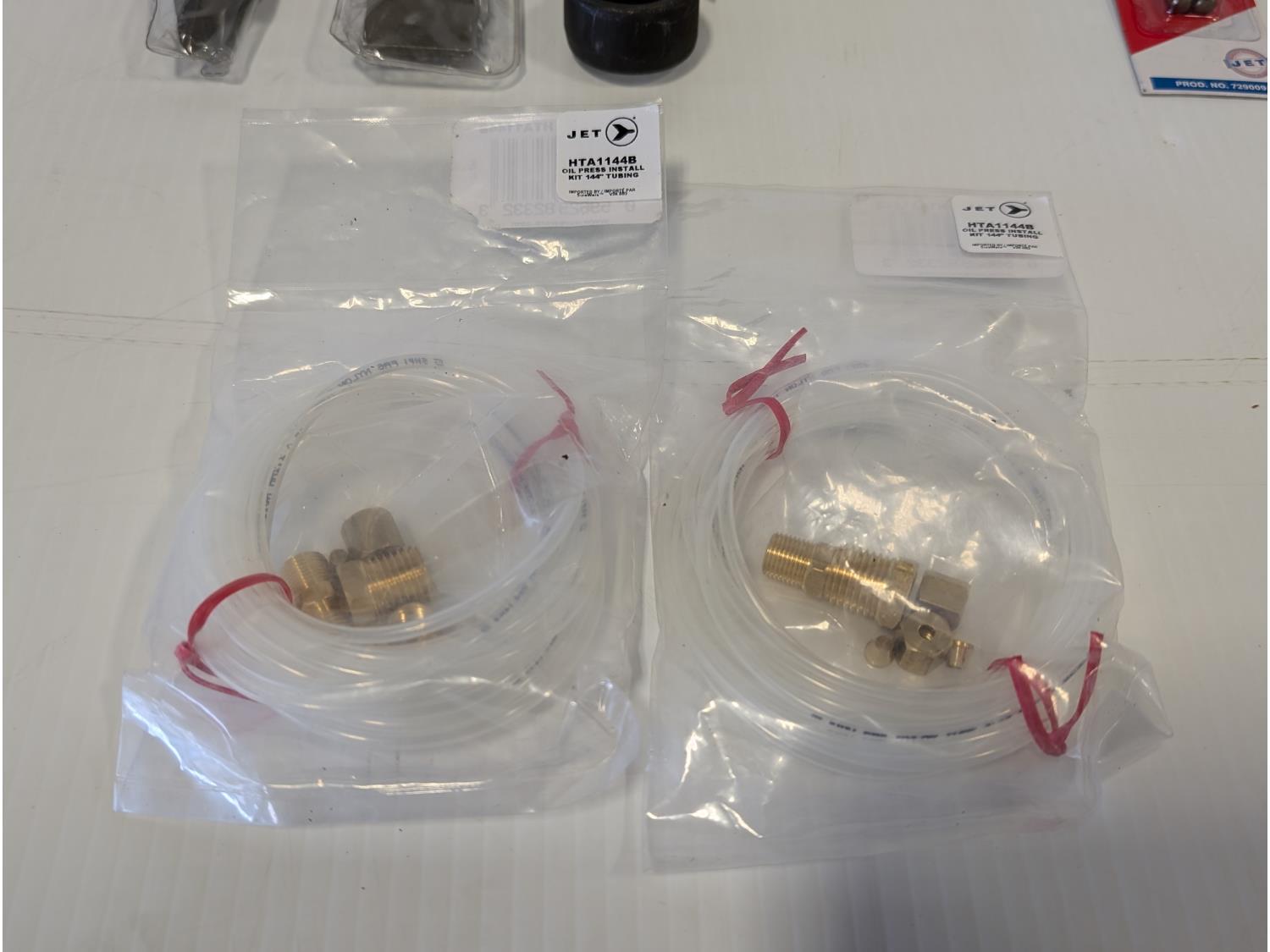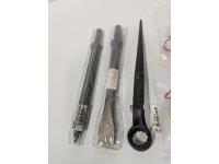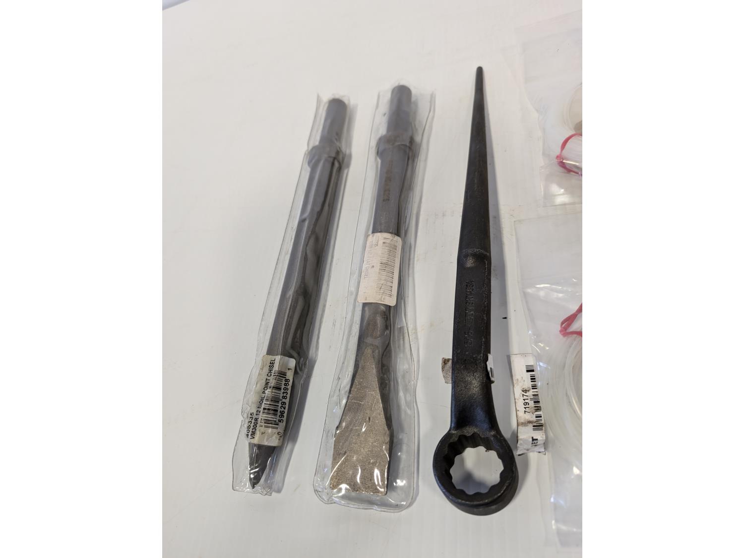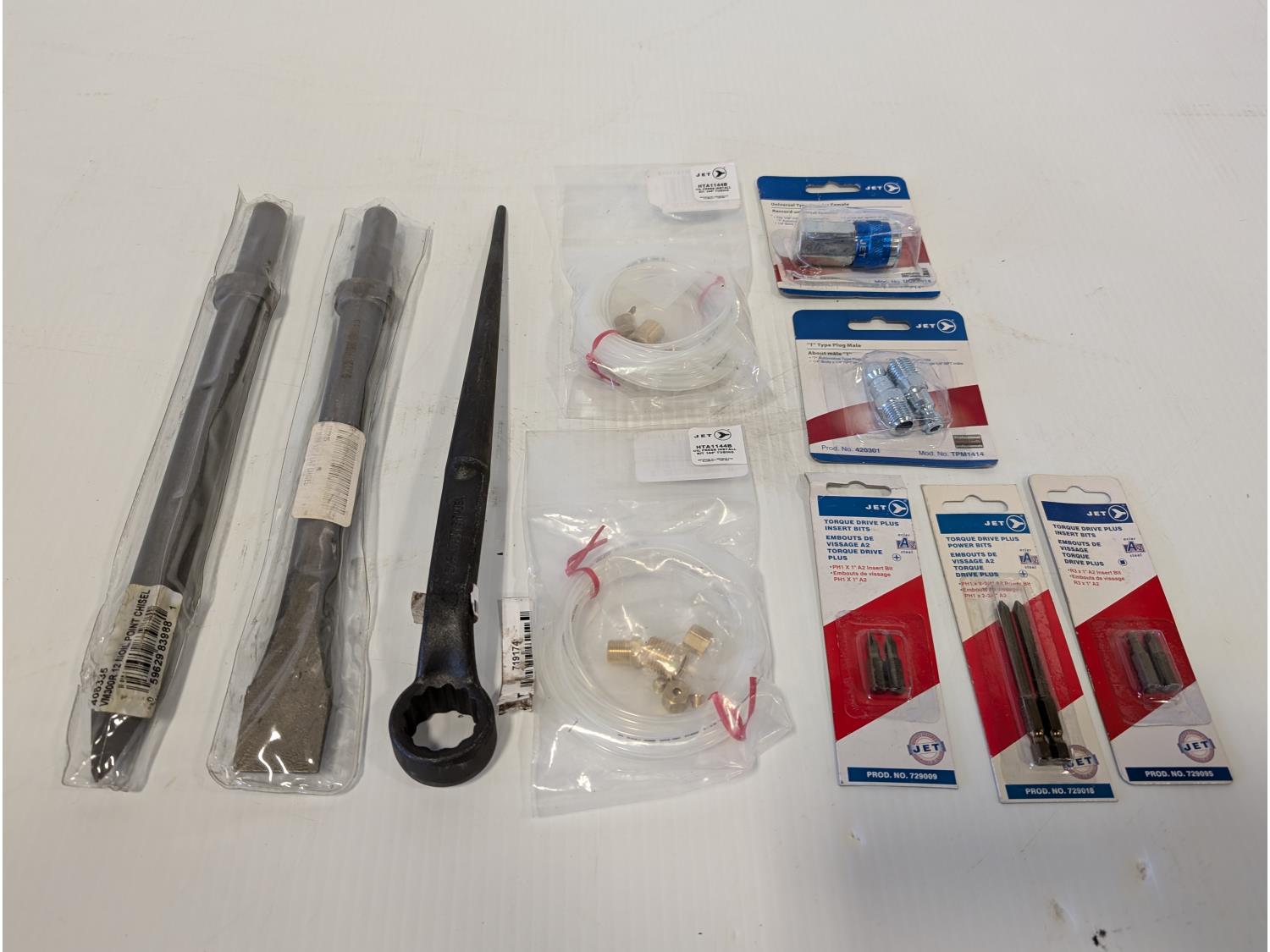 12 inch point chisel, 12 inch flat chisel, (2) oil press install kits 144 inch tubing, universal female coupler, "T" male plugs, torque bits
