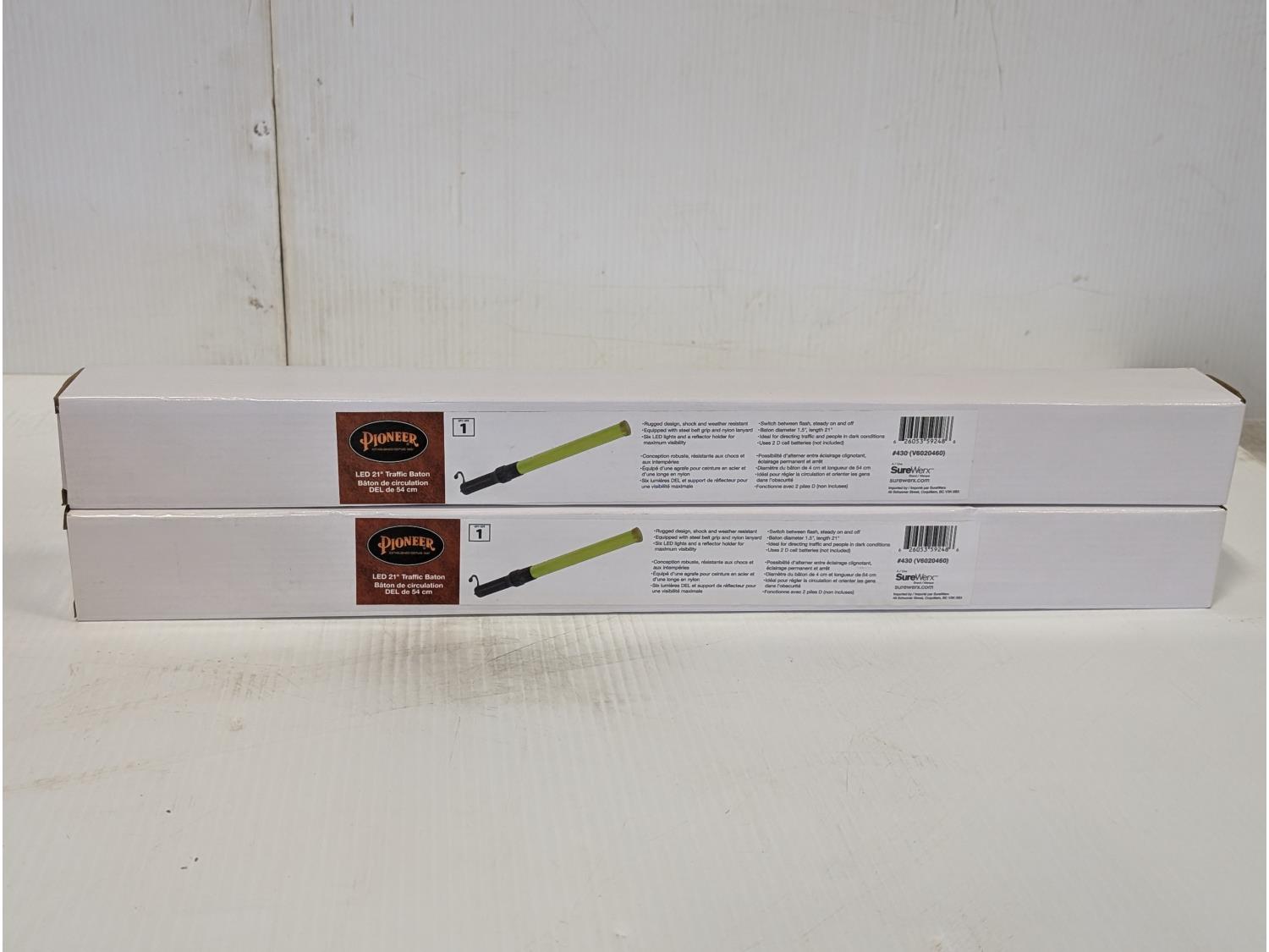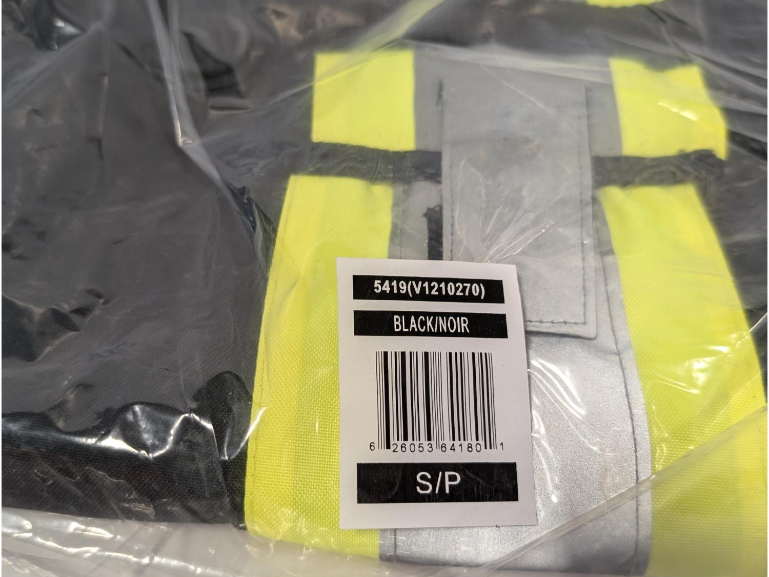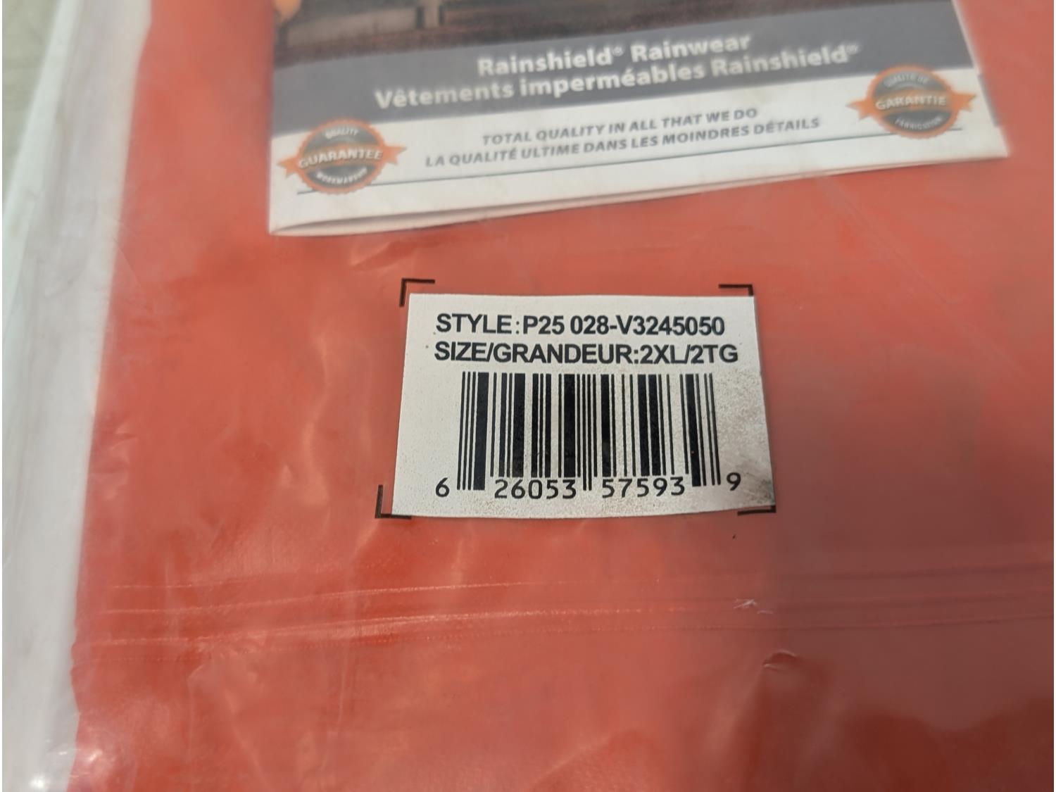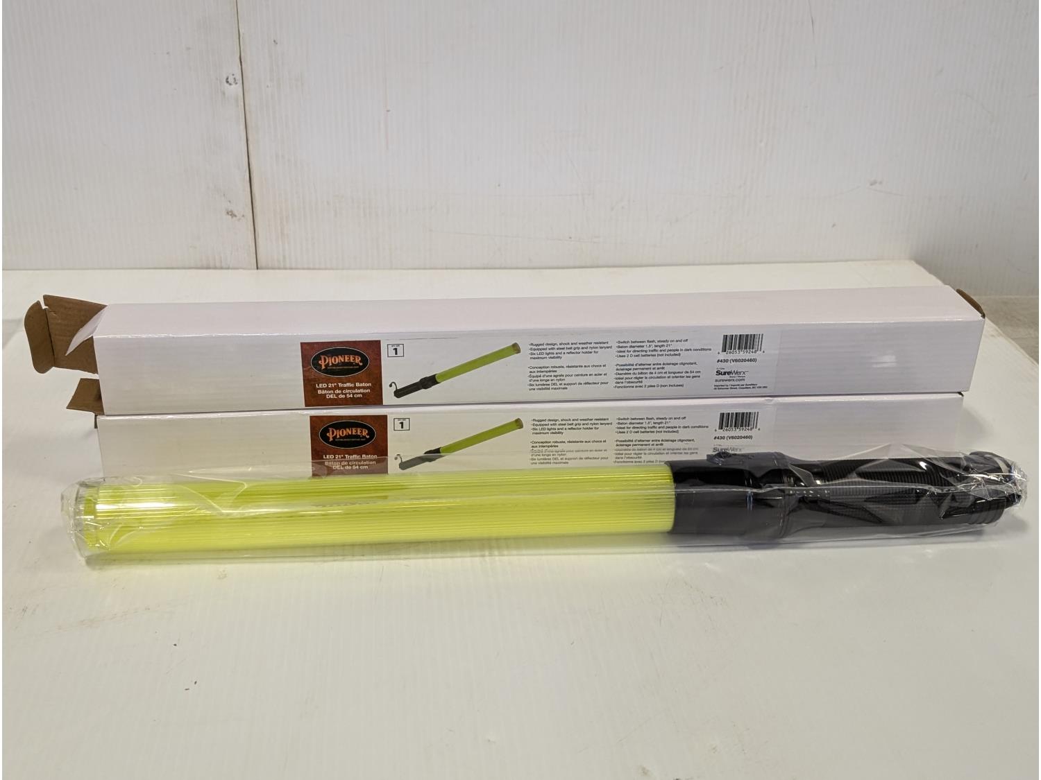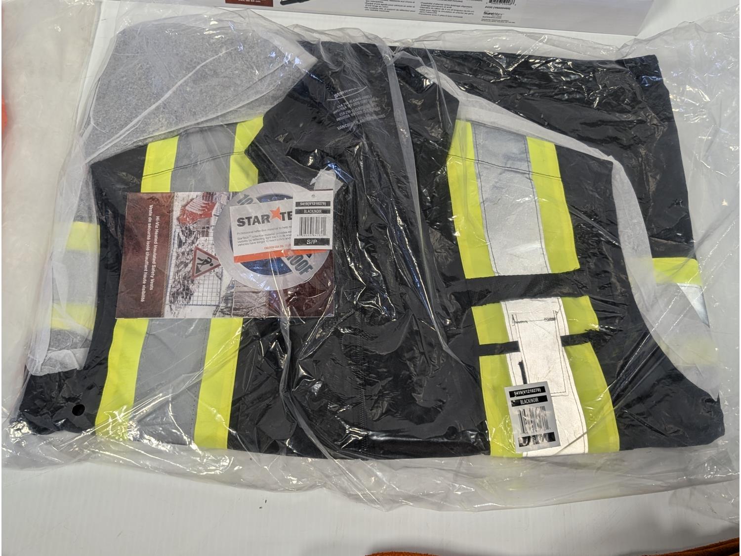 2XL rain pants, S safety vest, (2) 21 inch LED traffic batons, (8) pairs of size small Ranpro leather gloves