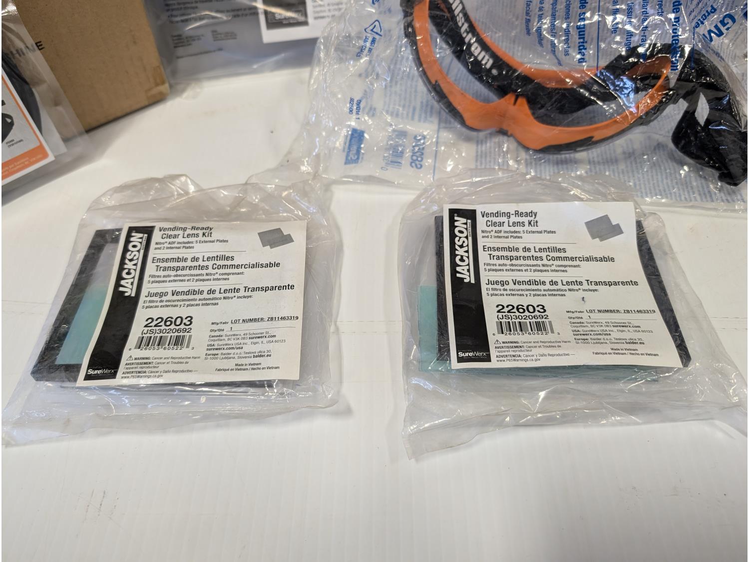qty of face masks, splash protection face shield assemblies, Sellstrom protective googles, jackson clear lens kits, (2) 21 inch LED traffic batons