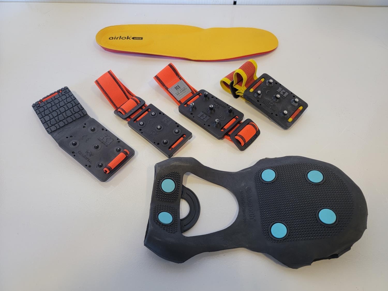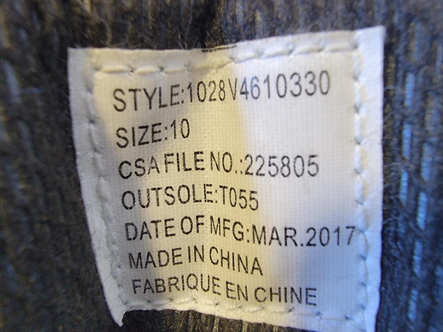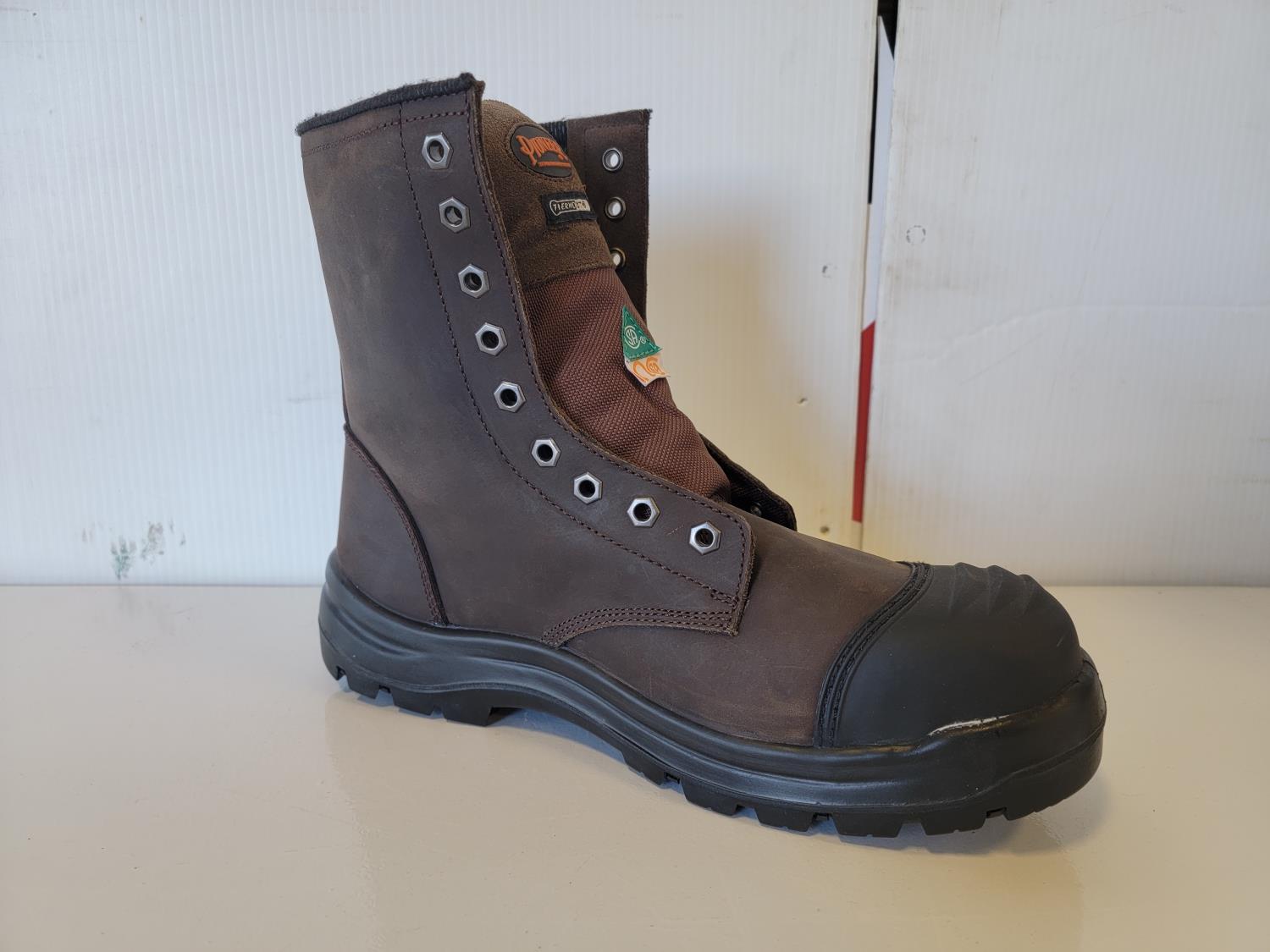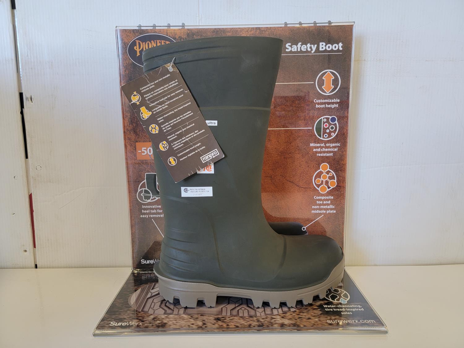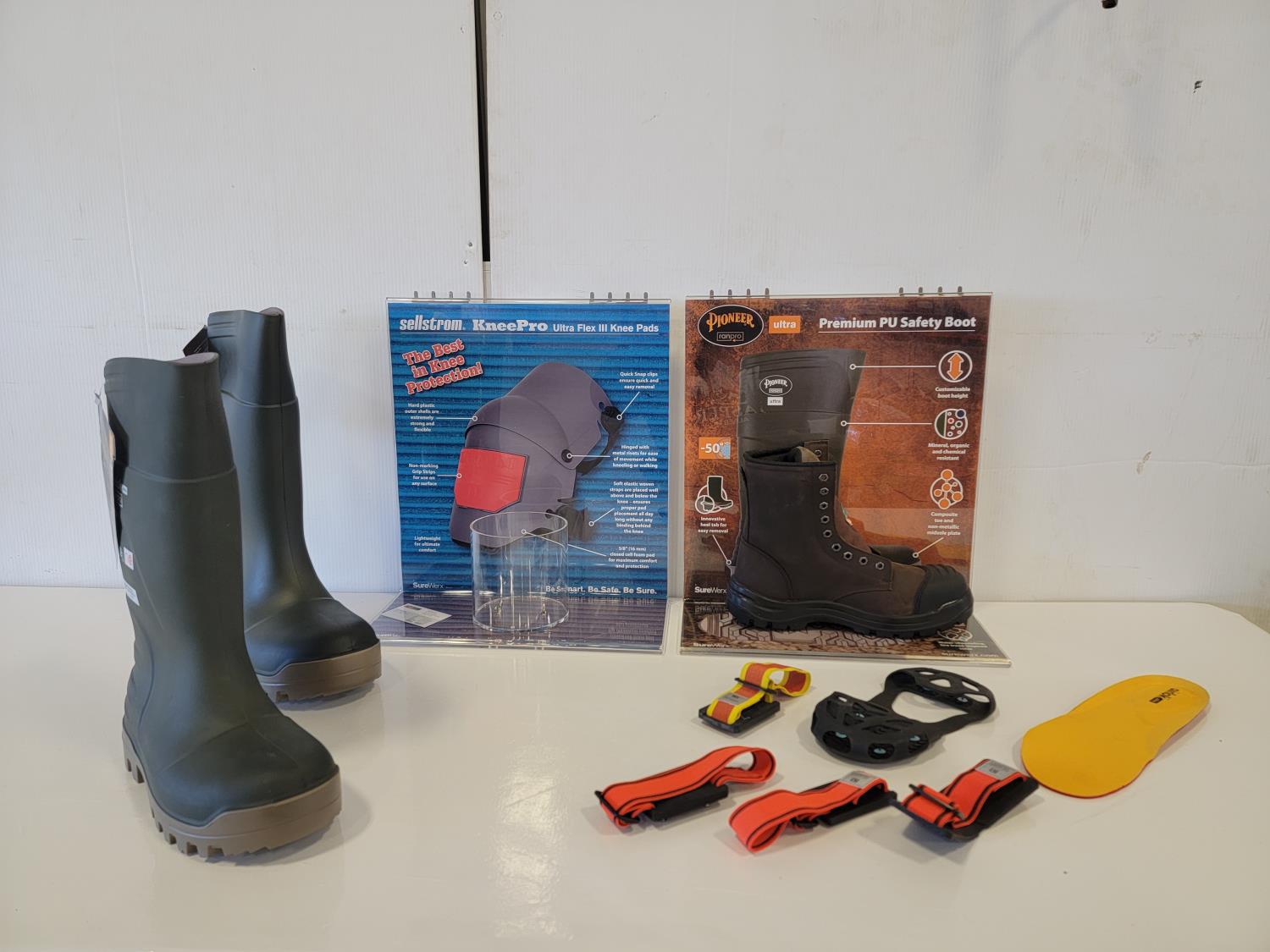 rubber boot size 9 (right boot only), rubber boot size 15 (right boot only), steel toe work boot size 10 (left boot only), (5) various ice cleats, (2) acrylic displays