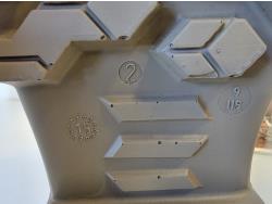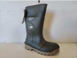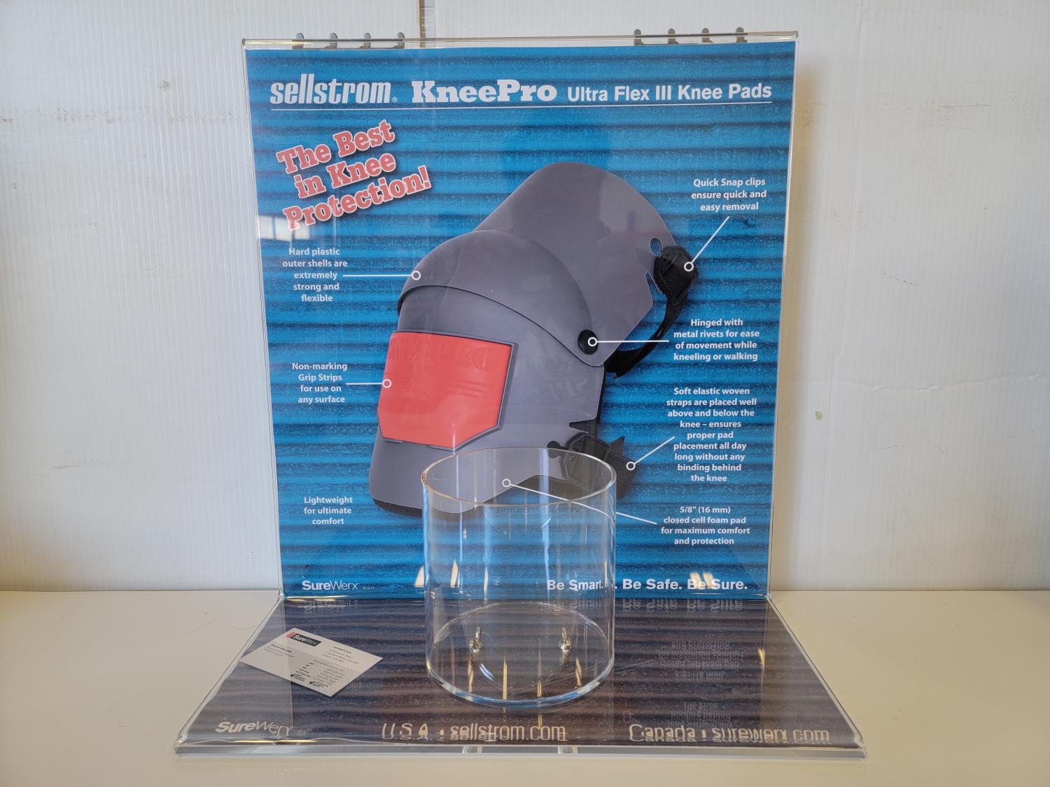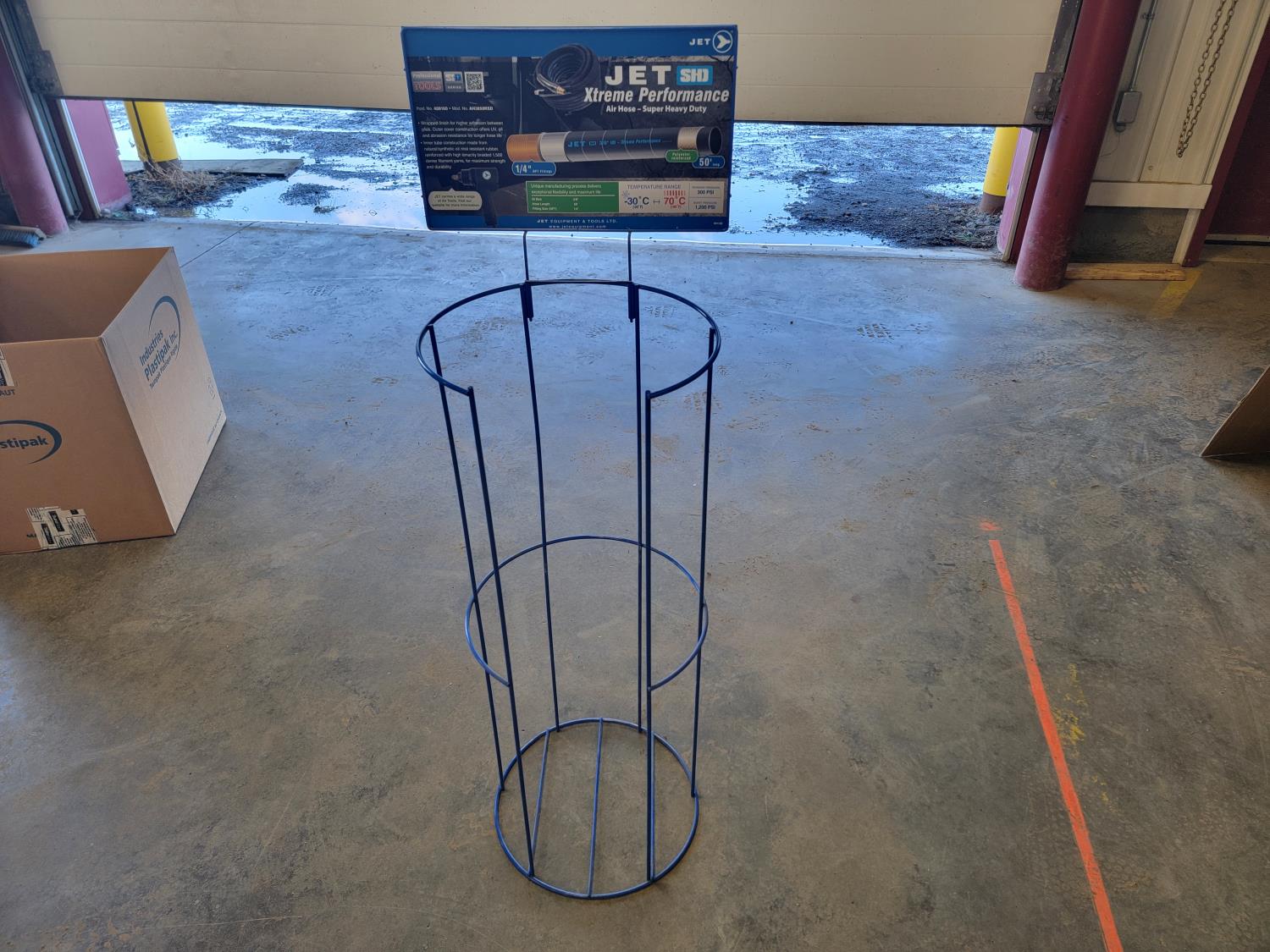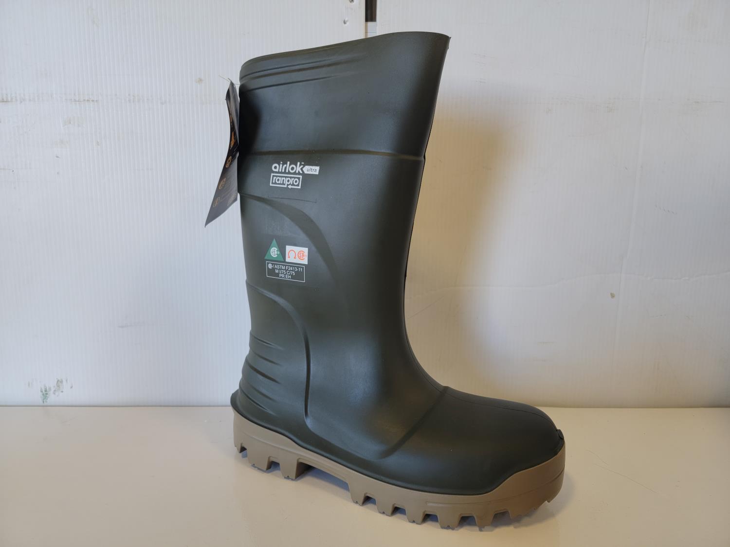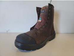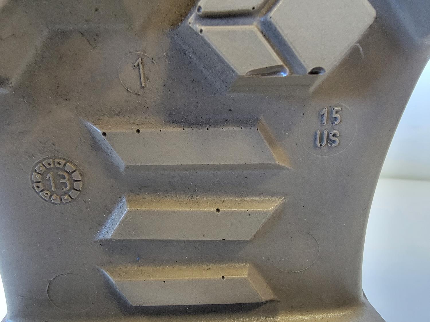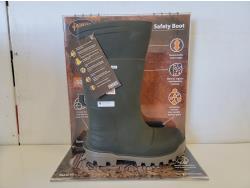 rubber boot size 9 (right boot only), rubber boot size 15 (right boot only), steel toe work boot size 10 (left boot only), (5) various ice cleats, (2) acrylic displays