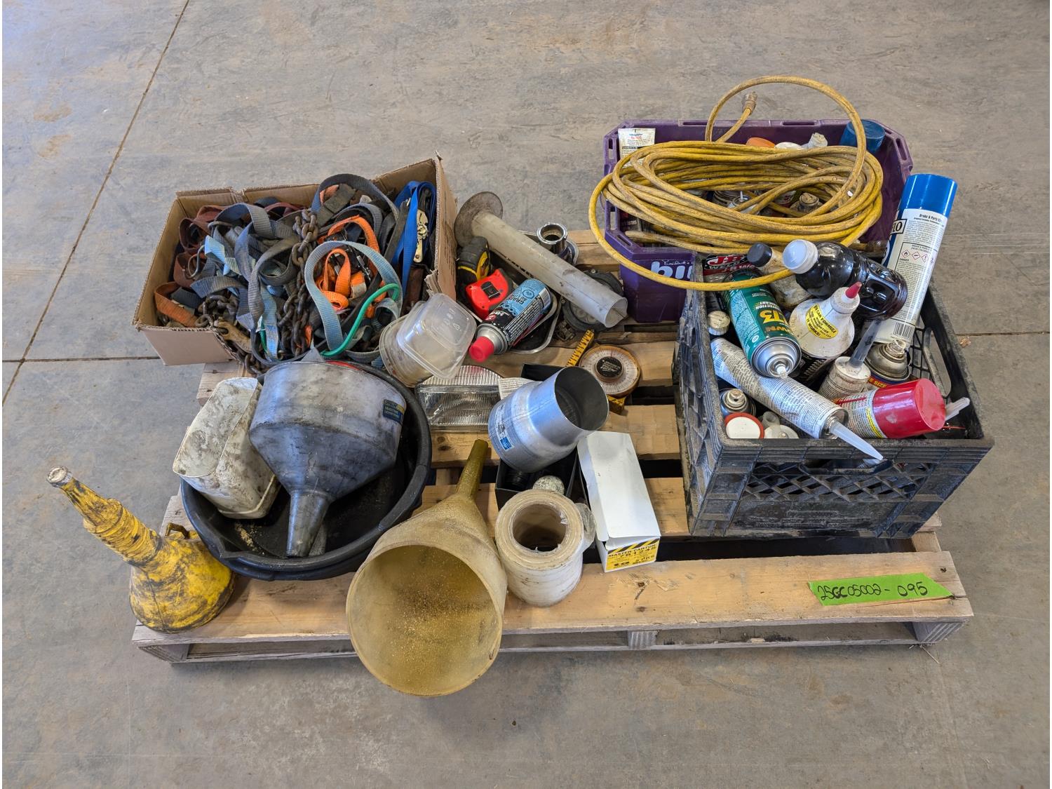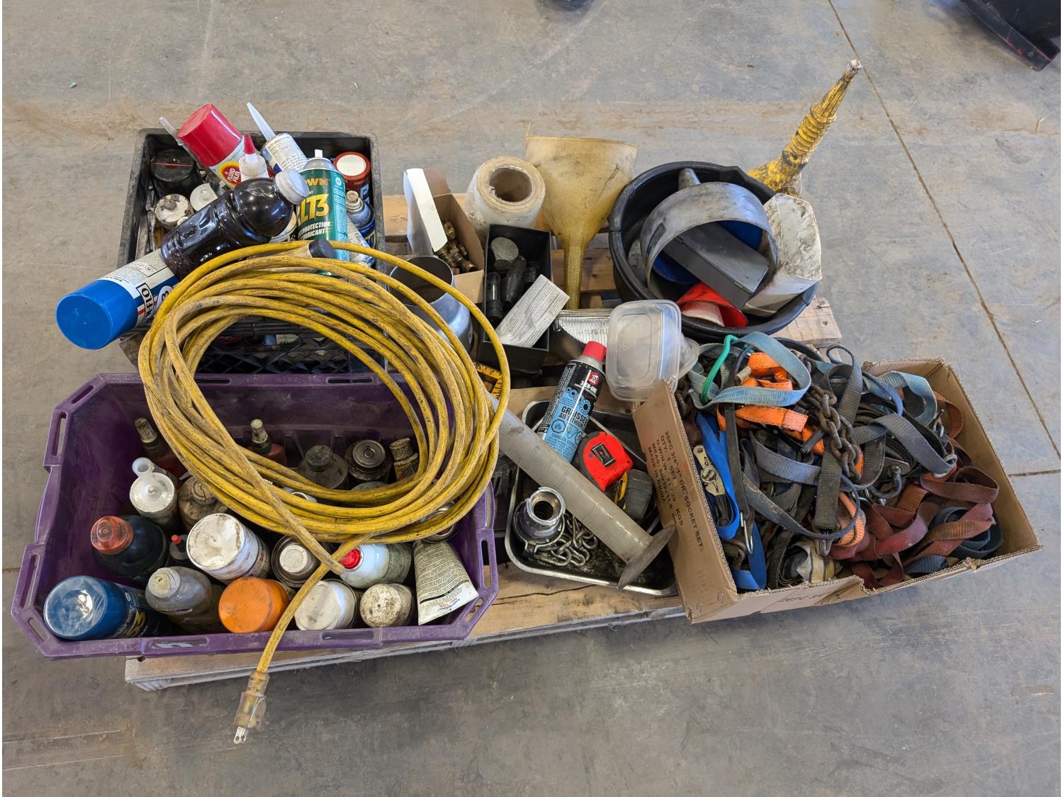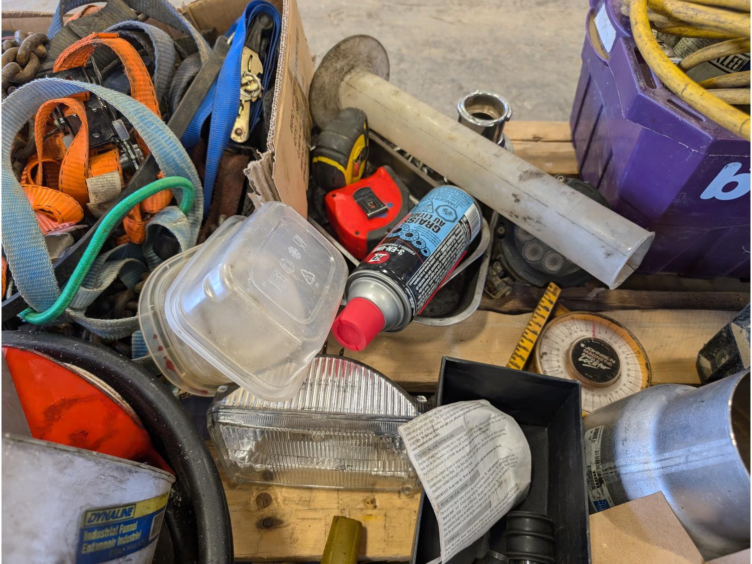 Funnels, ratchet straps, various shop fluids, tape measures, extension cord