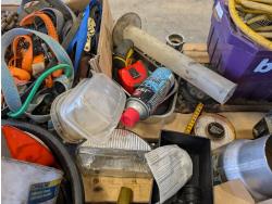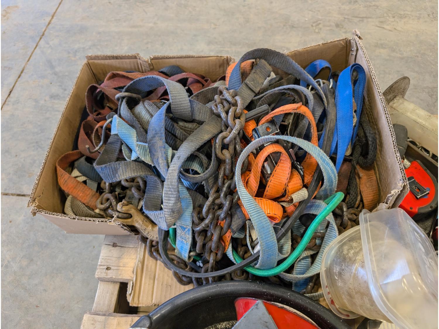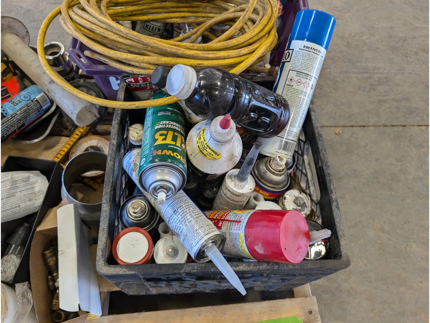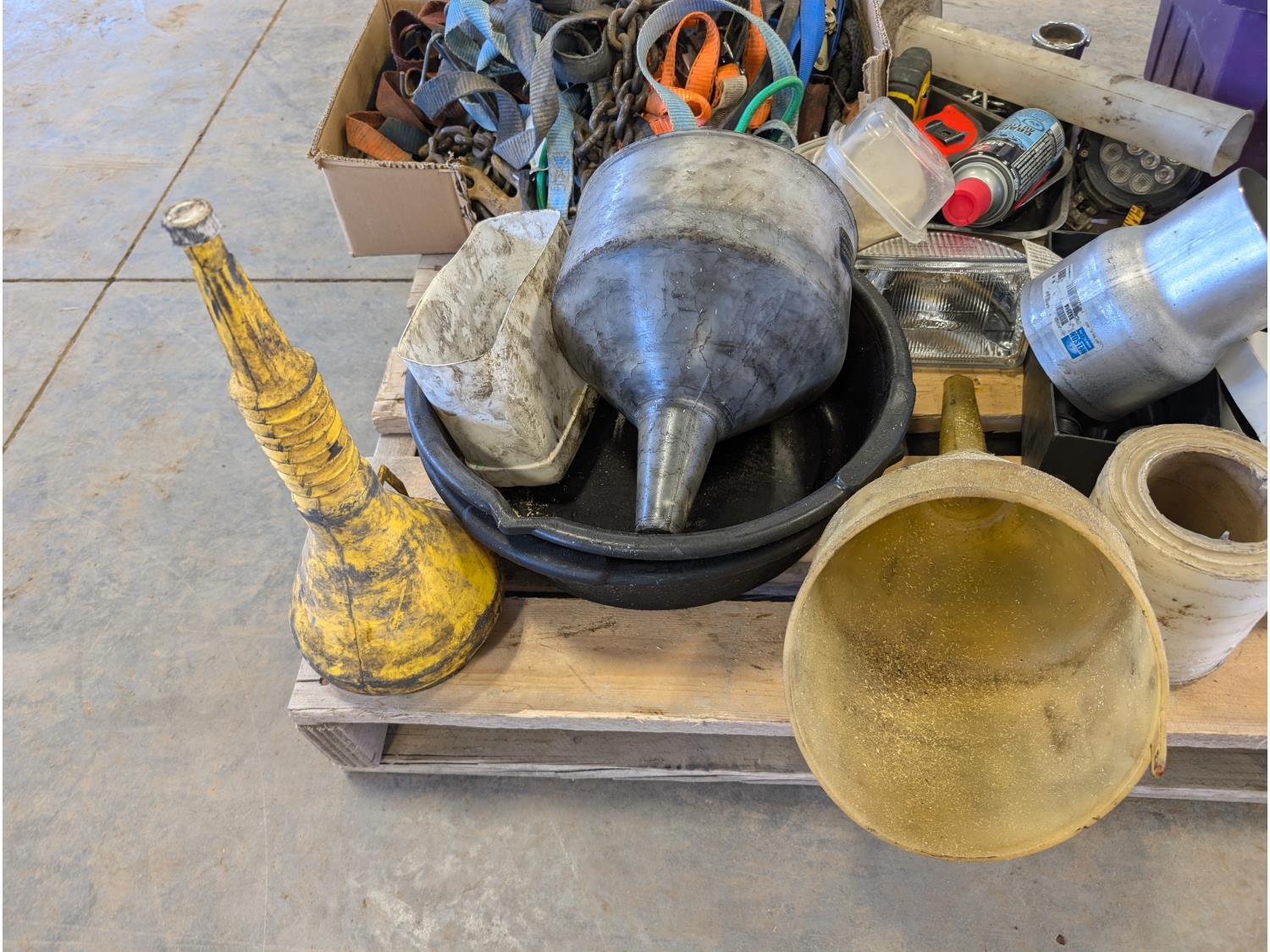 Funnels, ratchet straps, various shop fluids, tape measures, extension cord