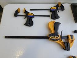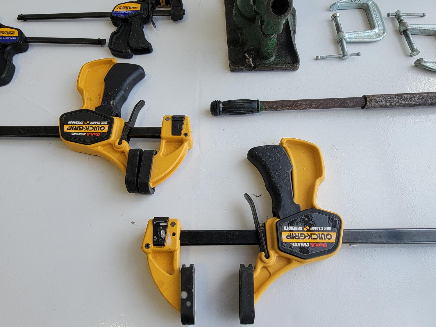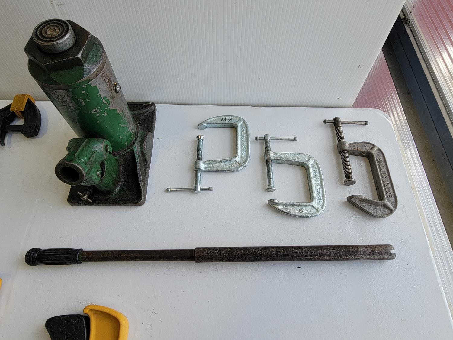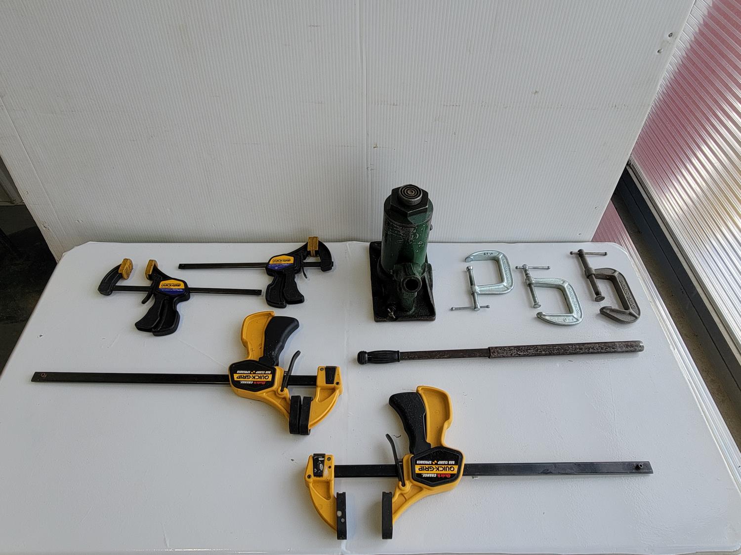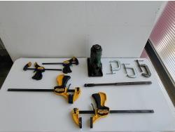 Quick-grip clamps, C-clamps, bottle jack, hardware, tackle box, wooden box