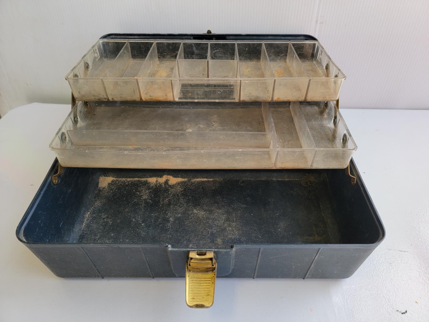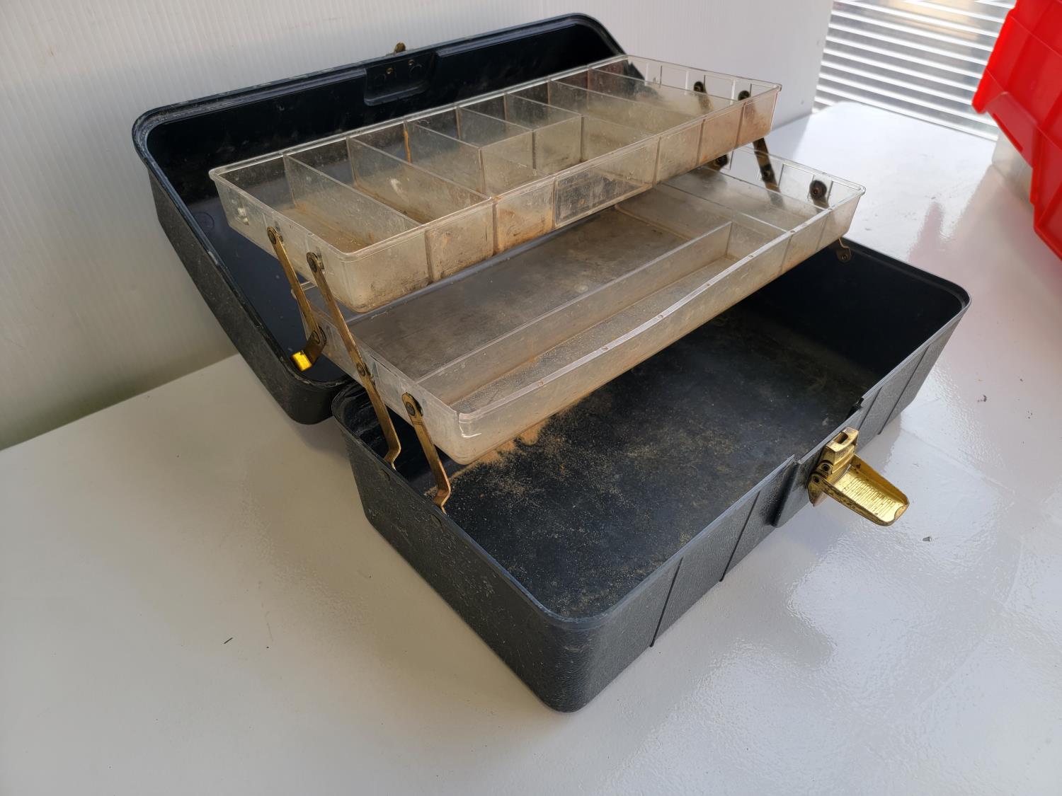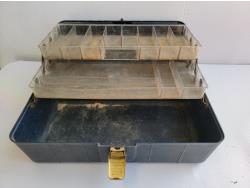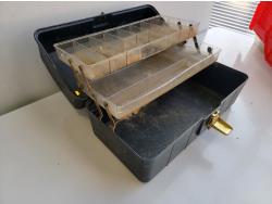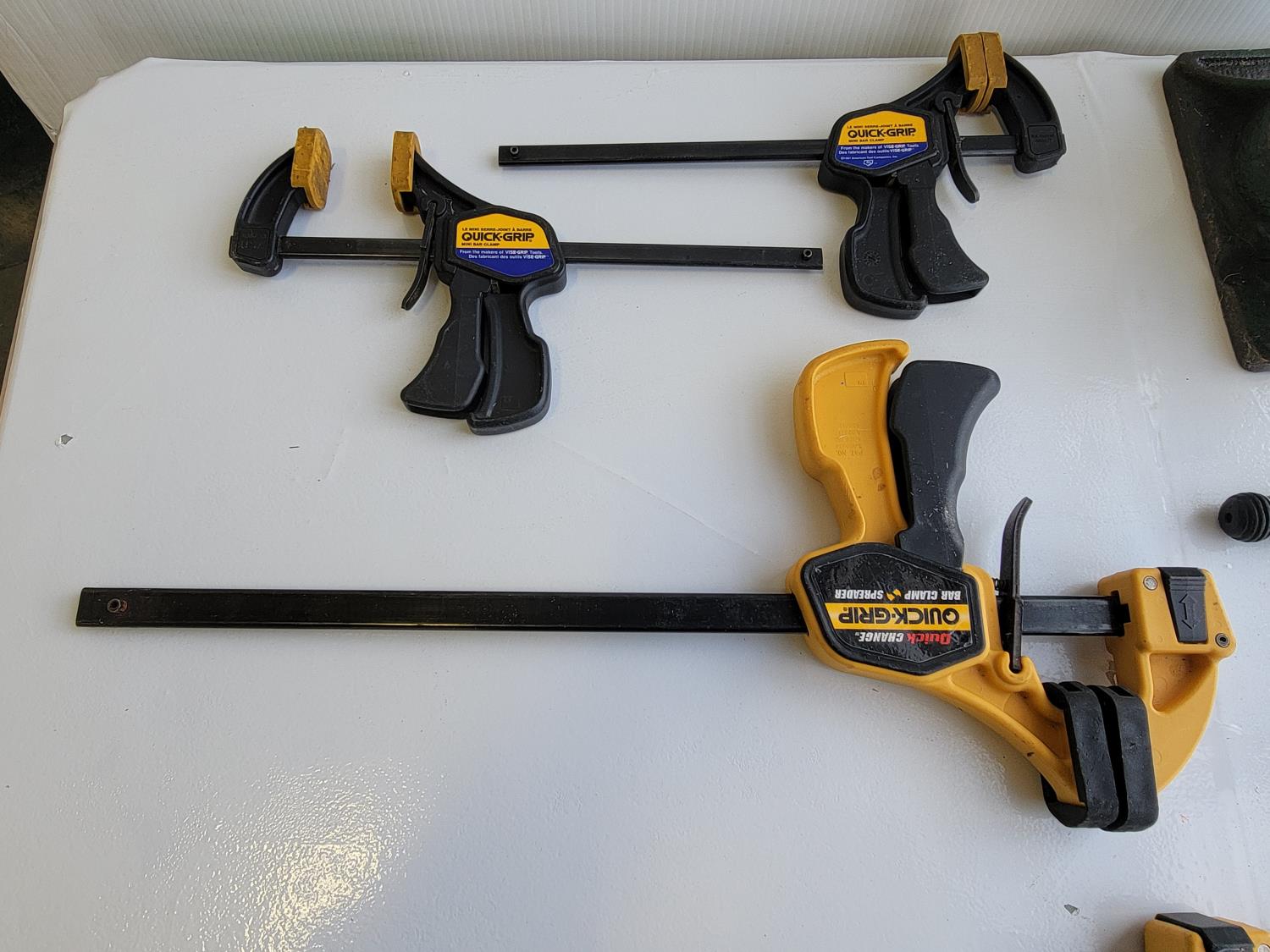 Quick-grip clamps, C-clamps, bottle jack, hardware, tackle box, wooden box