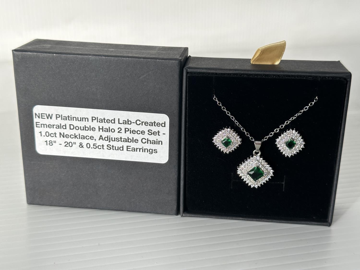 5011 Smartlife Platinum Plated Lab-Created Emerald Double Halo 2 Piece Set (Unused)