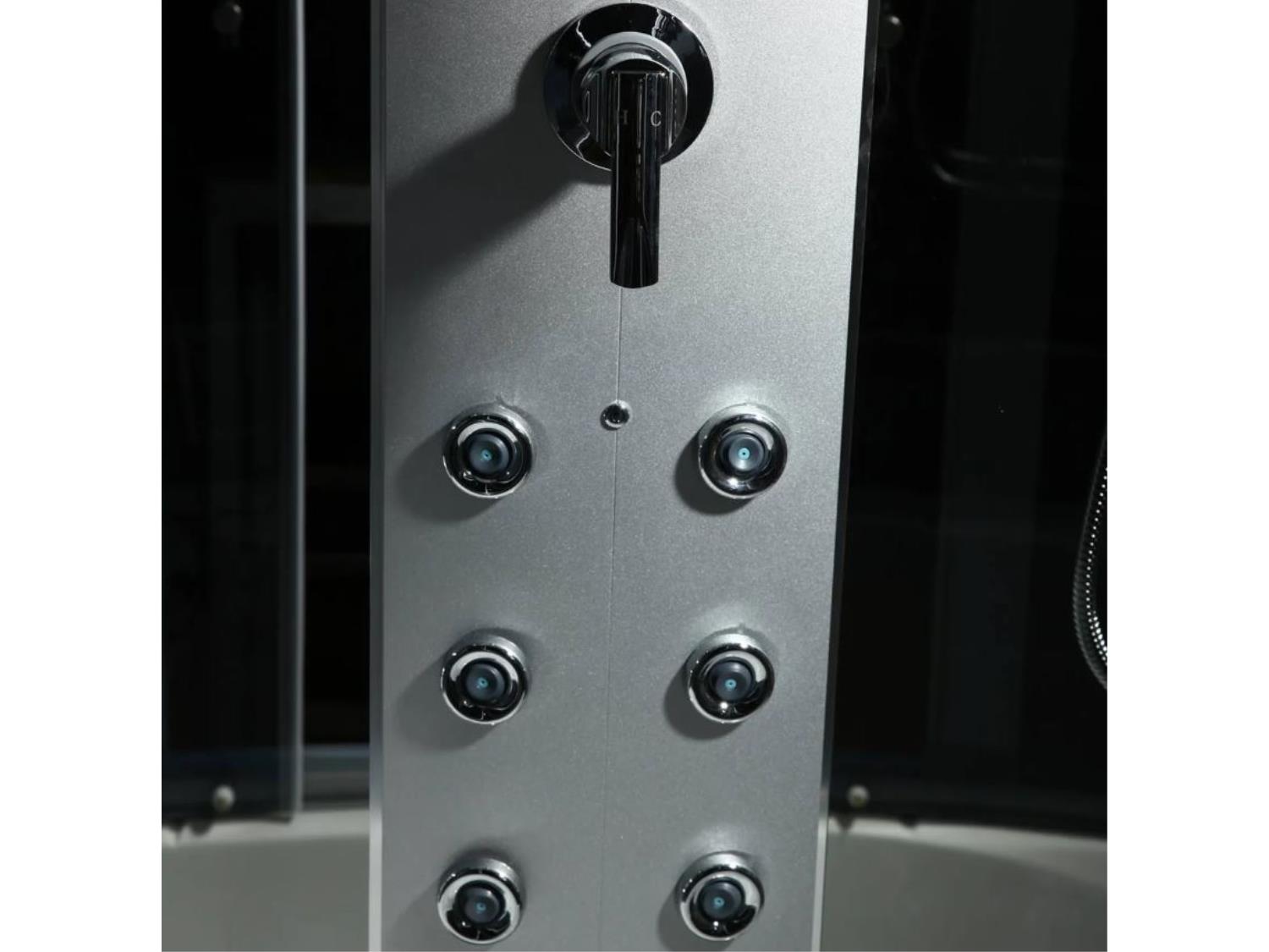 85 inch H, 35 inch W, 59 inch L, Bluetooth, computer controlled temperature, blue lighting, massage jets, left drain