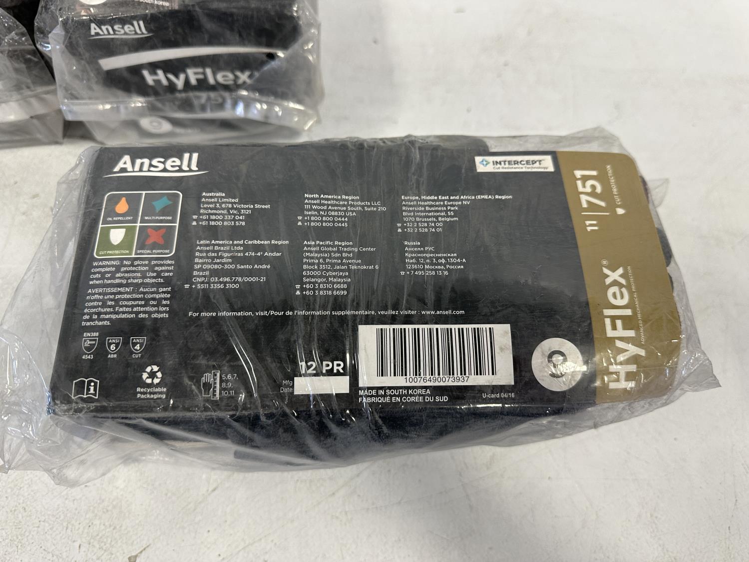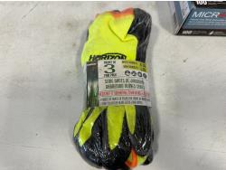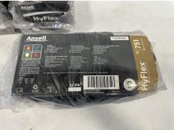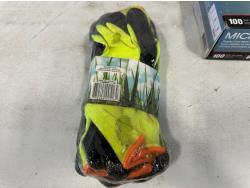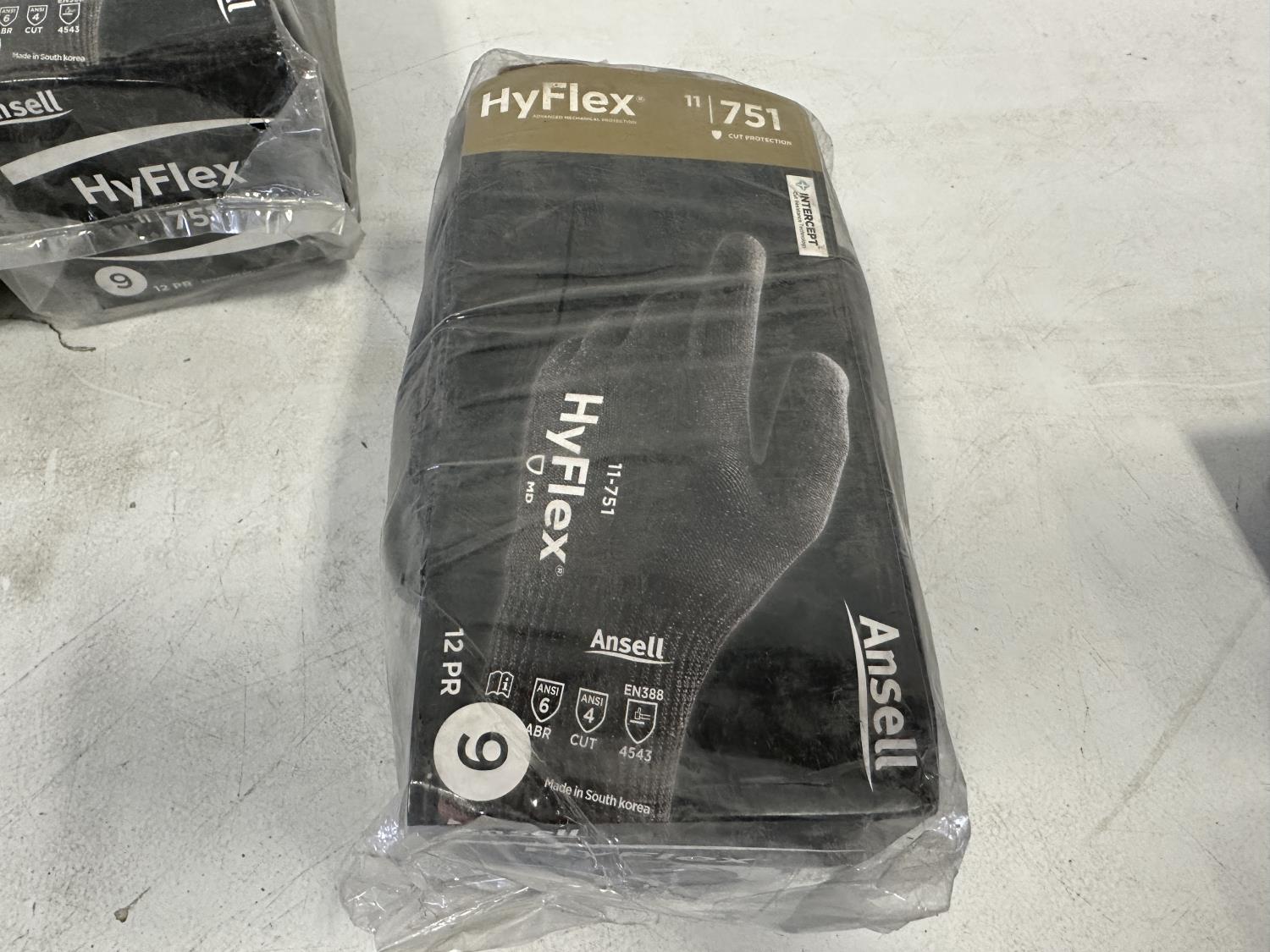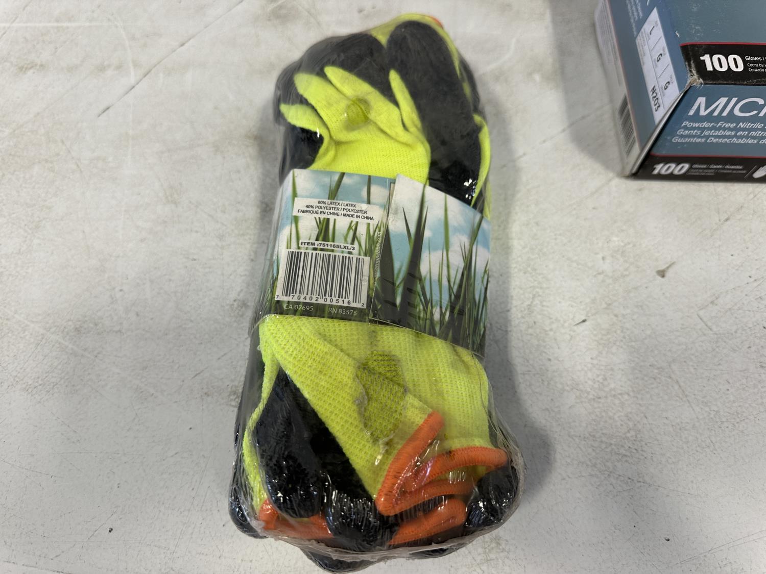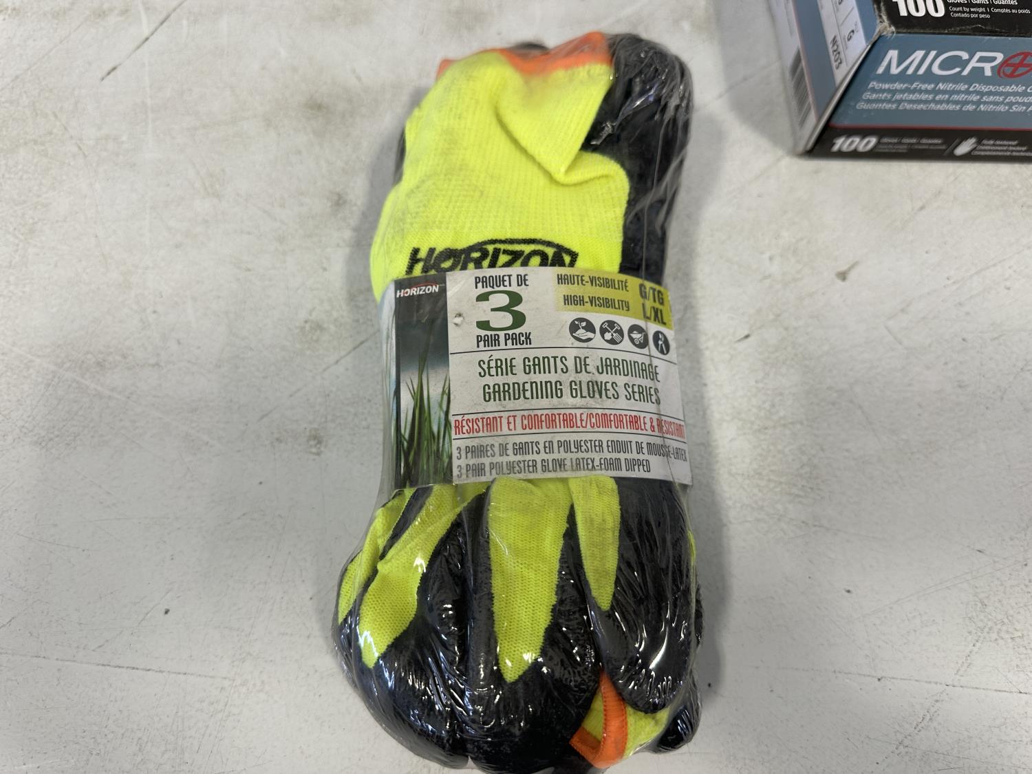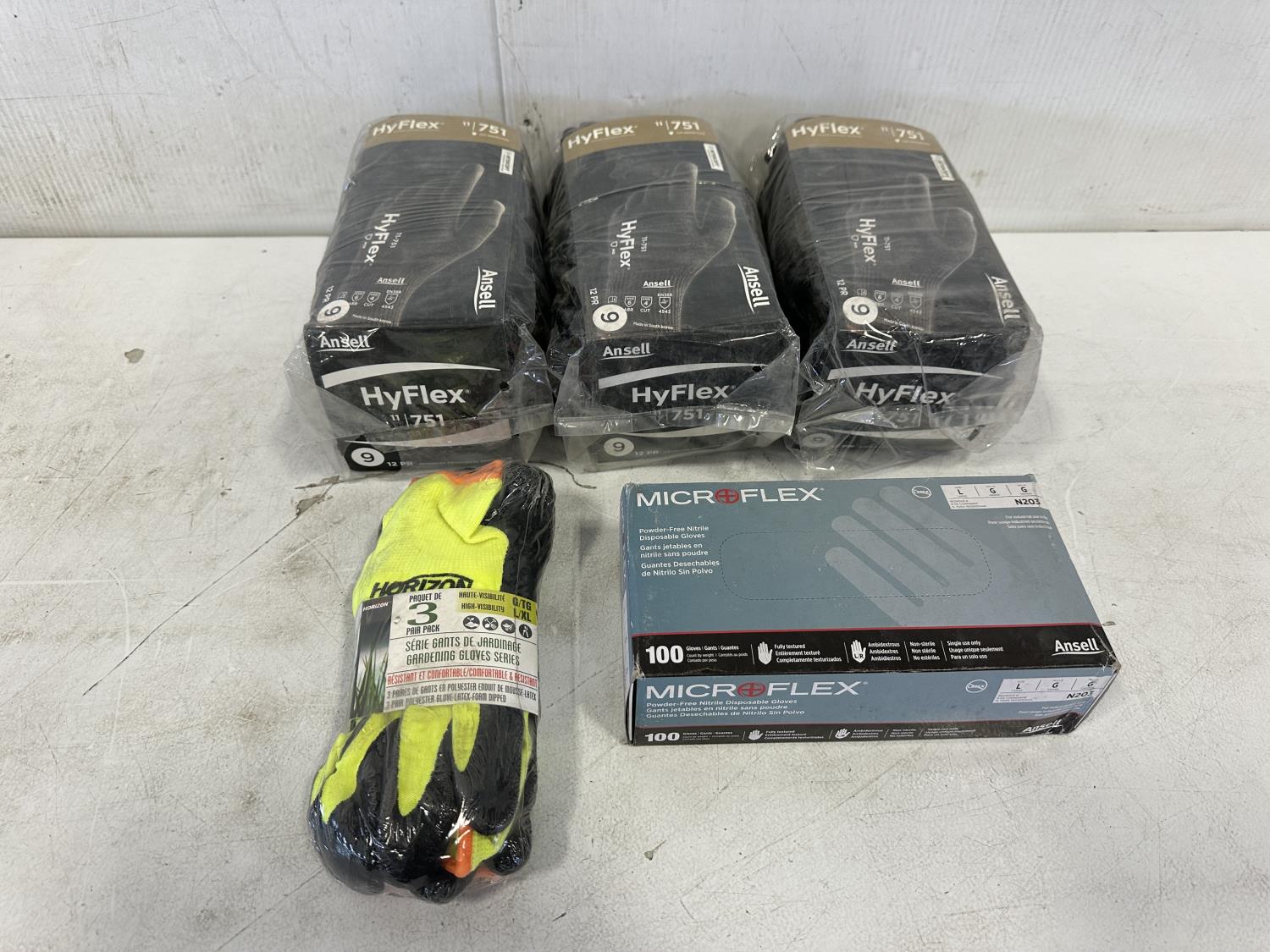 (1) box size large nitrile gloves, (3) pairs size L/XL polyester gloves, (36) pairs size 9 HyFlex gloves