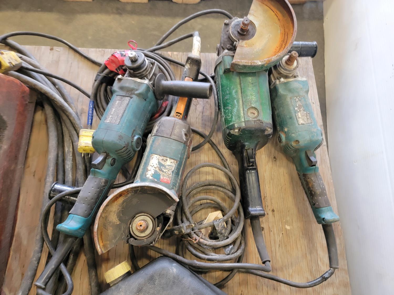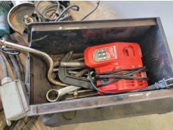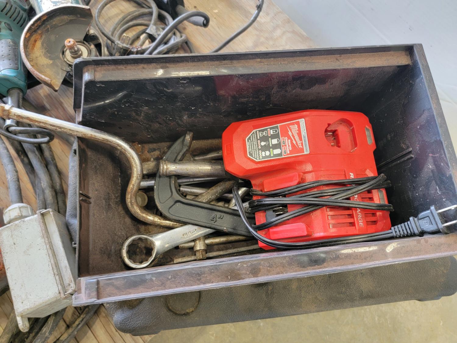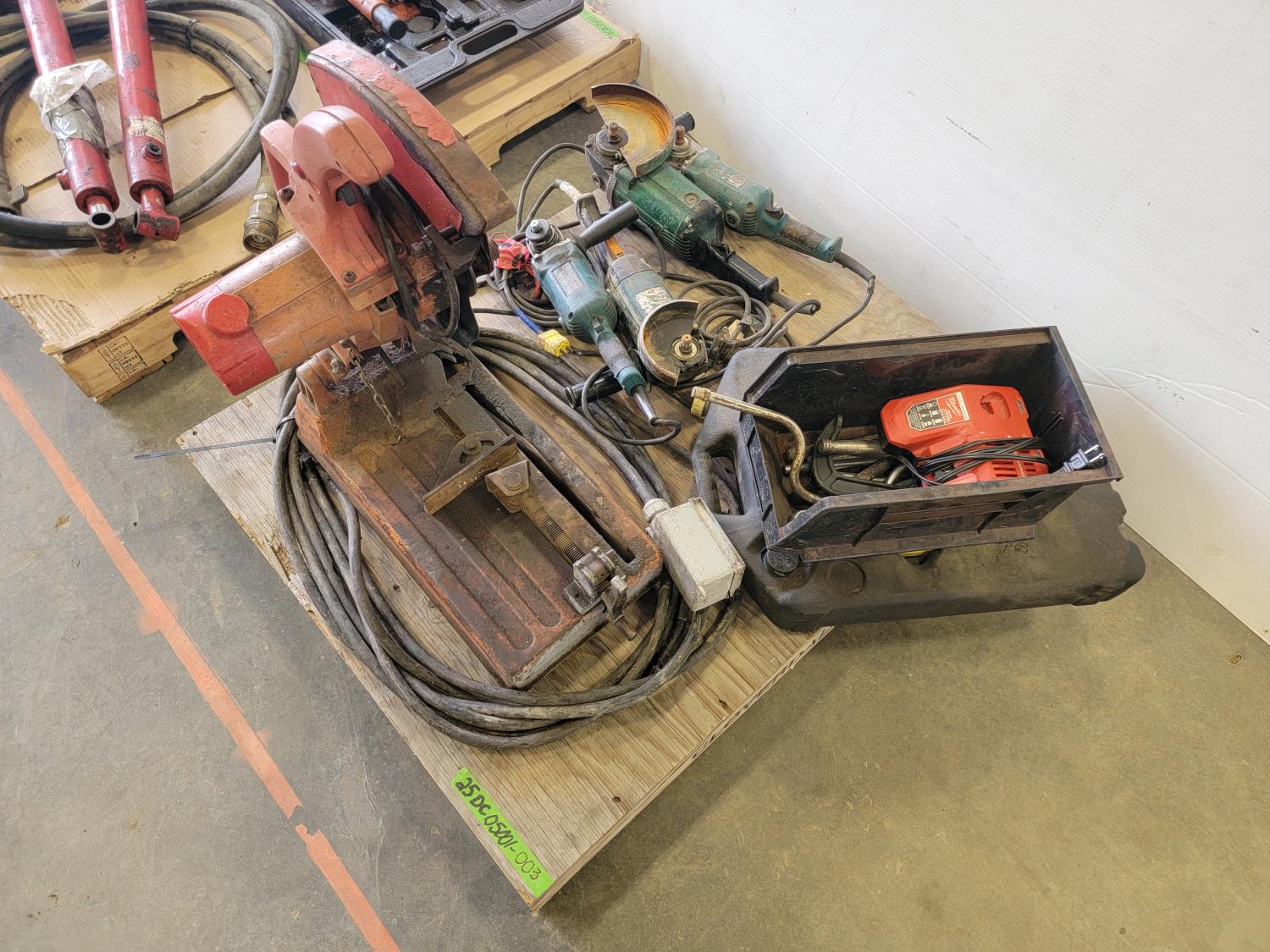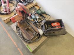 Chop saw, angle grinder, angle grinder for parts, assortment of hand tools, oil pan