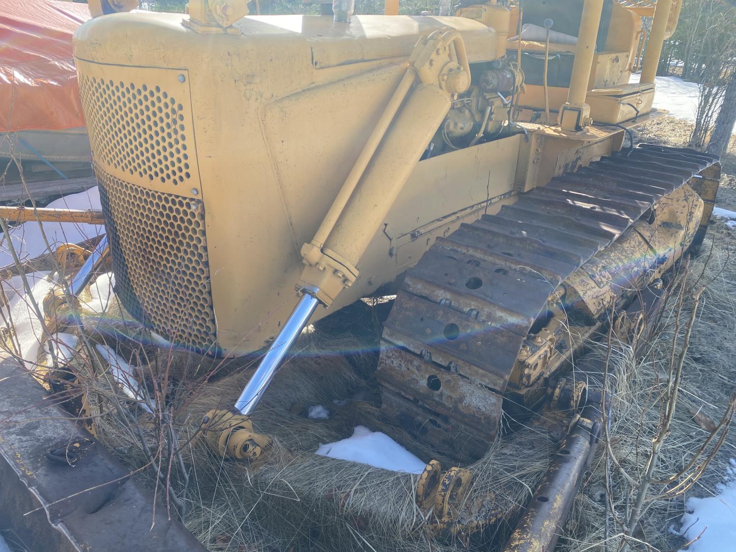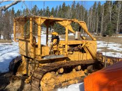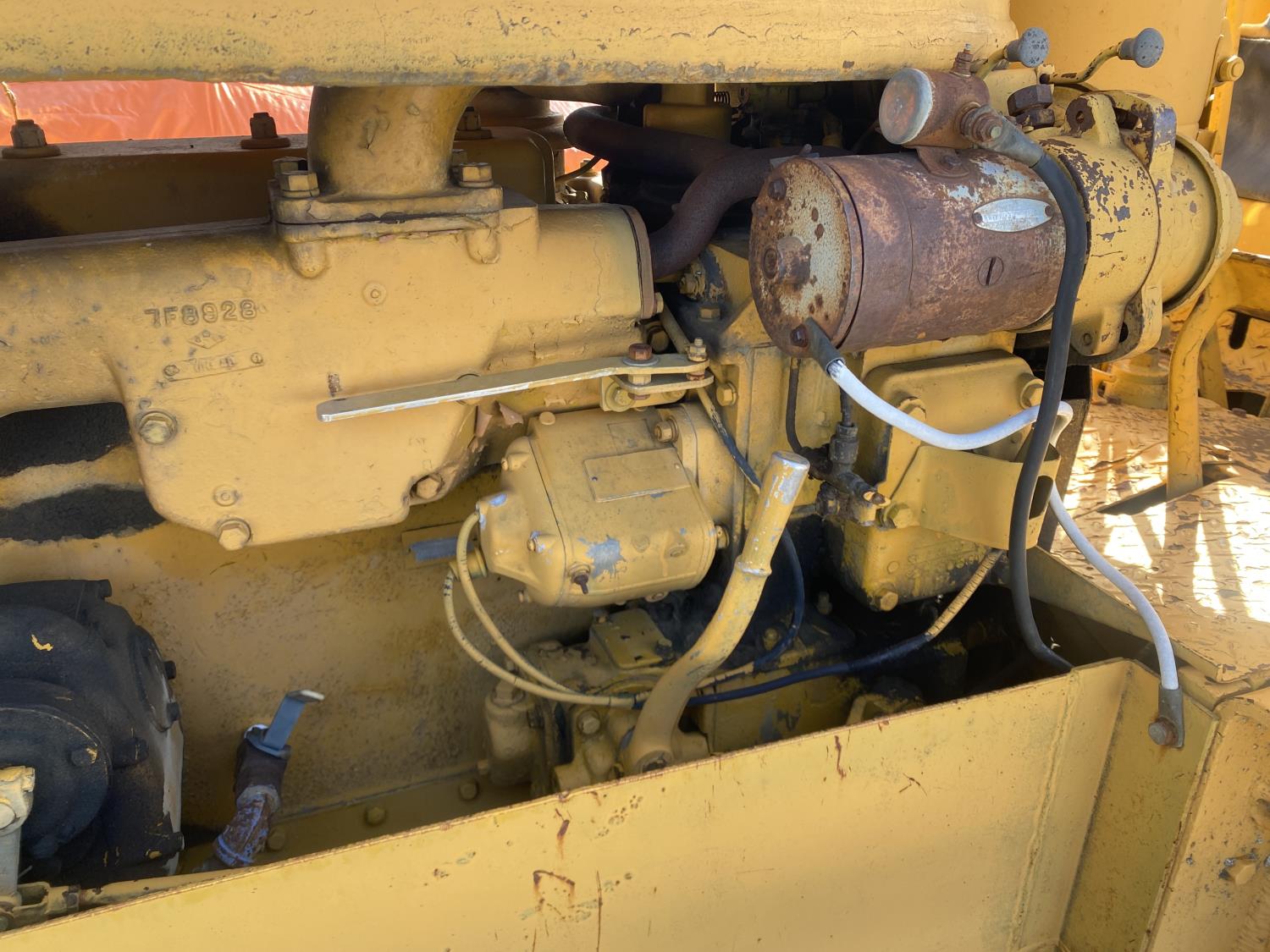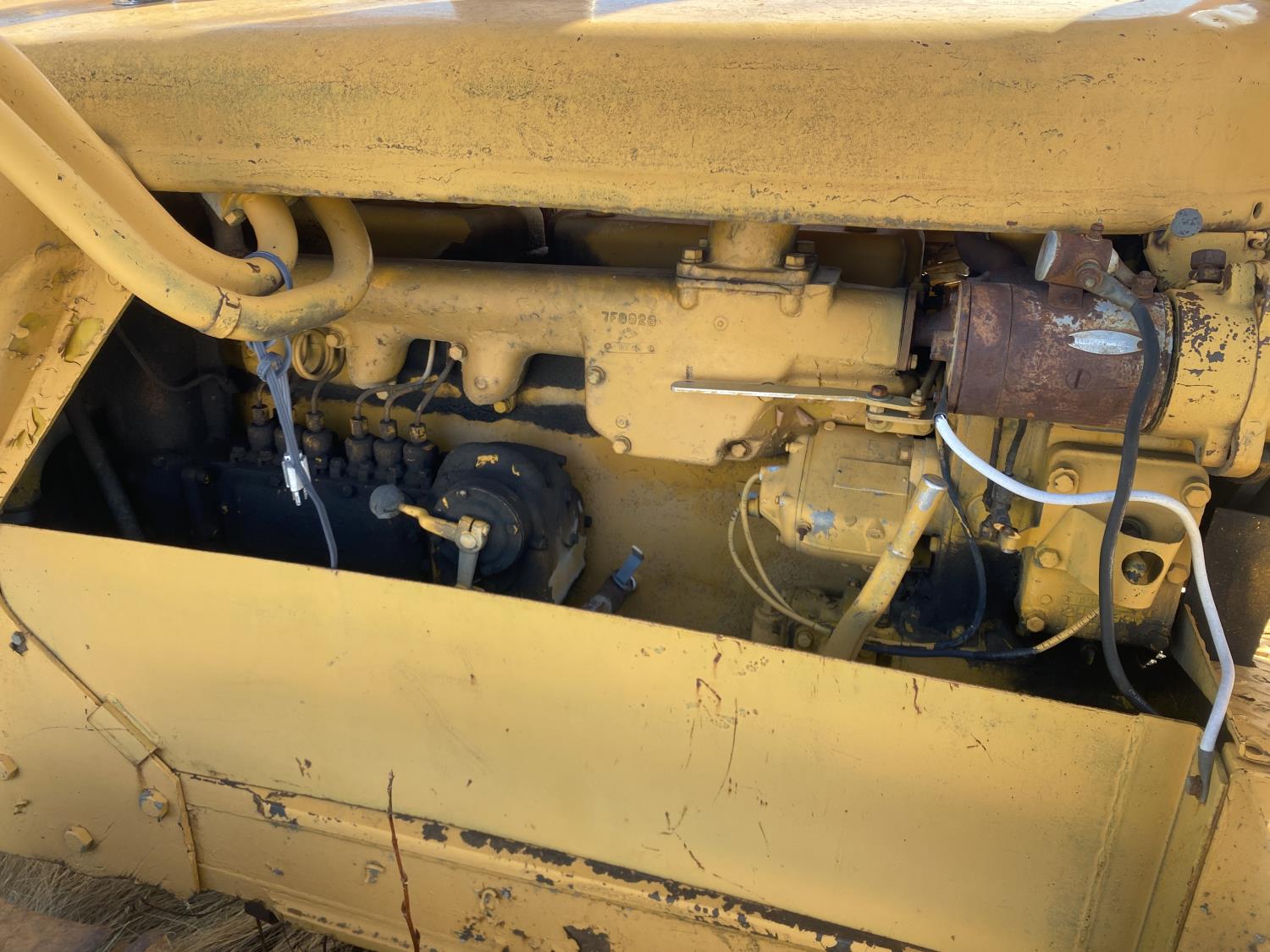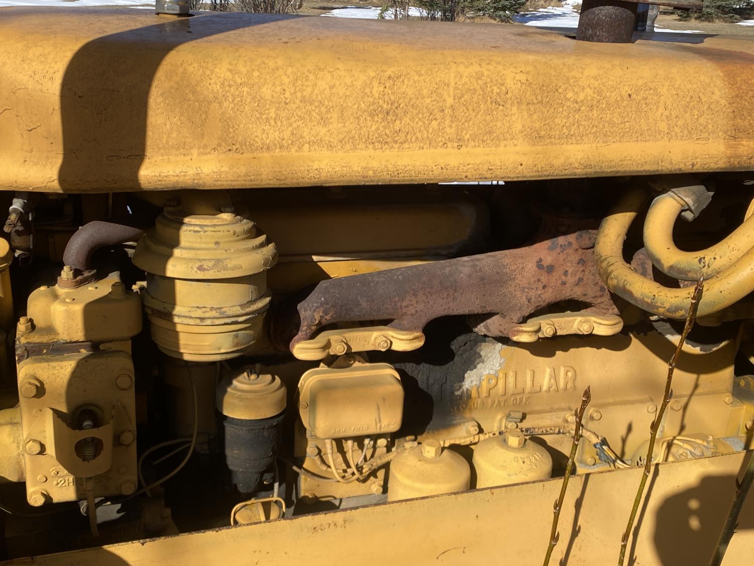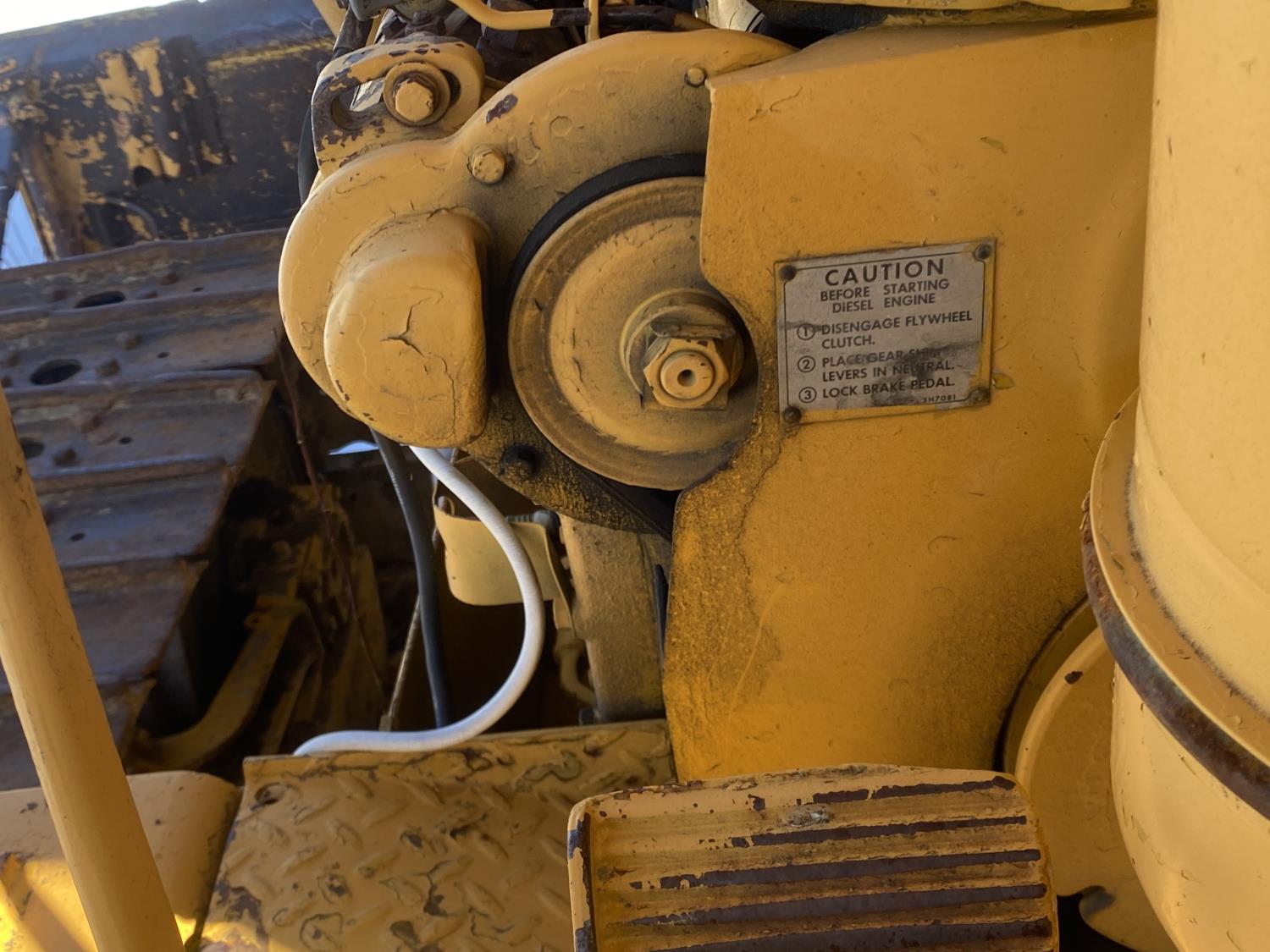 Open station with canopy, 2 cyl starting pup (runs) gas engine, 6 cyl Cat diesel engine, manual transmission, 11 Ft manual angle dozer, drawbar, 20 inch track pads, single grousers