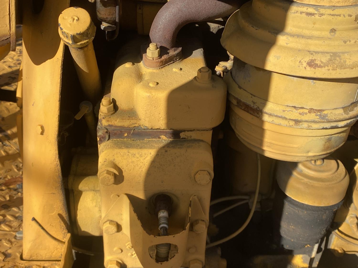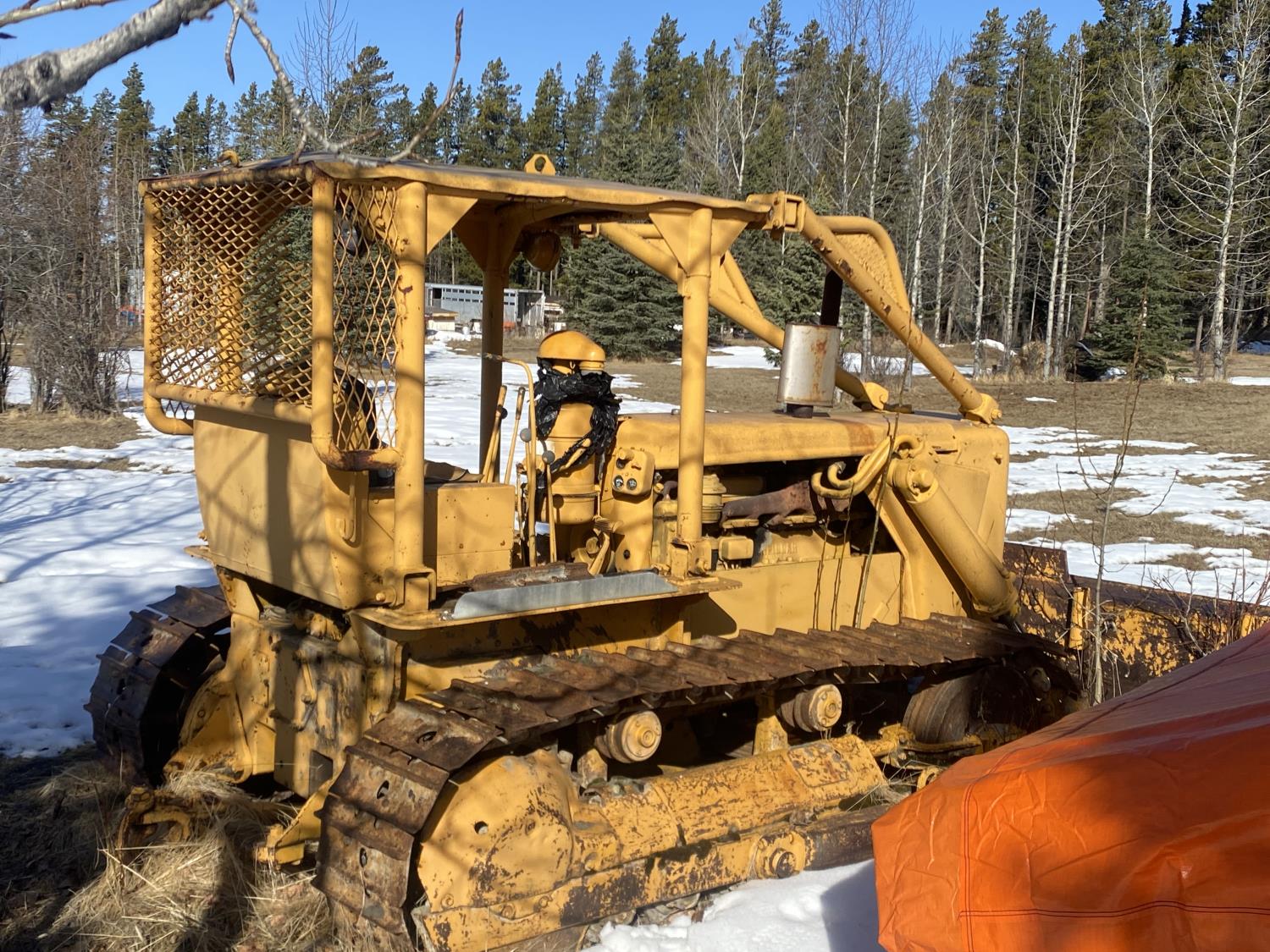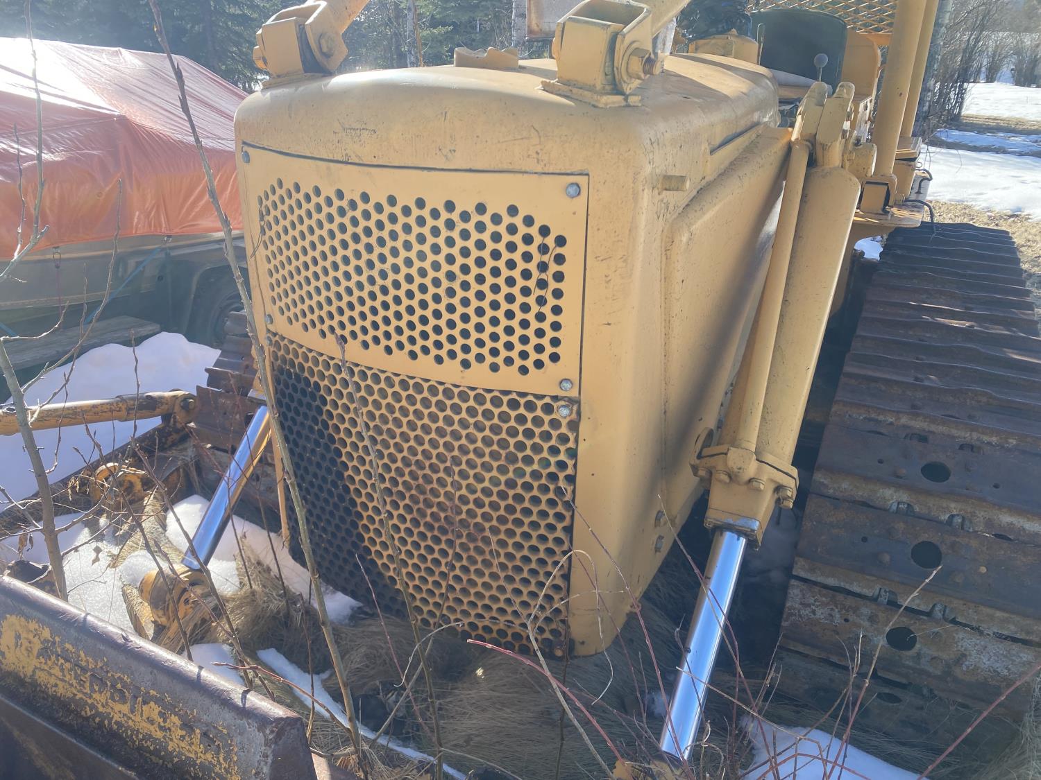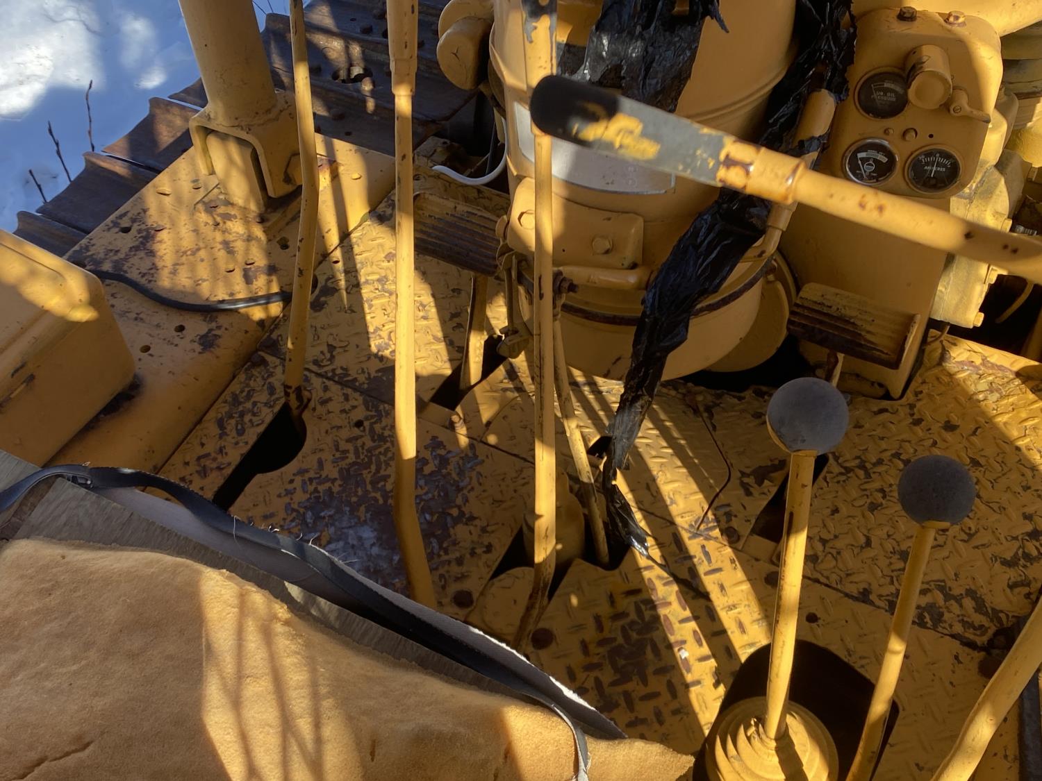 Open station with canopy, 2 cyl starting pup (runs) gas engine, 6 cyl Cat diesel engine, manual transmission, 11 Ft manual angle dozer, drawbar, 20 inch track pads, single grousers