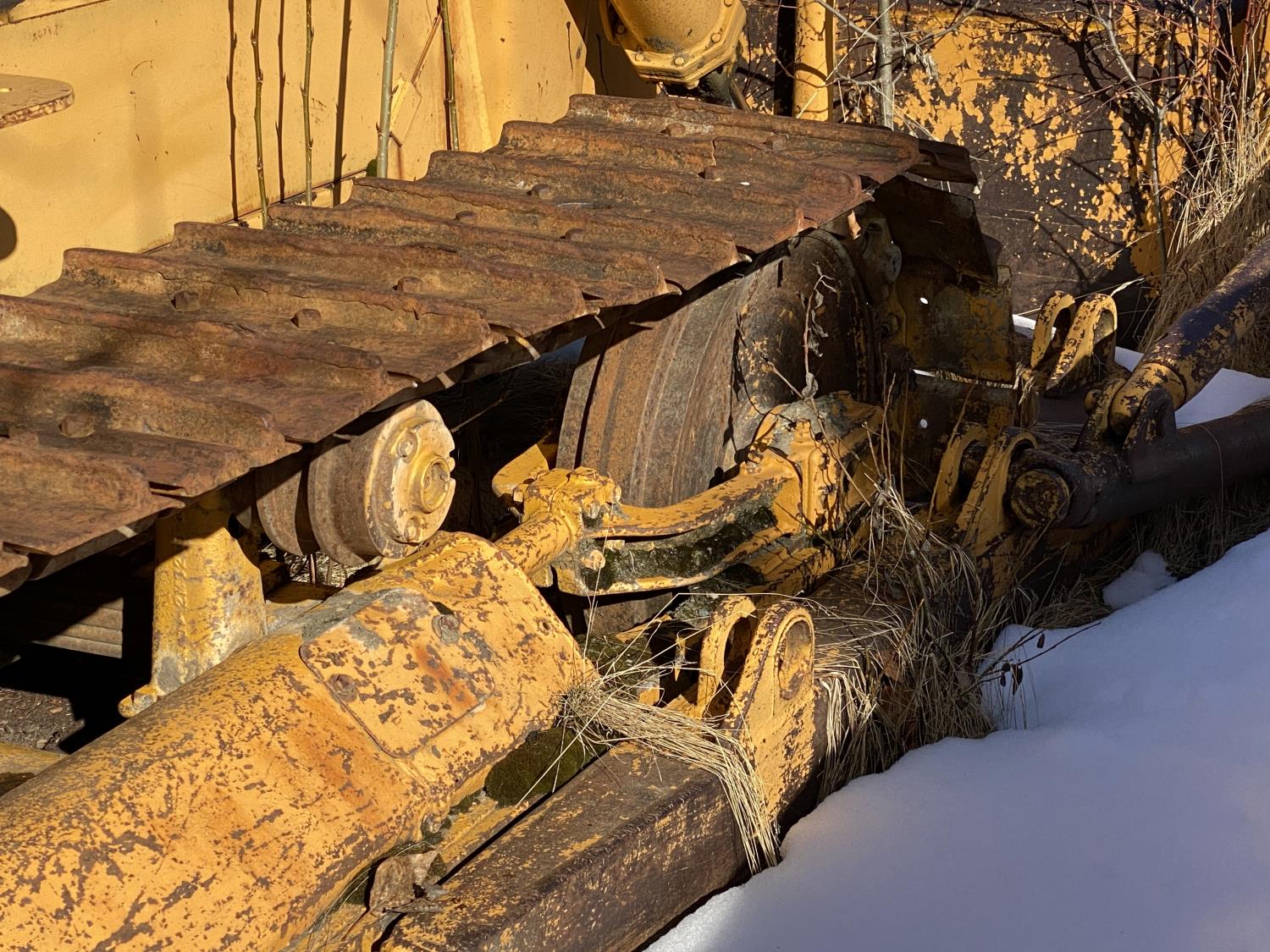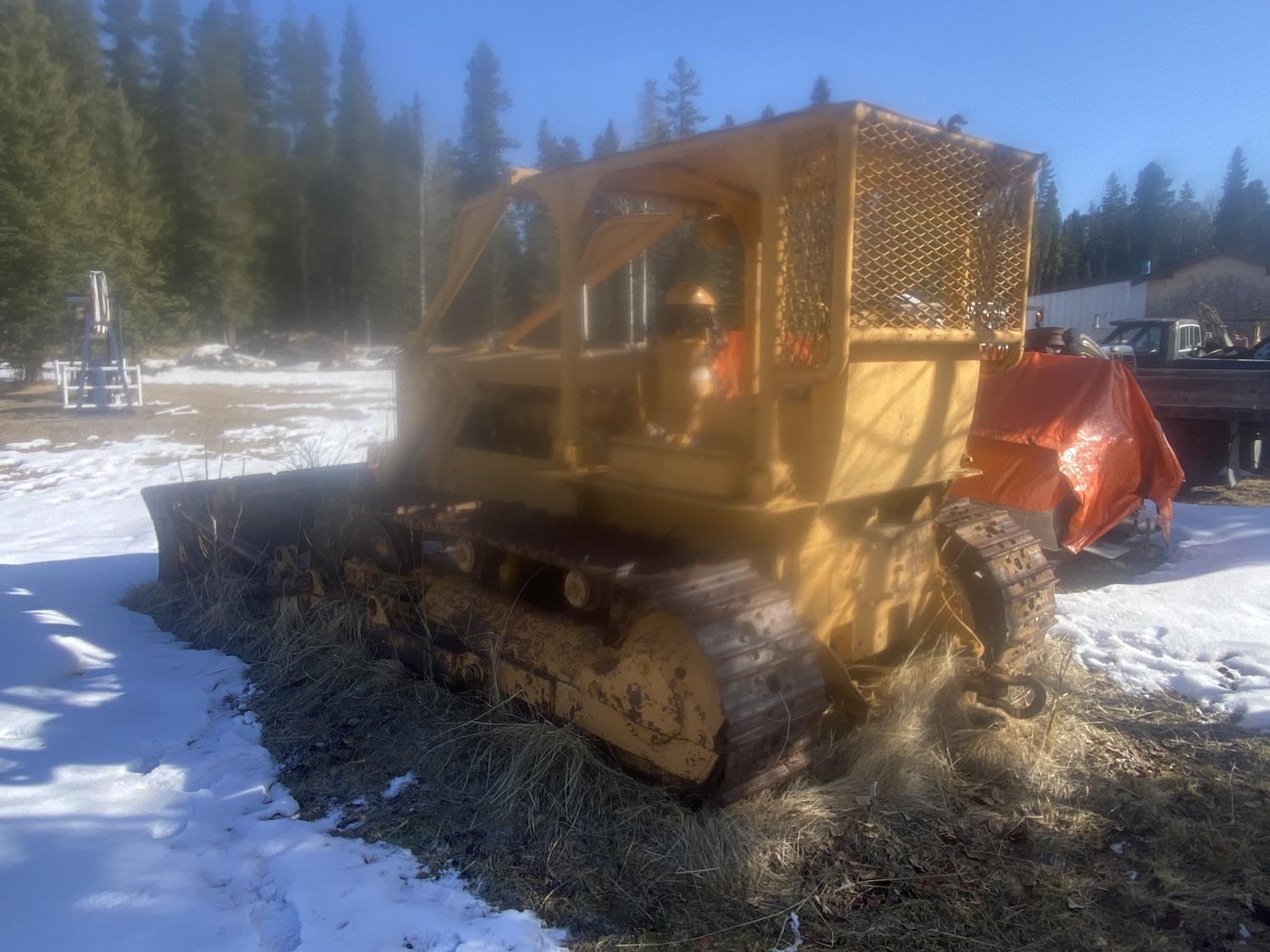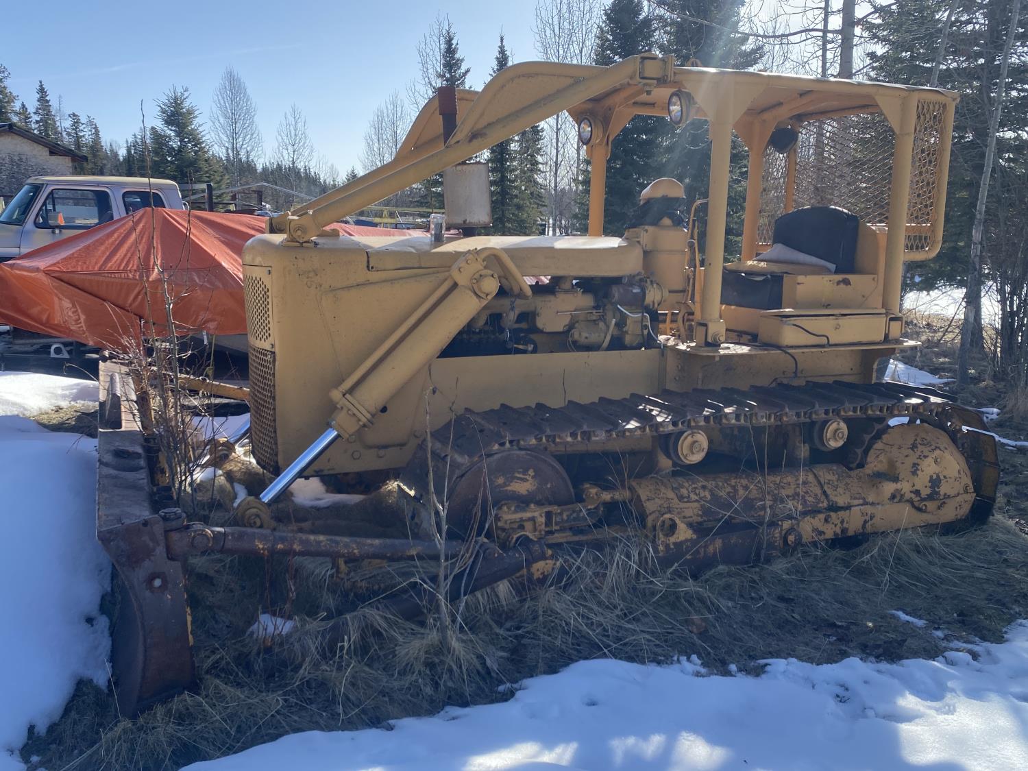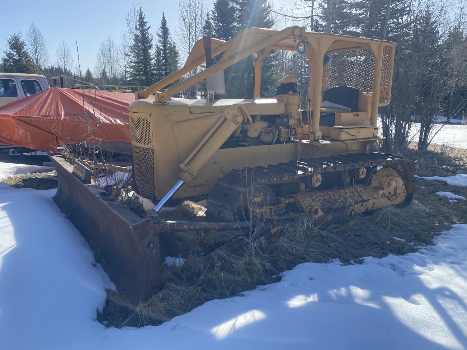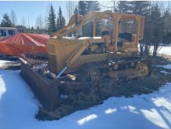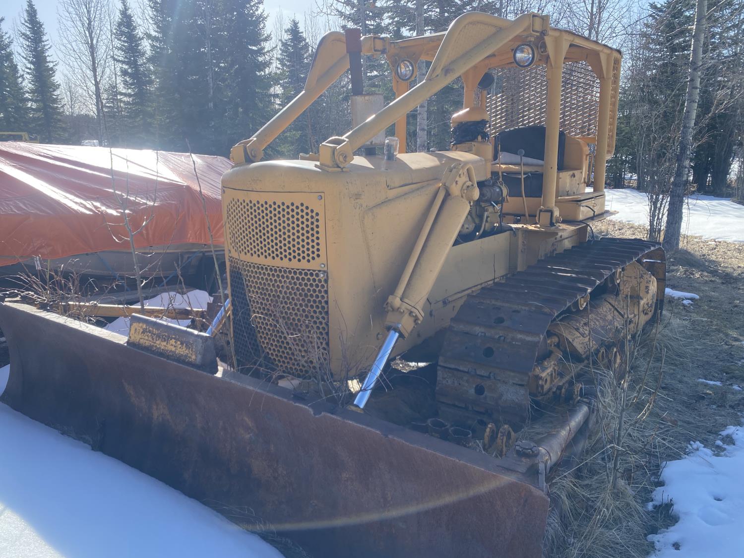 Open station with canopy, 2 cyl starting pup (runs) gas engine, 6 cyl Cat diesel engine, manual transmission, 11 Ft manual angle dozer, drawbar, 20 inch track pads, single grousers