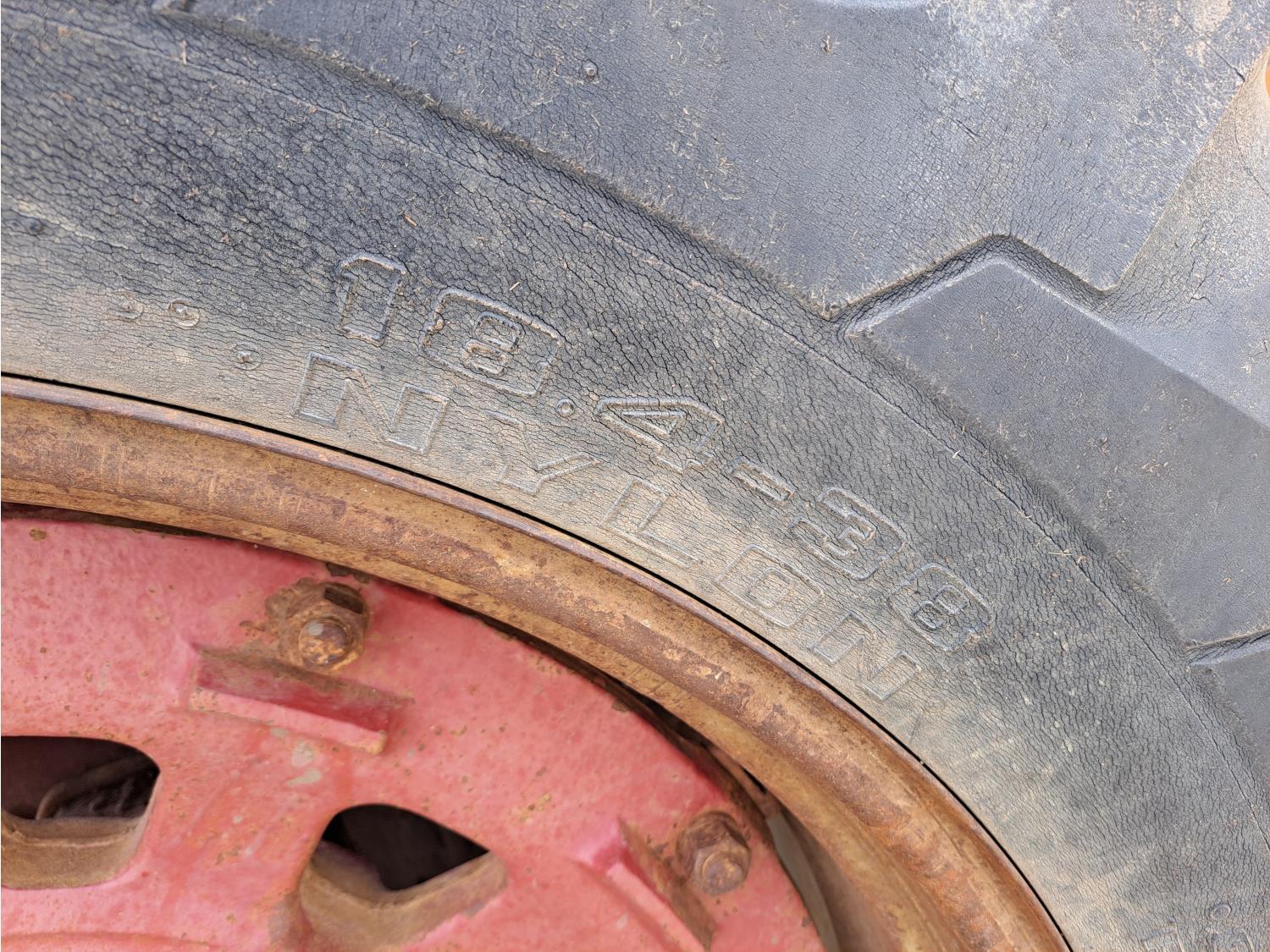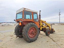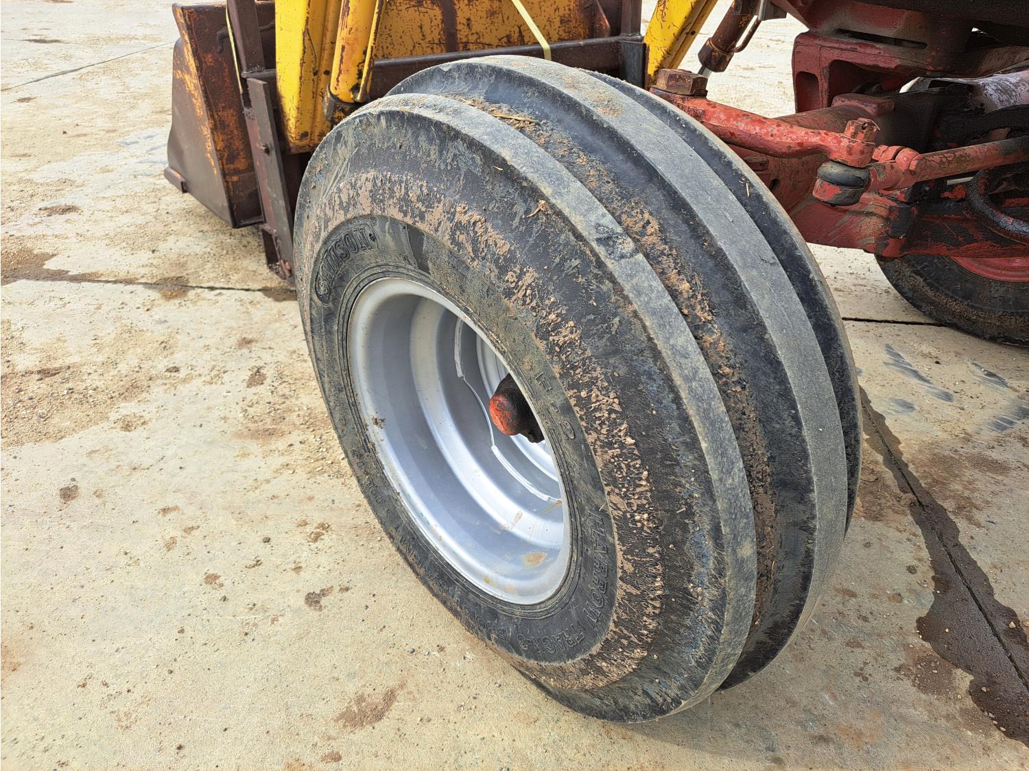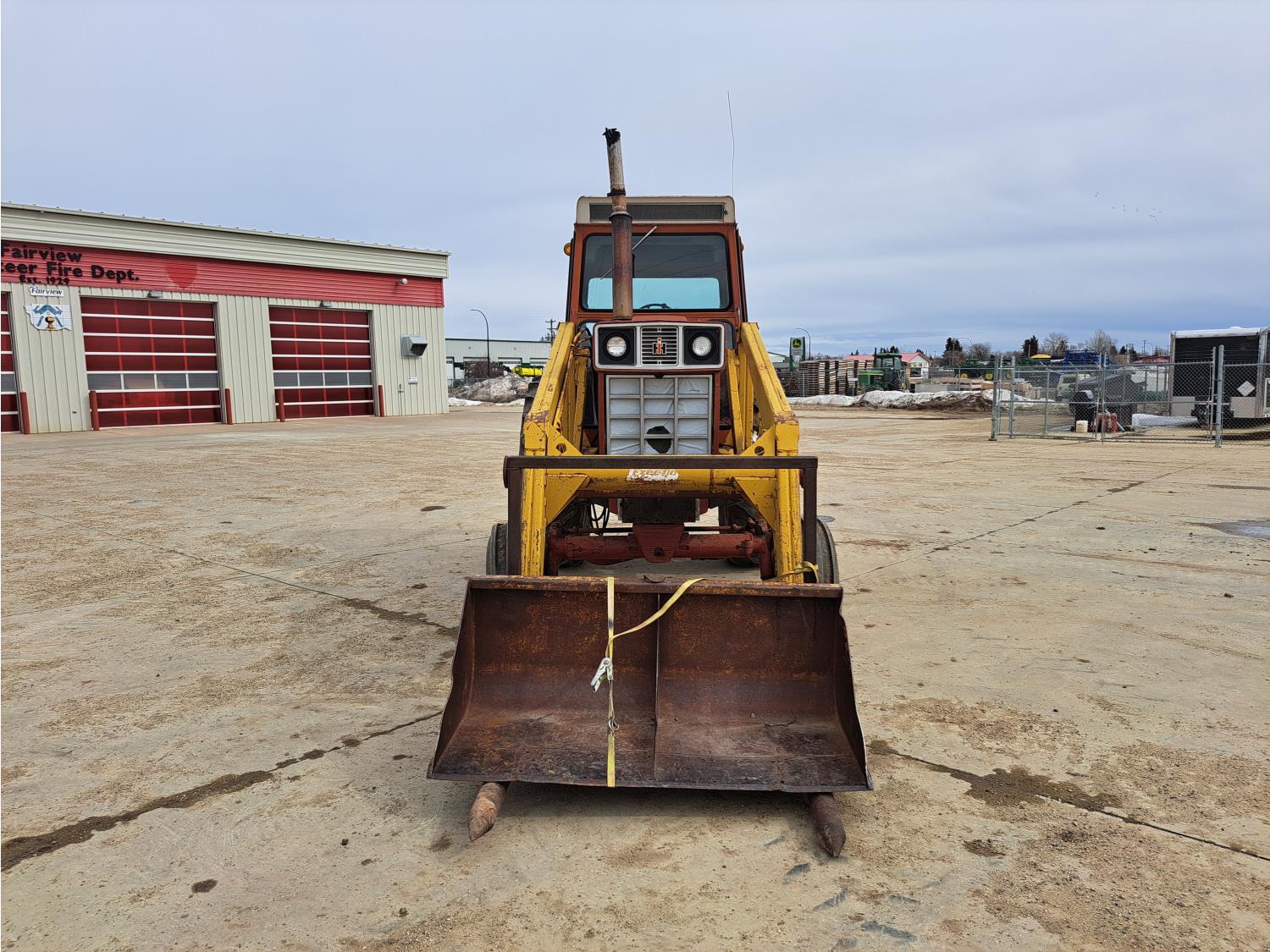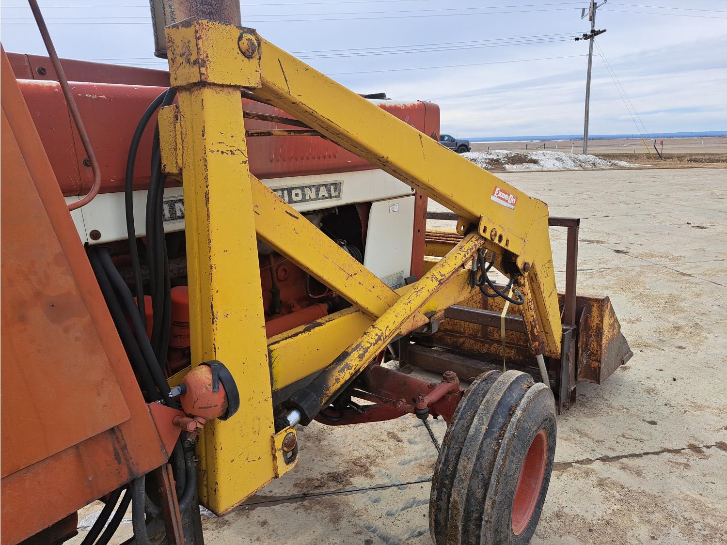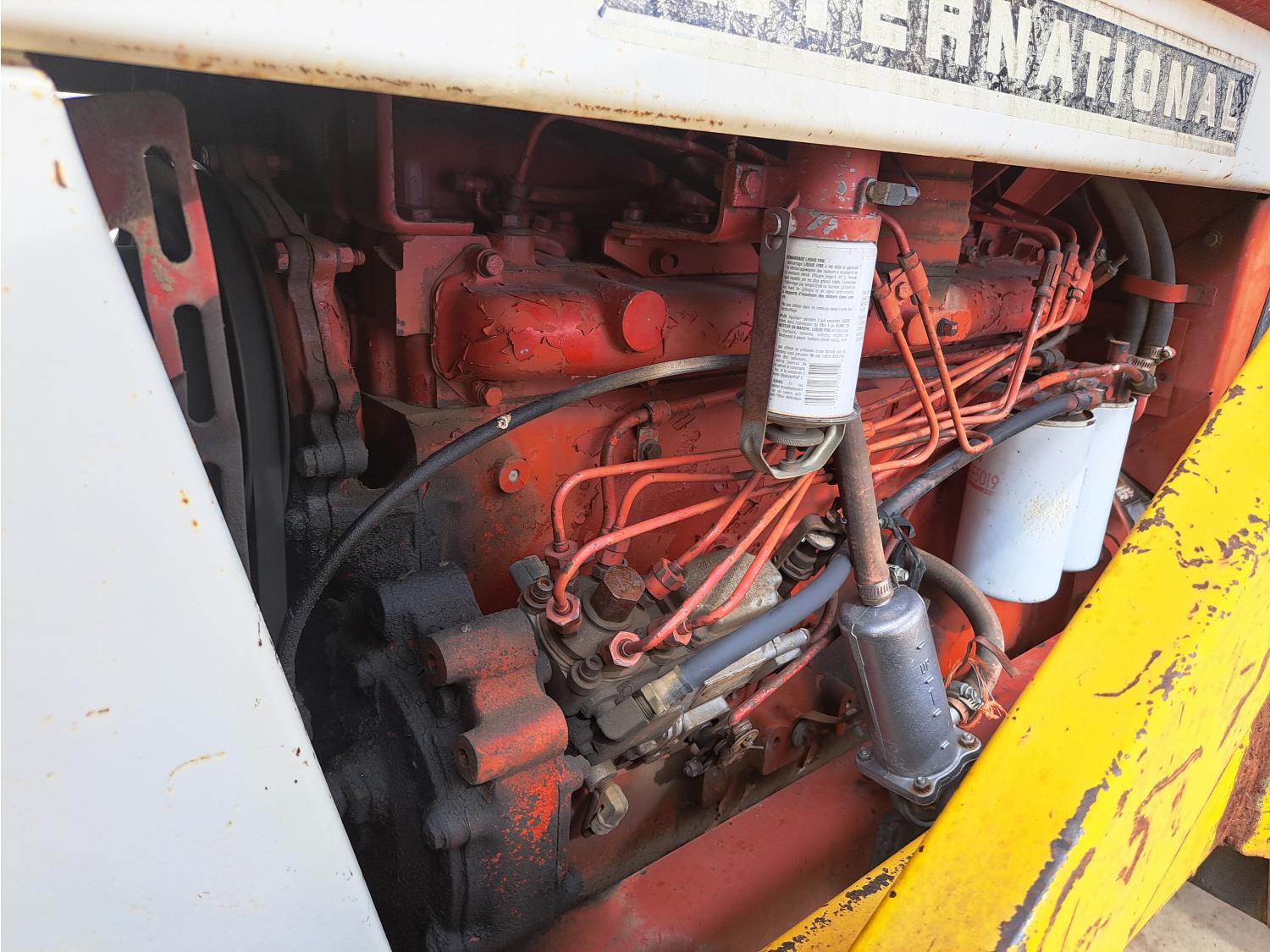 Ezee-on loader, 60 inch bucket, 48 inch bale forks,International 6.8 L 6 cylinder 140 HP, diesel engine, 126 PTO HP, 8 speed manual transmission, cab, 540/1000 PTO, 3 rear hydraulic outlets, 11L-15 front tires, 18.4-38 rear tires