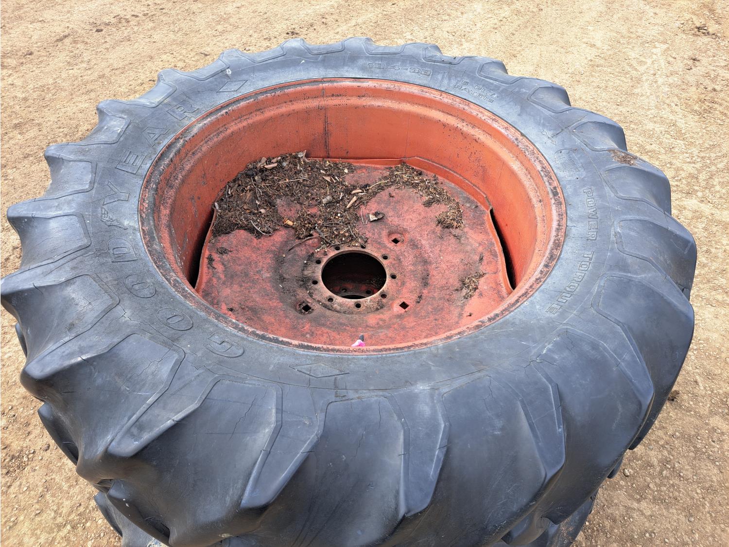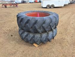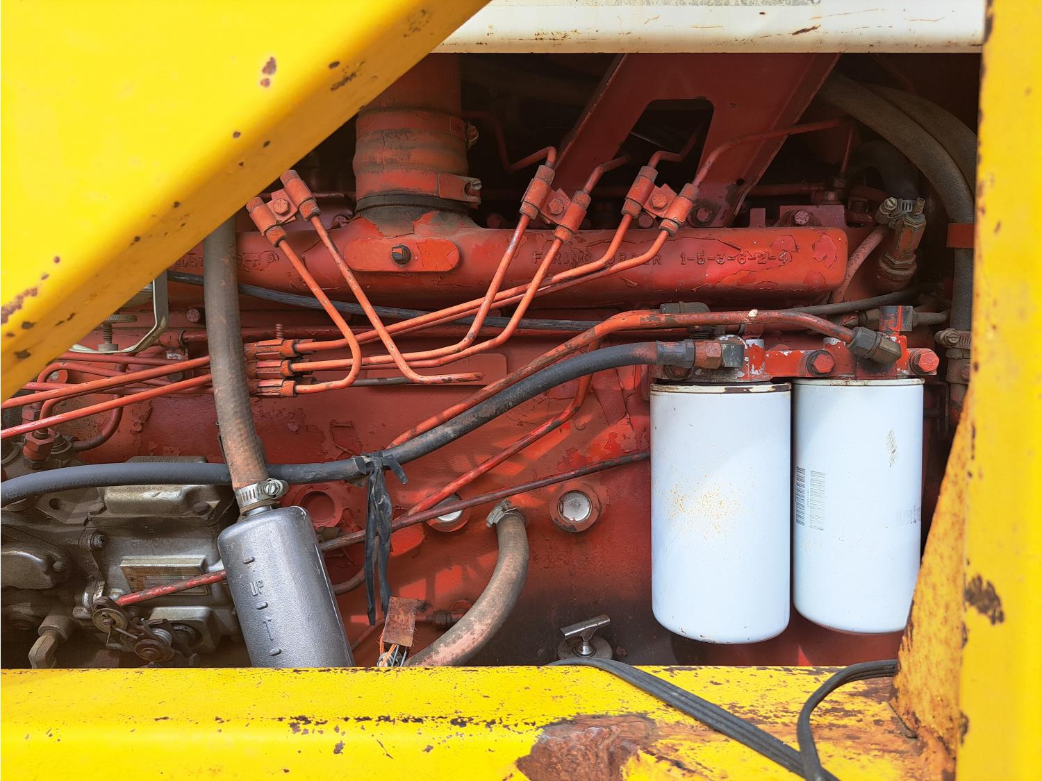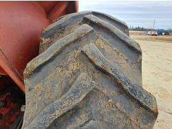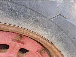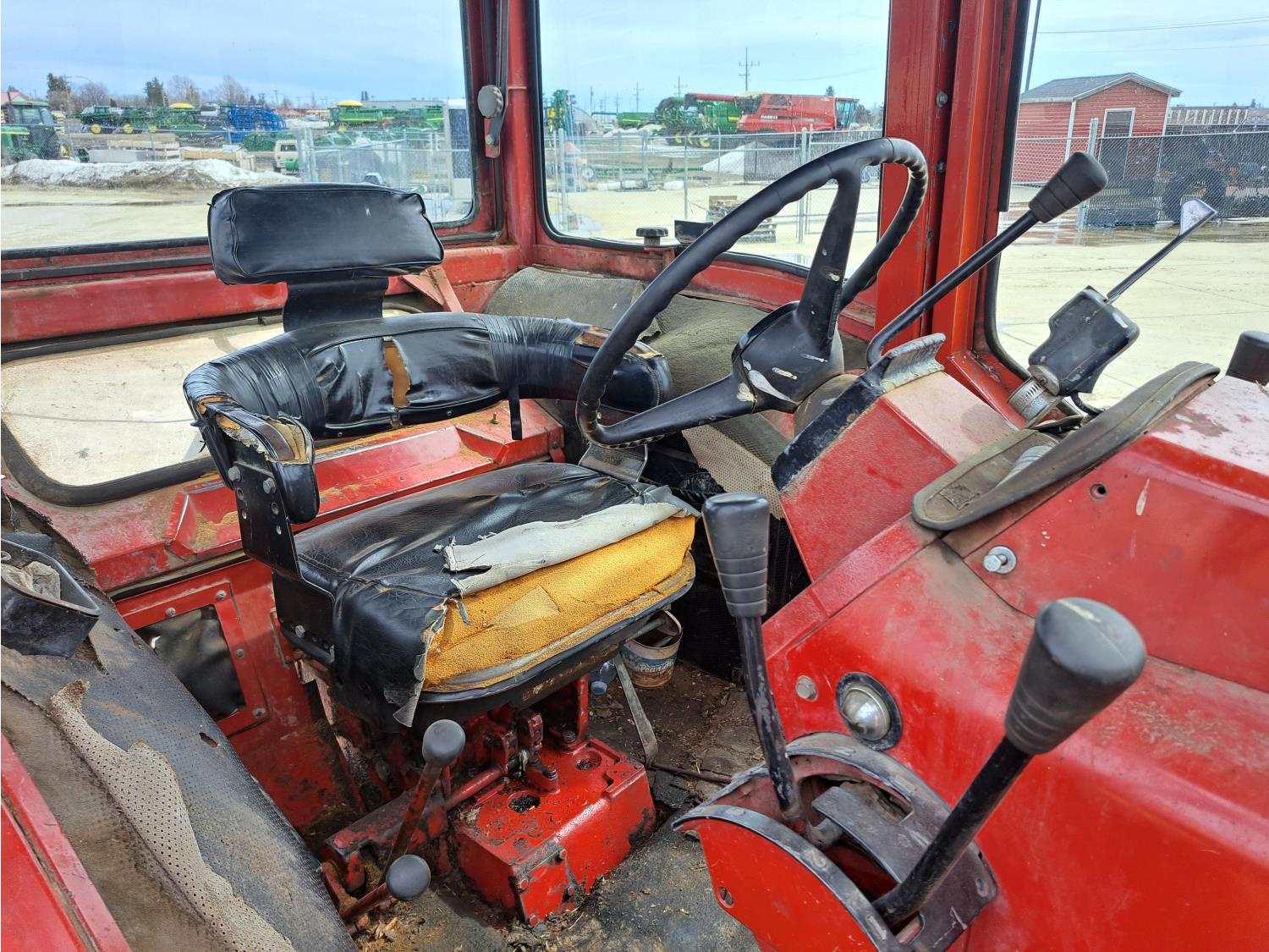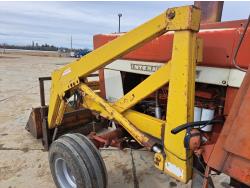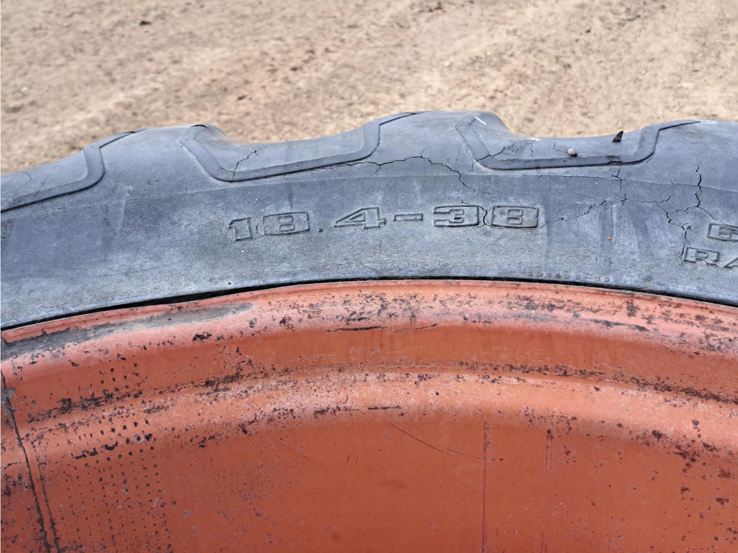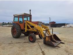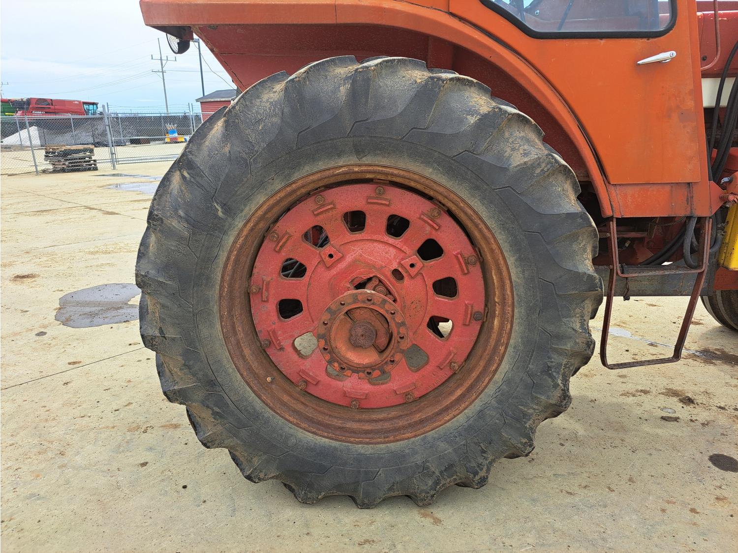 Ezee-on loader, 60 inch bucket, 48 inch bale forks,International 6.8 L 6 cylinder 140 HP, diesel engine, 126 PTO HP, 8 speed manual transmission, cab, 540/1000 PTO, 3 rear hydraulic outlets, 11L-15 front tires, 18.4-38 rear tires