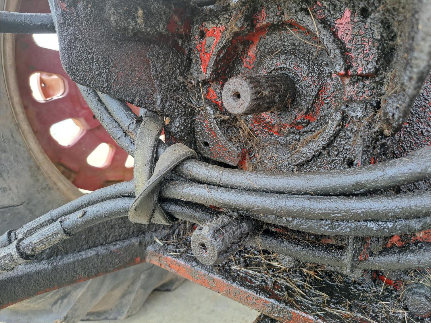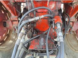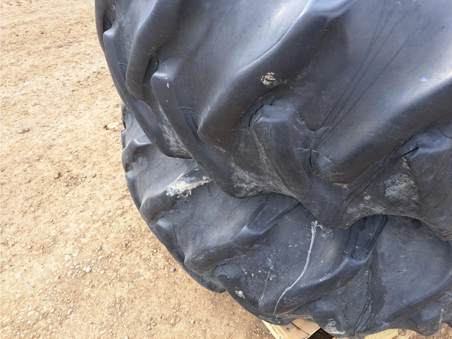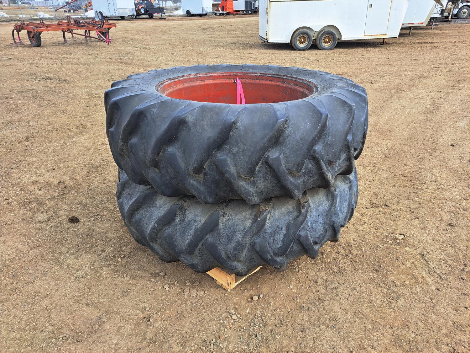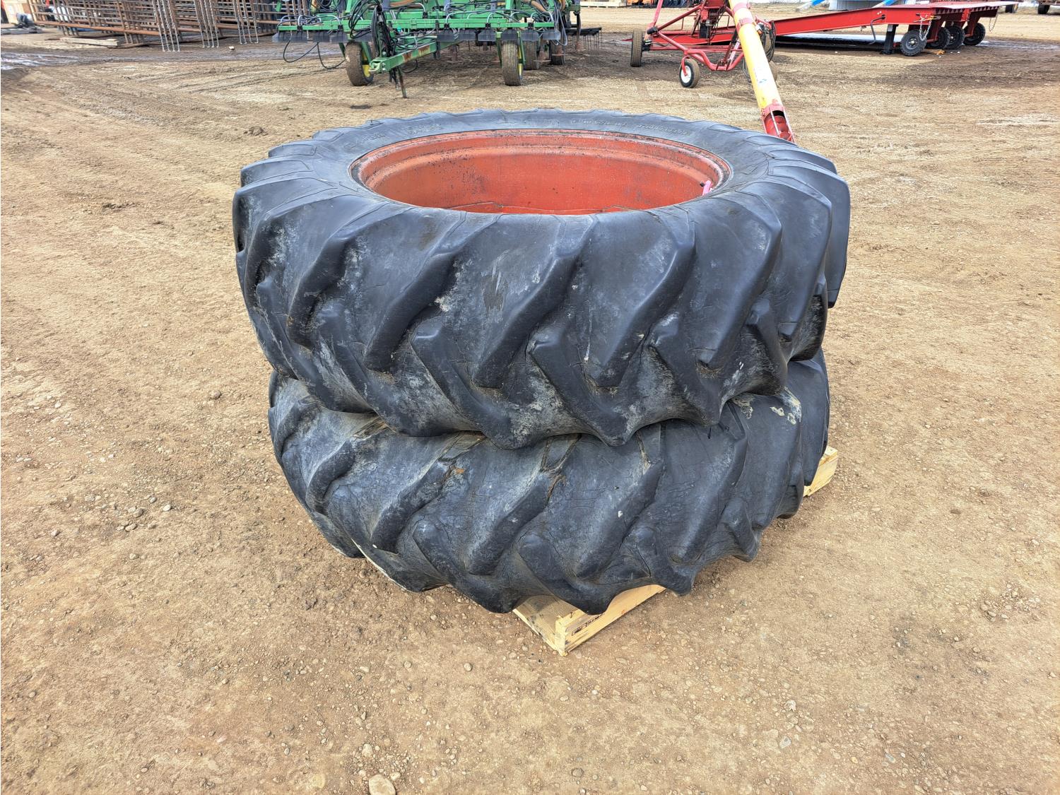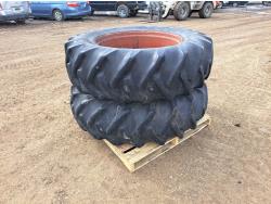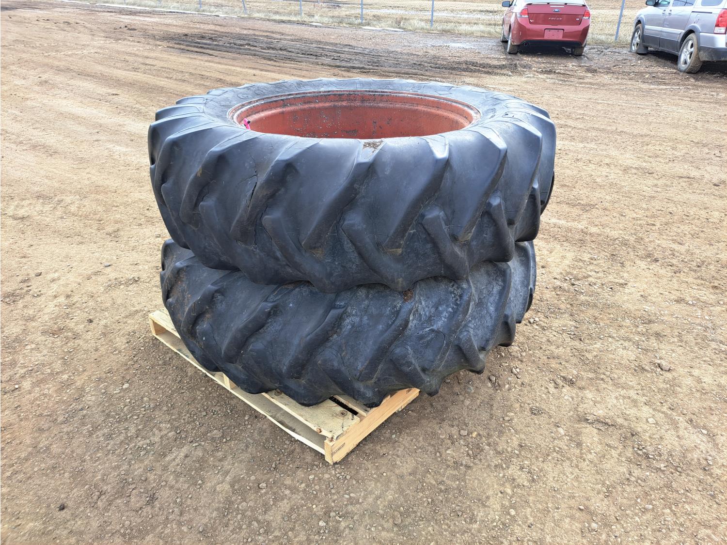 Ezee-on loader, 60 inch bucket, 48 inch bale forks,International 6.8 L 6 cylinder 140 HP, diesel engine, 126 PTO HP, 8 speed manual transmission, cab, 540/1000 PTO, 3 rear hydraulic outlets, 11L-15 front tires, 18.4-38 rear tires