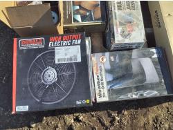 (2) electric fans, mud flaps, seat covers, tow bar, lawn mower mulching kit, Chev 2500-3500 air bag system